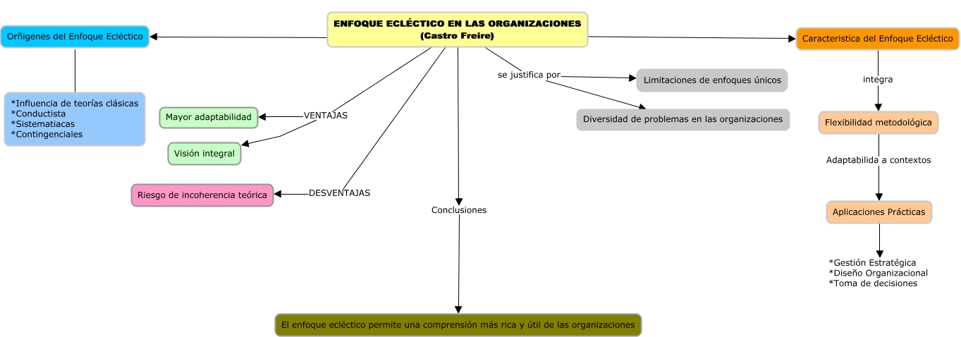 Este Cmap, tiene información relacionada con: MAPA CONCEPTUAL ENFOQUE ECLÉCTICO EN LAS ORGANIZACIONES, ENFOQUE ECLÉCTICO EN LAS ORGANIZACIONES (Castro Freire) VENTAJAS Mayor adaptabilidad, ENFOQUE ECLÉCTICO EN LAS ORGANIZACIONES (Castro Freire) Caracteristica del Enfoque Ecléctico, Orñigenes del Enfoque Ecléctico *Influencia de teorías clásicas *Conductista *Sistematiacas *Contingenciales, ENFOQUE ECLÉCTICO EN LAS ORGANIZACIONES (Castro Freire) DESVENTAJAS Riesgo de incoherencia teórica, ENFOQUE ECLÉCTICO EN LAS ORGANIZACIONES (Castro Freire) Conclusiones El enfoque ecléctico permite una comprensión más rica y útil de las organizaciones, ENFOQUE ECLÉCTICO EN LAS ORGANIZACIONES (Castro Freire) se justifica por Limitaciones de enfoques únicos, ENFOQUE ECLÉCTICO EN LAS ORGANIZACIONES (Castro Freire) ???? Orñigenes del Enfoque Ecléctico, ENFOQUE ECLÉCTICO EN LAS ORGANIZACIONES (Castro Freire) ????, Aplicaciones Prácticas *Gestión Estratégica *Diseño Organizacional *Toma de decisiones, ENFOQUE ECLÉCTICO EN LAS ORGANIZACIONES (Castro Freire) VENTAJAS Visión integral, Caracteristica del Enfoque Ecléctico integra Flexibilidad metodológica, ENFOQUE ECLÉCTICO EN LAS ORGANIZACIONES (Castro Freire) se justifica por Diversidad de problemas en las organizaciones, Flexibilidad metodológica Adaptabilida a contextos Aplicaciones Prácticas