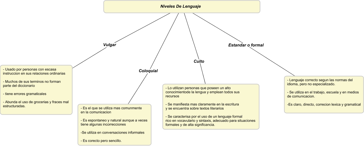 Este Cmap, tiene información relacionada con: Mapa conceptual español1, Niveles De Lenguaje Coloquial - Es el que se utiliza mas comunmente en la comunicacion - Es espontaneo y natural aunque a veces tiene algunas incorrecciones -Se utiliza en conversaciones informales - Es corecto pero sencillo., Niveles De Lenguaje Culto - Lo utilizan personas que poseen un alto conocimientode la lengua y emplean todos sus recursos - Se manifiesta mas claramente en la escritura y se encuentra sobre textos literarios - Se caracterisa por el uso de un lenguaje formal rico en vocavulario y sintaxis, adecuado para situaciones formales y de alta significancia., Niveles De Lenguaje Vulgar - Usado por personas con escasa instruccion en sus relaciones ordinarias - Muchos de sus terminos no forman parte del diccionario - tiene errores gramaticales - Abunda el uso de grocerias y fraces mal estructuradas., Niveles De Lenguaje Estandar o formal - Lenguaje correcto segun las normas del idioma, pero no especializado. - Se utiliza en el trabajo, escuela y en medios de comunicacion. -Es claro, directo, correcion lexica y gramatical