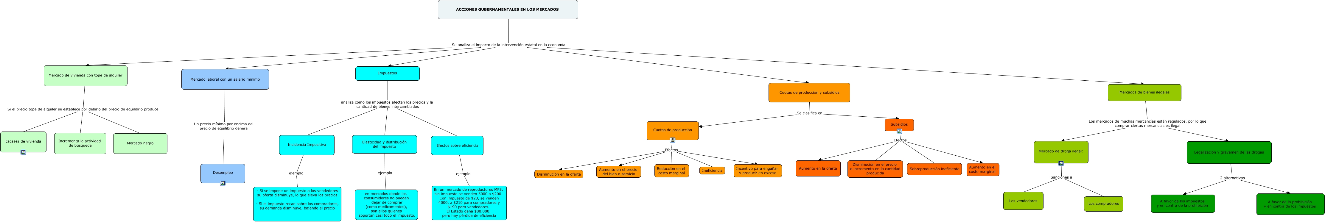 Este Cmap, tiene información relacionada con: ACCIONES GUBERNAMENTALES EN LOS MERCADOS, Cuotas de producción Efectos Disminución en la oferta, Mercado de vivienda con tope de alquiler Si el precio tope de alquiler se establece por debajo del precio de equilibrio produce Escasez de vivienda, Impuestos analiza cómo los impuestos afectan los precios y la cantidad de bienes intercambiados Elasticidad y distribución del impuesto, Legalización y gravamen de las drogas 2 alternativas A favor de la prohibición y en contra de los impuestos, Subsidios Efectos Aumento en la oferta, Cuotas de producción Efectos Reducción en el costo marginal, Cuotas de producción Efectos Incentivo para engañar y producir en exceso, Mercado de vivienda con tope de alquiler Si el precio tope de alquiler se establece por debajo del precio de equilibrio produce Mercado negro, Subsidios Efectos Disminución en el precio e incremento en la cantidad producida, Mercado de vivienda con tope de alquiler Si el precio tope de alquiler se establece por debajo del precio de equilibrio produce Incrementa la actividad de búsqueda, Efectos sobre eficiencia ejemplo En un mercado de reproductores MP3, sin impuesto se venden 5000 a $200. Con impuesto de $20, se venden 4000, a $210 para compradores y $190 para vendedores. El Estado gana $80.000, pero hay pérdida de eficiencia, Cuotas de producción Efectos Aumento en el precio del bien o servicio, ACCIONES GUBERNAMENTALES EN LOS MERCADOS Se analiza el impacto de la intervención estatal en la economía Cuotas de producción y subsidios, Mercados de bienes ilegales Los mercados de muchas mercancías están regulados, por lo que comprar ciertas mercancías es ilegal Mercado de droga ilegal:, Mercados de bienes ilegales Los mercados de muchas mercancías están regulados, por lo que comprar ciertas mercancías es ilegal Legalización y gravamen de las drogas, Elasticidad y distribución del impuesto ejemplo en mercados donde los consumidores no pueden dejar de comprar (como medicamentos), son ellos quienes soportan casi todo el impuesto., Subsidios Efectos Sobreproducción ineficiente, Mercado laboral con un salario mínimo Un precio mínimo por encima del precio de equilibrio genera Desempleo, ACCIONES GUBERNAMENTALES EN LOS MERCADOS Se analiza el impacto de la intervención estatal en la economía Impuestos, ACCIONES GUBERNAMENTALES EN LOS MERCADOS Se analiza el impacto de la intervención estatal en la economía Mercado de vivienda con tope de alquiler
