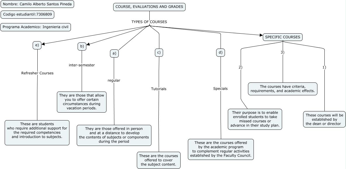 Este Cmap, tiene información relacionada con: mapa conceptual 2.0, e) Refresher Courses These are students who require additional support for the required competencies and introduction to subjects., SPECIFIC COURSES 1) These courses will be established by the dean or director, d) Specials These are the courses offered by the academic program to complement regular activities established by the Faculty Council., COURSE, EVALUATIONS AND GRADES TYPES OF COURSES b), COURSE, EVALUATIONS AND GRADES TYPES OF COURSES d), SPECIFIC COURSES 2) Their purpose is to enable enrolled students to take missed courses or advance in their study plan., COURSE, EVALUATIONS AND GRADES TYPES OF COURSES e), b) inter-semester They are those that allow you to offer certain circumstances during vacation periods., SPECIFIC COURSES 3) The courses have criteria, requirements, and academic effects., COURSE, EVALUATIONS AND GRADES TYPES OF COURSES c), a) regular They are those offered in person and at a distance to develop the contents of subjects or components during the period, COURSE, EVALUATIONS AND GRADES TYPES OF COURSES SPECIFIC COURSES, COURSE, EVALUATIONS AND GRADES TYPES OF COURSES a), c) Tutorials These are the courses offered to cover the subject content.