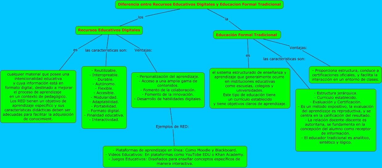 Este Cmap, tiene información relacionada con: MAPA CONCEPTUAL DIFERENCIA EN, Educación Formal Tradicional las caracteristicas son: - Estructura jerárquica. - Currículo establecido. - Evaluación y Certificación. - Es un método expositivo, la evaluación del aprendizaje es reproductiva, y se centra en la calificación del resultado. - La relación docente-discente es autoritaria, se fundamenta en la concepción del alumno como receptor de información. - El educador tradicional es analítico, sintético y lógico., - Personalización del aprendizaje. - Acceso a una amplia gama de contenidos. - Fomento de la colaboración. - Fomento de la innovación. - Desarrollo de habilidades digitales. Ejemplos de RED: - Plataformas de aprendizaje en línea: Como Moodle y Blackboard. - Videos Educativos: En plataformas como YouTobe EDU o Khan Academy. - Juegos Educativos: Diseñados para enseñar conceptos específicos de manera interactiva., Recursos Educativos Digitales es cualquier material que posee una intencionalidad educativa y cuya información está en formato digital, destinado a mejorar el proceso de aprendizaje en un contexto de pedagógico. Los RED tienen un objetivo de aprendizaje específico y sus características didácticas deben ser adecuadas para facilitar la adquisición de conocimient., Recursos Educativos Digitales las caracteristicas son: - Reutilizable. - Interopreable. - Durable. - Autónomo. - Flexible. - Accesible. - Modularidad. - Adaptabilidad. - Portabilidad. - Formato digital. - Finalidad educativa. - Interactividad., Educación Formal Tradicional Ventajas: - Proporciona estructura, conduce a certificaciones oficiales, y facilita la interacción en un entorno de clases., Recursos Educativos Digitales Ventajas: - Personalización del aprendizaje. - Acceso a una amplia gama de contenidos. - Fomento de la colaboración. - Fomento de la innovación. - Desarrollo de habilidades digitales., Diferencia entre Recursos Educativos Digitales y Educacion Formal Tradicional los Recursos Educativos Digitales, Diferencia entre Recursos Educativos Digitales y Educacion Formal Tradicional la Educación Formal Tradicional, Educación Formal Tradicional es el sistema estructurado de enseñanza y aprendizaje que generalmente ocurre en instituciones educativas como escuelas, colegios y universidades. Este tipo de educación tiene un currículo establecido y tiene objetivos claros de aprendizaje.