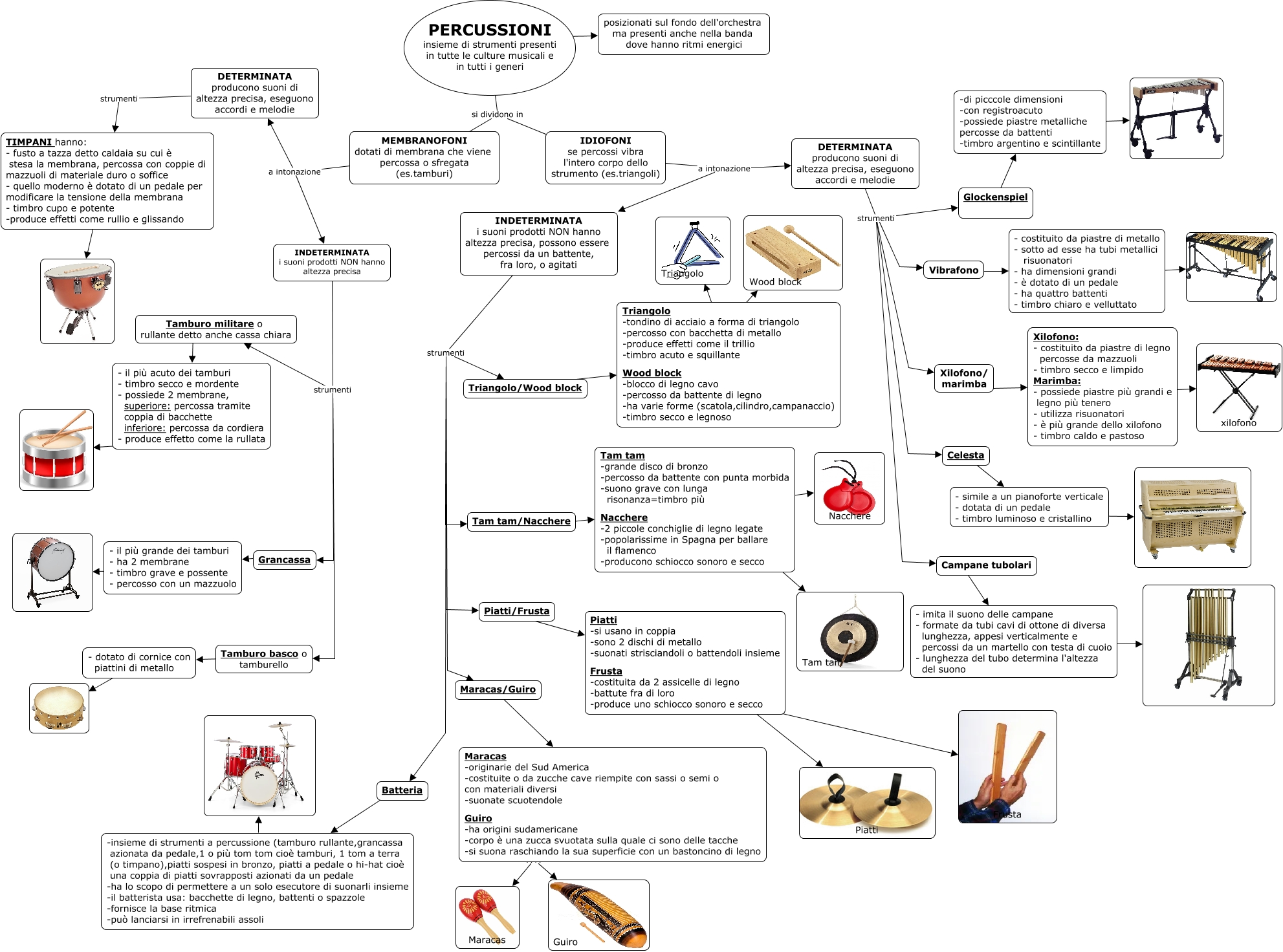 Questa Cmap, creata con IHMC CmapTools, contiene informazioni relative a: Percussioni_web, MEMBRANOFONI dotati di membrana che viene percossa o sfregata (es.tamburi) a intonazione DETERMINATA producono suoni di altezza precisa, eseguono accordi e melodie, Piatti -si usano in coppia -sono 2 dischi di metallo -suonati strisciandoli o battendoli insieme Frusta -costituita da 2 assicelle di legno -battute fra di loro -produce uno schiocco sonoro e secco ???? Piatti, Maracas/Guiro ???? Maracas -originarie del Sud America -costituite o da zucche cave riempite con sassi o semi o con materiali diversi -suonate scuotendole Guiro -ha origini sudamericane -corpo è una zucca svuotata sulla quale ci sono delle tacche -si suona raschiando la sua superficie con un bastoncino di legno, INDETERMINATA i suoni prodotti NON hanno altezza precisa, possono essere percossi da un battente, fra loro, o agitati strumenti Batteria, INDETERMINATA i suoni prodotti NON hanno altezza precisa, possono essere percossi da un battente, fra loro, o agitati strumenti Triangolo/Wood block, Tamburo militare o rullante detto anche cassa chiara ???? - il più acuto dei tamburi - timbro secco e mordente - possiede 2 membrane, superiore: percossa tramite coppia di bacchette inferiore: percossa da cordiera - produce effetto come la rullata, DETERMINATA producono suoni di altezza precisa, eseguono accordi e melodie strumenti Glockenspiel, Xilofono/ marimba ???? Xilofono: - costituito da piastre di legno percosse da mazzuoli - timbro secco e limpido Marimba: - possiede piastre più grandi e legno più tenero - utilizza risuonatori - è più grande dello xilofono - timbro caldo e pastoso, Tamburo basco o tamburello ???? - dotato di cornice con piattini di metallo, INDETERMINATA i suoni prodotti NON hanno altezza precisa, possono essere percossi da un battente, fra loro, o agitati strumenti Piatti/Frusta, IDIOFONI se percossi vibra l'intero corpo dello strumento (es.triangoli) a intonazione DETERMINATA producono suoni di altezza precisa, eseguono accordi e melodie, INDETERMINATA i suoni prodotti NON hanno altezza precisa strumenti Tamburo basco o tamburello, DETERMINATA producono suoni di altezza precisa, eseguono accordi e melodie strumenti TIMPANI hanno: - fusto a tazza detto caldaia su cui è stesa la membrana, percossa con coppie di mazzuoli di materiale duro o soffice - quello moderno è dotato di un pedale per modificare la tensione della membrana - timbro cupo e potente -produce effetti come rullio e glissando, PERCUSSIONI insieme di strumenti presenti in tutte le culture musicali e in tutti i generi si dividono in IDIOFONI se percossi vibra l'intero corpo dello strumento (es.triangoli), DETERMINATA producono suoni di altezza precisa, eseguono accordi e melodie strumenti Vibrafono, Triangolo/Wood block ???? Triangolo -tondino di acciaio a forma di triangolo -percosso con bacchetta di metallo -produce effetti come il trillio -timbro acuto e squillante Wood block -blocco di legno cavo -percosso da battente di legno -ha varie forme (scatola,cilindro,campanaccio) -timbro secco e legnoso, - simile a un pianoforte verticale - dotata di un pedale - timbro luminoso e cristallino ????, IDIOFONI se percossi vibra l'intero corpo dello strumento (es.triangoli) a intonazione INDETERMINATA i suoni prodotti NON hanno altezza precisa, possono essere percossi da un battente, fra loro, o agitati, Piatti/Frusta ???? Piatti -si usano in coppia -sono 2 dischi di metallo -suonati strisciandoli o battendoli insieme Frusta -costituita da 2 assicelle di legno -battute fra di loro -produce uno schiocco sonoro e secco, Grancassa ???? - il più grande dei tamburi - ha 2 membrane - timbro grave e possente - percosso con un mazzuolo