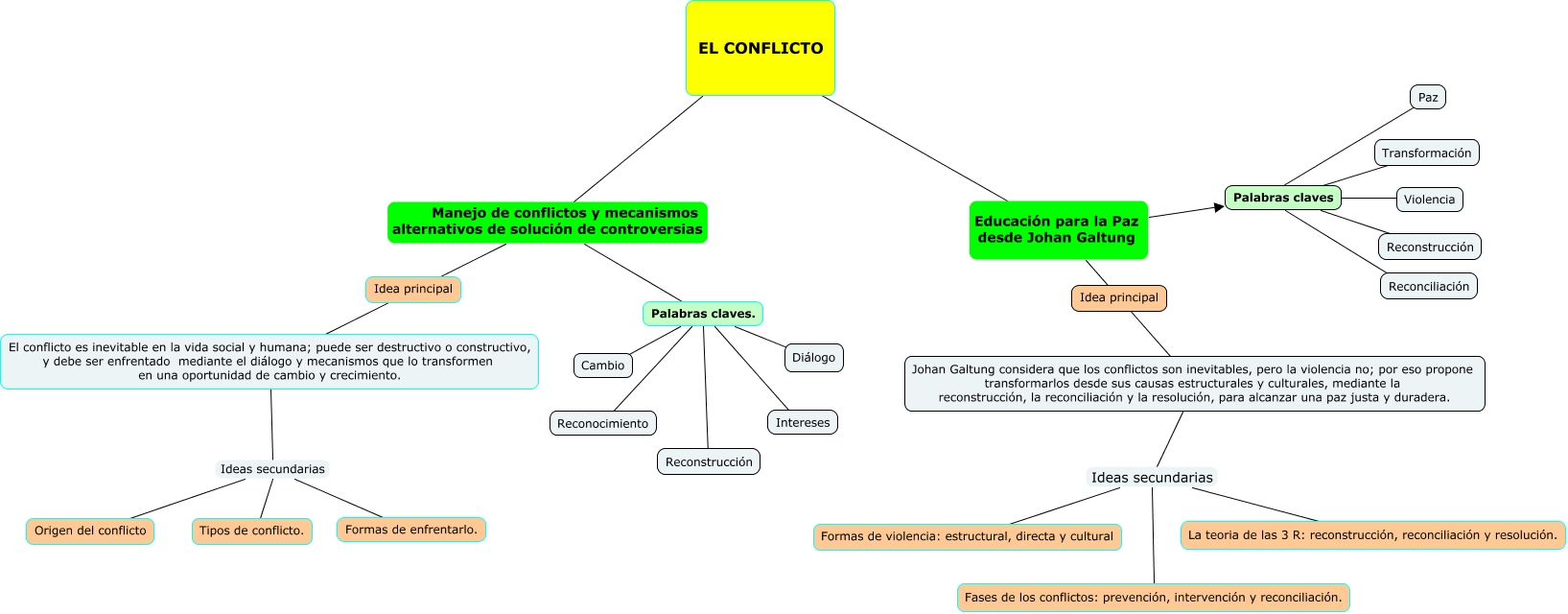Este Cmap, tiene información relacionada con: EL CONFLICTO, Tipos de conflicto. Ideas secundarias Formas de enfrentarlo., Palabras claves ???? Violencia, Palabras claves. ???? Intereses, El conflicto es inevitable en la vida social y humana; puede ser destructivo o constructivo, y debe ser enfrentado mediante el diálogo y mecanismos que lo transformen en una oportunidad de cambio y crecimiento. Ideas secundarias Origen del conflicto, Palabras claves. ???? Reconocimiento, El conflicto es inevitable en la vida social y humana; puede ser destructivo o constructivo, y debe ser enfrentado mediante el diálogo y mecanismos que lo transformen en una oportunidad de cambio y crecimiento. Ideas secundarias Formas de enfrentarlo., Palabras claves. ???? Cambio, Tipos de conflicto. Ideas secundarias Origen del conflicto, Palabras claves. ???? Diálogo, Johan Galtung considera que los conflictos son inevitables, pero la violencia no; por eso propone transformarlos desde sus causas estructurales y culturales, mediante la reconstrucción, la reconciliación y la resolución, para alcanzar una paz justa y duradera. Ideas secundarias La teoria de las 3 R: reconstrucción, reconciliación y resolución., Johan Galtung considera que los conflictos son inevitables, pero la violencia no; por eso propone transformarlos desde sus causas estructurales y culturales, mediante la reconstrucción, la reconciliación y la resolución, para alcanzar una paz justa y duradera. Educación para la Paz desde Johan Galtung ????, Johan Galtung considera que los conflictos son inevitables, pero la violencia no; por eso propone transformarlos desde sus causas estructurales y culturales, mediante la reconstrucción, la reconciliación y la resolución, para alcanzar una paz justa y duradera. Educación para la Paz desde Johan Galtung Palabras claves, Johan Galtung considera que los conflictos son inevitables, pero la violencia no; por eso propone transformarlos desde sus causas estructurales y culturales, mediante la reconstrucción, la reconciliación y la resolución, para alcanzar una paz justa y duradera. Ideas secundarias Formas de violencia: estructural, directa y cultural, Paz ???? Palabras claves, Palabras claves. Manejo de conflictos y mecanismos alternativos de solución de controversias El conflicto es inevitable en la vida social y humana; puede ser destructivo o constructivo, y debe ser enfrentado mediante el diálogo y mecanismos que lo transformen en una oportunidad de cambio y crecimiento., Palabras claves. ???? Reconstrucción, Johan Galtung considera que los conflictos son inevitables, pero la violencia no; por eso propone transformarlos desde sus causas estructurales y culturales, mediante la reconstrucción, la reconciliación y la resolución, para alcanzar una paz justa y duradera. Ideas secundarias Fases de los conflictos: prevención, intervención y reconciliación., EL CONFLICTO Manejo de conflictos y mecanismos alternativos de solución de controversias El conflicto es inevitable en la vida social y humana; puede ser destructivo o constructivo, y debe ser enfrentado mediante el diálogo y mecanismos que lo transformen en una oportunidad de cambio y crecimiento., Palabras claves ???? Transformación