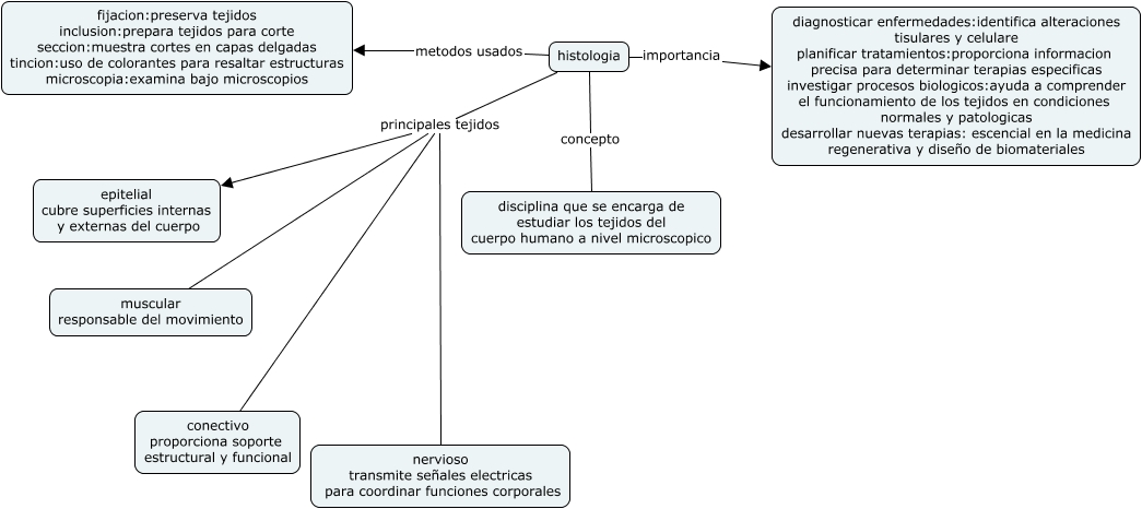 Este Cmap, tiene información relacionada con: histologia, histologia principales tejidos nervioso transmite señales electricas para coordinar funciones corporales, histologia metodos usados fijacion:preserva tejidos inclusion:prepara tejidos para corte seccion:muestra cortes en capas delgadas tincion:uso de colorantes para resaltar estructuras microscopia:examina bajo microscopios, histologia principales tejidos epitelial cubre superficies internas y externas del cuerpo, histologia principales tejidos muscular responsable del movimiento, histologia concepto disciplina que se encarga de estudiar los tejidos del cuerpo humano a nivel microscopico, histologia importancia diagnosticar enfermedades:identifica alteraciones tisulares y celulare planificar tratamientos:proporciona informacion precisa para determinar terapias especificas investigar procesos biologicos:ayuda a comprender el funcionamiento de los tejidos en condiciones normales y patologicas desarrollar nuevas terapias: escencial en la medicina regenerativa y diseño de biomateriales, histologia principales tejidos conectivo proporciona soporte estructural y funcional