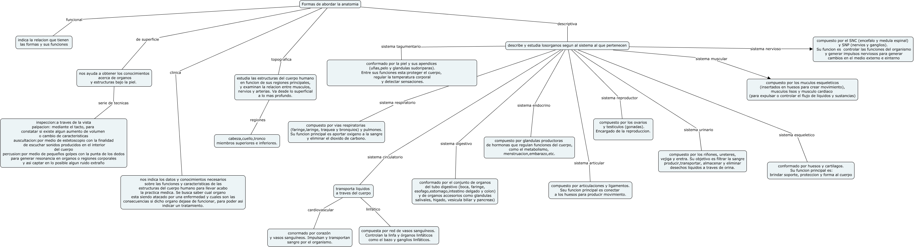 Este Cmap, tiene información relacionada con: formas de abordar anato, describe y estudia losorganos segun al sistema al que pertenecen sistema circulatorio transporta liquidos a traves del cuerpo, describe y estudia losorganos segun al sistema al que pertenecen sistema tagumentario conformado por la piel y sus apendices (uñas,pelo y glandulas sudoriparas). Entre sus funciones esta:proteger el cuerpo, regular la temperatura corporal y detectar sensaciones., nos ayuda a obtener los conocimientos acerca de organos y estructuras bajo la piel. serie de tecnicas inspeccion:a traves de la vista palpacion: mediante el tacto, para constatar si existe algun aumento de volumen o cambio de caracteristicas auscultacion:por medio de estetoscopio con la finalidad de escuchar sonidos producidos en el interior del cuerpo percusion:por medio de pequeños golpes con la punta de los dedos para generar resonancia en organos o regiones corporales y asi captar en lo posible algun ruido extraño, describe y estudia losorganos segun al sistema al que pertenecen sistema muscular compuesto por los muculos esqueleticos (insertados en huesos para crear movimiento), musculos lisos y musculo cardiaco (para expulsar o controlar el flujo de liquidos y sustancias), describe y estudia losorganos segun al sistema al que pertenecen sistema urinario compuesto por los riñones, ureteres, vejiga y eretra. Su objetivo es filtrar la sangre producir,transportar, almacenar y eliminar desechos liquidos a traves de orina., Formas de abordar la anatomia descriptiva describe y estudia losorganos segun al sistema al que pertenecen, describe y estudia losorganos segun al sistema al que pertenecen sistema esqueletico conformado por huesos y cartilagos. Su funcion principal es: brindar soporte, proteccion y forma al cuerpo, describe y estudia losorganos segun al sistema al que pertenecen sistema nervioso compuesto por el SNC (encefalo y medula espinal) y SNP (nervios y ganglios). Su funcion es controlar las funciones del organismo y generar impulsos nerviosos para generar cambios en el medio externo e einterno, describe y estudia losorganos segun al sistema al que pertenecen sistema respiratorio compuesto por vias respiratorias (faringe,laringe, traquea y bronquios) y pulmones. Su funcion principal es aportar oxigeno a la sangre y eliminar el dioxido de carbono., transporta liquidos a traves del cuerpo cardiovascular conormado por corazón y vasos sanguíneos. Impulsan y transportan sangre por el organismo., describe y estudia losorganos segun al sistema al que pertenecen sistema digestivo conformado por el conjunto de organos del tubo digestivo (boca, faringe, esofago,estomago,intestino delgado y colon) y de organos accesorios como glandulas salivales, higado, vesicula biliar y pancreas), describe y estudia losorganos segun al sistema al que pertenecen sistema endocrino compuesto por glandulas productoras de hormonas que regulan funciones del cuerpo, como el metabolismo, menstruacion,embarazo,etc., describe y estudia losorganos segun al sistema al que pertenecen sistema articular compuesto por articulaciones y ligamentos. Ssu funcion principal es conectar a los huesos para producir movimiento., estudia las estructuras del cuerpo humano en funcion de sus regiones principales, y examinan la relacion entre musculos, nervios y arterias. Va desde lo superficial a lo mas profundo. regiones cabeza,cuello,tronco miembros superiores e inferiores., Formas de abordar la anatomia funcional indica la relacion que tienen las formas y sus funciones, Formas de abordar la anatomia clinica nos indica los datos y conocimientos necesarios sobre las funciones y caracteristicas de las estructuras del cuerpo humano para llevar acabo la practica medica. Se busca saber cual organo esta siendo atacado por una enfermedad y cuales son las consecuencias si dicho organo dejase de funcionar, para poder asi indicar un tratamiento., Formas de abordar la anatomia topografica estudia las estructuras del cuerpo humano en funcion de sus regiones principales, y examinan la relacion entre musculos, nervios y arterias. Va desde lo superficial a lo mas profundo., Formas de abordar la anatomia de superficie nos ayuda a obtener los conocimientos acerca de organos y estructuras bajo la piel., describe y estudia losorganos segun al sistema al que pertenecen sistema reproductor compuesto por los ovarios y testiculos (gonadas). Encargado de la reproduccion., transporta liquidos a traves del cuerpo linfático compuesta por red de vasos sanguíneos. Controlan la linfa y órganos linfáticos como el bazo y ganglios linfáticos.