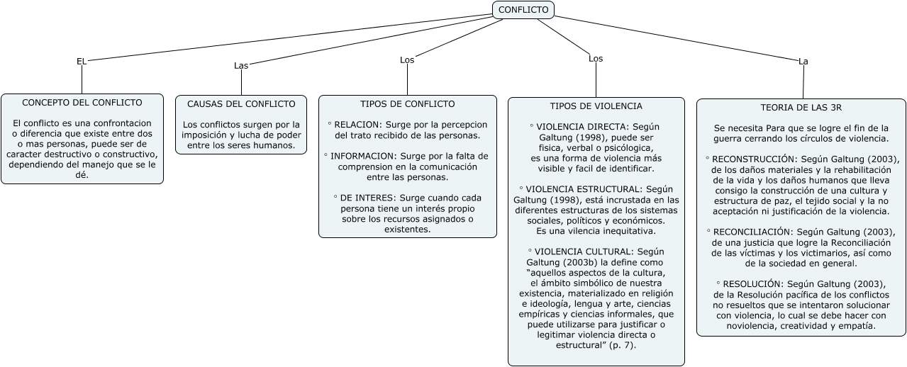 Este Cmap, tiene información relacionada con: MAPA CONCEPTUAL CONFLICTO, CONFLICTO Los TIPOS DE CONFLICTO ° RELACION: Surge por la percepcion del trato recibido de las personas. ° INFORMACION: Surge por la falta de comprension en la comunicación entre las personas. ° DE INTERES: Surge cuando cada persona tiene un interés propio sobre los recursos asignados o existentes., CONFLICTO La TEORIA DE LAS 3R Se necesita Para que se logre el fin de la guerra cerrando los círculos de violencia. ° RECONSTRUCCIÓN: Según Galtung (2003), de los daños materiales y la rehabilitación de la vida y los daños humanos que lleva consigo la construcción de una cultura y estructura de paz, el tejido social y la no aceptación ni justificación de la violencia. ° RECONCILIACIÓN: Según Galtung (2003), de una justicia que logre la Reconciliación de las víctimas y los victimarios, así como de la sociedad en general. ° RESOLUCIÓN: Según Galtung (2003), de la Resolución pacífica de los conflictos no resueltos que se intentaron solucionar con violencia, lo cual se debe hacer con noviolencia, creatividad y empatía., CONFLICTO Los TIPOS DE VIOLENCIA ° VIOLENCIA DIRECTA: Según Galtung (1998), puede ser fisica, verbal o psicólogica, es una forma de violencia más visible y facil de identificar. ° VIOLENCIA ESTRUCTURAL: Según Galtung (1998), está incrustada en las diferentes estructuras de los sistemas sociales, políticos y económicos. Es una vilencia inequitativa. ° VIOLENCIA CULTURAL: Según Galtung (2003b) la define como “aquellos aspectos de la cultura, el ámbito simbólico de nuestra existencia, materializado en religión e ideología, lengua y arte, ciencias empíricas y ciencias informales, que puede utilizarse para justificar o legitimar violencia directa o estructural” (p. 7)., CONFLICTO Las CAUSAS DEL CONFLICTO Los conflictos surgen por la imposición y lucha de poder entre los seres humanos., CONFLICTO EL CONCEPTO DEL CONFLICTO El conflicto es una confrontacion o diferencia que existe entre dos o mas personas, puede ser de caracter destructivo o constructivo, dependiendo del manejo que se le dé.