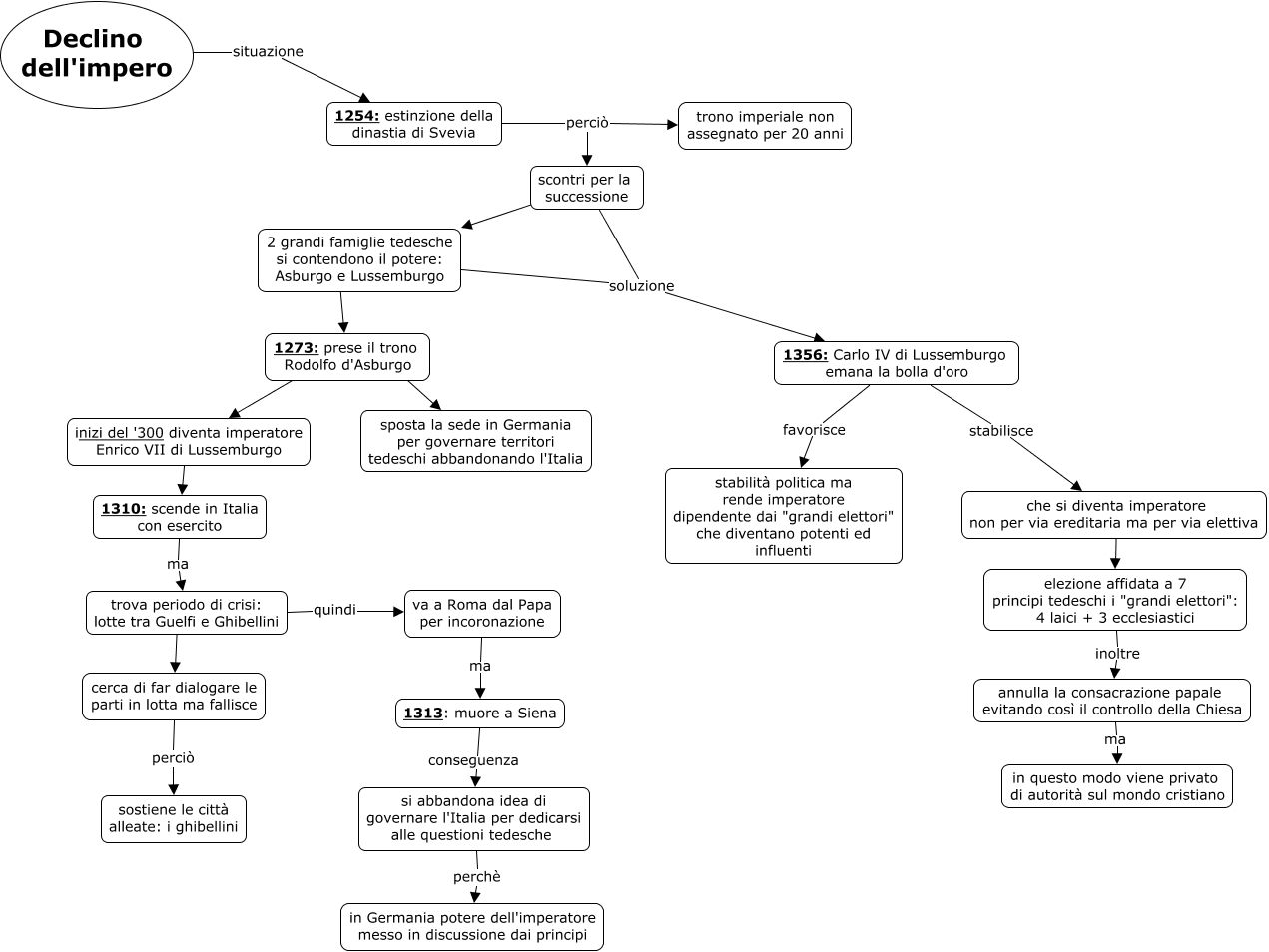 Questa Cmap, creata con IHMC CmapTools, contiene informazioni relative a: 3-Declino impero_pagg342-343, 1254: estinzione della dinastia di Svevia perciò scontri per la successione, 1313: muore a Siena conseguenza si abbandona idea di governare l'Italia per dedicarsi alle questioni tedesche, 1356: Carlo IV di Lussemburgo emana la bolla d'oro stabilisce che si diventa imperatore non per via ereditaria ma per via elettiva, trova periodo di crisi: lotte tra Guelfi e Ghibellini ??? cerca di far dialogare le parti in lotta ma fallisce, elezione affidata a 7 principi tedeschi i "grandi elettori": 4 laici + 3 ecclesiastici inoltre annulla la consacrazione papale evitando così il controllo della Chiesa, 1254: estinzione della dinastia di Svevia perciò trono imperiale non assegnato per 20 anni, Declino dell'impero situazione 1254: estinzione della dinastia di Svevia, trova periodo di crisi: lotte tra Guelfi e Ghibellini quindi va a Roma dal Papa per incoronazione, annulla la consacrazione papale evitando così il controllo della Chiesa ma in questo modo viene privato di autorità sul mondo cristiano, inizi del '300 diventa imperatore Enrico VII di Lussemburgo ???? 1310: scende in Italia con esercito, va a Roma dal Papa per incoronazione ma 1313: muore a Siena, cerca di far dialogare le parti in lotta ma fallisce perciò sostiene le città alleate: i ghibellini, 1273: prese il trono Rodolfo d'Asburgo ???? inizi del '300 diventa imperatore Enrico VII di Lussemburgo, 1273: prese il trono Rodolfo d'Asburgo ???? sposta la sede in Germania per governare territori tedeschi abbandonando l'Italia, 1310: scende in Italia con esercito ma trova periodo di crisi: lotte tra Guelfi e Ghibellini, scontri per la successione soluzione 1356: Carlo IV di Lussemburgo emana la bolla d'oro, scontri per la successione ??? 2 grandi famiglie tedesche si contendono il potere: Asburgo e Lussemburgo, che si diventa imperatore non per via ereditaria ma per via elettiva ???? elezione affidata a 7 principi tedeschi i "grandi elettori": 4 laici + 3 ecclesiastici, si abbandona idea di governare l'Italia per dedicarsi alle questioni tedesche perchè in Germania potere dell'imperatore messo in discussione dai principi, 1356: Carlo IV di Lussemburgo emana la bolla d'oro favorisce stabilità politica ma rende imperatore dipendente dai "grandi elettori" che diventano potenti ed influenti