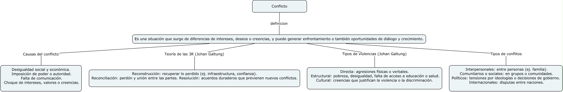 Este Cmap, tiene información relacionada con: mapa consectual de conflicto, Es una situación que surge de diferencias de intereses, deseos o creencias, y puede generar enfrentamiento o también oportunidades de diálogo y crecimiento. Causas del conflicto Desigualdad social y económica. Imposición de poder o autoridad. Falta de comunicación. Choque de intereses, valores o creencias., Es una situación que surge de diferencias de intereses, deseos o creencias, y puede generar enfrentamiento o también oportunidades de diálogo y crecimiento. Teoría de las 3R (Johan Galtung) Reconstrucción: recuperar lo perdido (ej. infraestructura, confianza). Reconciliación: perdón y unión entre las partes. Resolución: acuerdos duraderos que previenen nuevos conflictos., Es una situación que surge de diferencias de intereses, deseos o creencias, y puede generar enfrentamiento o también oportunidades de diálogo y crecimiento. Tipos de conflitos Interpersonales: entre personas (ej. familia). Comunitarios o sociales: en grupos o comunidades. Políticos: tensiones por ideologías o decisiones de gobierno. Internacionales: disputas entre naciones., Es una situación que surge de diferencias de intereses, deseos o creencias, y puede generar enfrentamiento o también oportunidades de diálogo y crecimiento. Tipos de violencias (Johan Galtung) Directa: agresiones físicas o verbales. Estructural: pobreza, desigualdad, falta de acceso a educación o salud. Cultural: creencias que justifican la violencia o la discriminación., Conflicto definicion Es una situación que surge de diferencias de intereses, deseos o creencias, y puede generar enfrentamiento o también oportunidades de diálogo y crecimiento.