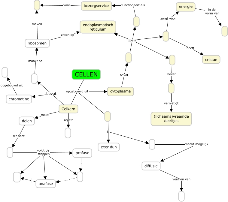 Deze Concept Map heeft informatie gerelateerd aan: Concept map Cellen - leerling invul, zoals, bevat, zoals, Celkern bevat chromatine, anafase, is zeer dun, functioneert als bezorgservice, volgt de stappen, ribosomen zitten op endoplasmatisch reticulum, volgt de stappen anafase, delen dit heet, CELLEN opgebouwd uit cytoplasma, profase, maakt mogelijk diffusie, zoals endoplasmatisch reticulum, volgt de stappen, vernietigt (lichaams)vreemde deeltjes, diffusie vormen van, maakt oa. ribosomen, zorgt voor energie