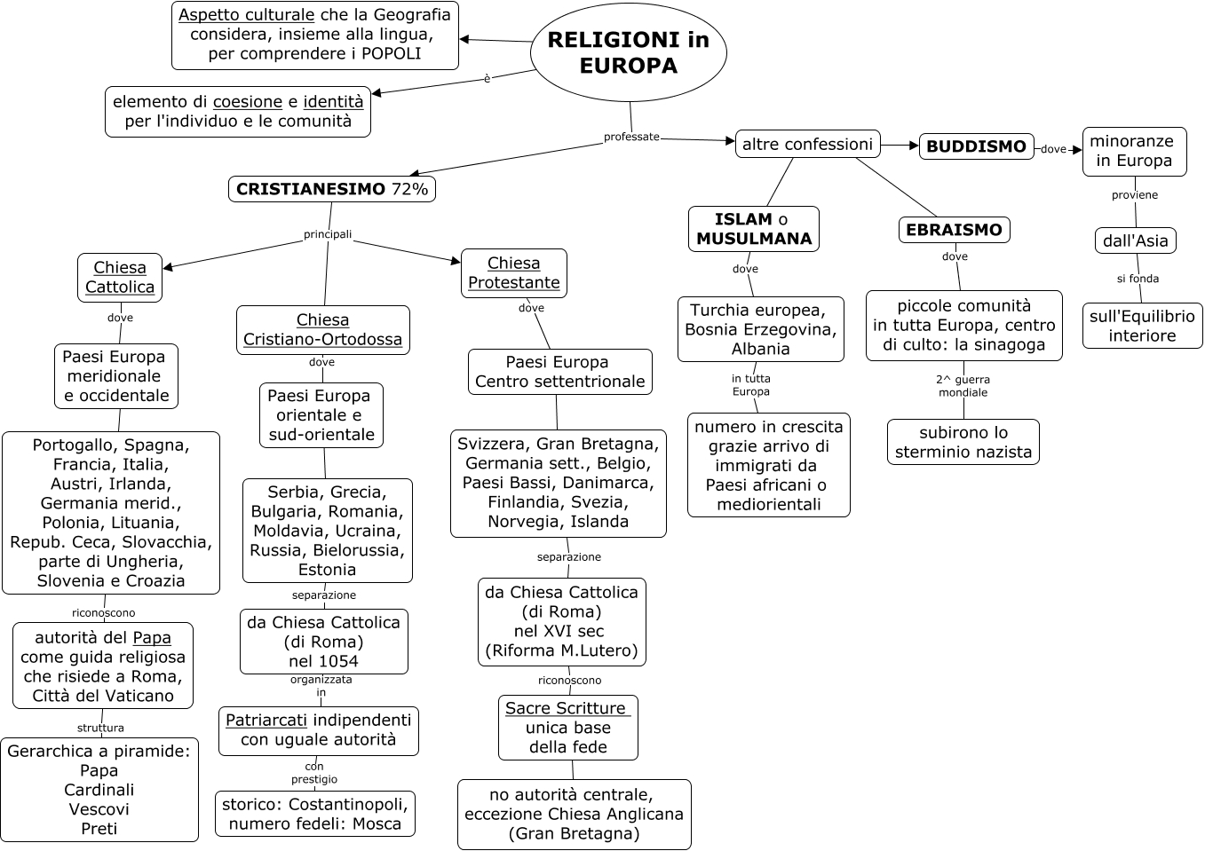 Questa Cmap, creata con IHMC CmapTools, contiene informazioni relative a: Religioni in Europa, RELIGIONI in EUROPA ???? Aspetto culturale che la Geografia considera, insieme alla lingua, per comprendere i POPOLI, Chiesa Cristiano-Ortodossa dove Paesi Europa orientale e sud-orientale, Paesi Europa Centro settentrionale ???? Svizzera, Gran Bretagna, Germania sett., Belgio, Paesi Bassi, Danimarca, Finlandia, Svezia, Norvegia, Islanda, altre confessioni ???? ISLAM o MUSULMANA, RELIGIONI in EUROPA professate CRISTIANESIMO 72%, Svizzera, Gran Bretagna, Germania sett., Belgio, Paesi Bassi, Danimarca, Finlandia, Svezia, Norvegia, Islanda separazione da Chiesa Cattolica (di Roma) nel XVI sec (Riforma M.Lutero), Patriarcati indipendenti con uguale autorità con prestigio storico: Costantinopoli, numero fedeli: Mosca, Portogallo, Spagna, Francia, Italia, Austri, Irlanda, Germania merid., Polonia, Lituania, Repub. Ceca, Slovacchia, parte di Ungheria, Slovenia e Croazia riconoscono autorità del Papa come guida religiosa che risiede a Roma, Città del Vaticano, CRISTIANESIMO 72% principali Chiesa Cattolica, piccole comunità in tutta Europa, centro di culto: la sinagoga 2^ guerra mondiale subirono lo sterminio nazista, Turchia europea, Bosnia Erzegovina, Albania in tutta Europa numero in crescita grazie arrivo di immigrati da Paesi africani o mediorientali, da Chiesa Cattolica (di Roma) nel XVI sec (Riforma M.Lutero) riconoscono Sacre Scritture unica base della fede, EBRAISMO dove piccole comunità in tutta Europa, centro di culto: la sinagoga, Chiesa Cattolica dove Paesi Europa meridionale e occidentale, Serbia, Grecia, Bulgaria, Romania, Moldavia, Ucraina, Russia, Bielorussia, Estonia separazione da Chiesa Cattolica (di Roma) nel 1054, RELIGIONI in EUROPA è elemento di coesione e identità per l'individuo e le comunità, dall'Asia si fonda sull'Equilibrio interiore, Sacre Scritture unica base della fede ??? no autorità centrale, eccezione Chiesa Anglicana (Gran Bretagna), altre confessioni ???? BUDDISMO, Paesi Europa orientale e sud-orientale ???? Serbia, Grecia, Bulgaria, Romania, Moldavia, Ucraina, Russia, Bielorussia, Estonia