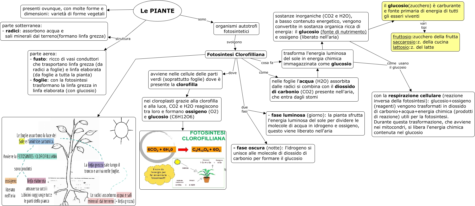 Questa Cmap, creata con IHMC CmapTools, contiene informazioni relative a: La Pianta, Fotosintesi Clorofilliana due fasi - fase oscura (notte): l'idrogeno si unisce alle molecole di diossido di carbonio per formare il glucosio, sostanze inorganiche (CO2 e H2O), a basso contenuto energetico, vengono convertite in sostanza organica ricca di energia: il glucosio (fonte di nutrimento) e ossigeno (liberato nell'aria) ???? il glucosio(zucchero) è carburante e fonte primaria di energia di tutti gli esseri viventi, Fotosintesi Clorofilliana due fasi - fase luminosa (giorno): la pianta sfrutta l'energia luminosa del sole per dividere le molecole di acqua in idrogeno e ossigeno, questo viene liberato nell'aria, Fotosintesi Clorofilliana come nelle foglie l'acqua (H2O) assorbita dalle radici si combina con il diossido di carbonio (CO2) presente nell'aria, che entra dagli stomi, Le PIANTE struttura parte sotterranea: - radici: assorbono acqua e sali minerali dal terreno(formano linfa grezza), avviene nelle cellule delle parti verdi (soprattutto foglie) dove è presente la clorofilla ???? nei cloroplasti grazie alla clorofilla e alla luce, CO2 e H2O reagiscono tra loro e formano ossigeno (O2) e glucosio (C6H12O6), Fotosintesi Clorofilliana dove avviene nelle cellule delle parti verdi (soprattutto foglie) dove è presente la clorofilla, nei cloroplasti grazie alla clorofilla e alla luce, CO2 e H2O reagiscono tra loro e formano ossigeno (O2) e glucosio (C6H12O6) ????, Fotosintesi Clorofilliana ????, Fotosintesi Clorofilliana cosa fa trasforma l'energia luminosa del sole in energia chimica immagazzinata come glucosio, sostanze inorganiche (CO2 e H2O), a basso contenuto energetico, vengono convertite in sostanza organica ricca di energia: il glucosio (fonte di nutrimento) e ossigeno (liberato nell'aria) come usano il glucosio con la respirazione cellulare (reazione inversa della fotosintesi): glucosio+ossigeno (reagenti) vengono trasformati in diossido di carbonio+acqua+energia chimica (prodotti di reazione) utili per la fotosintesi. Durante questa trasformazione, che avviene nei mitocondri, si libera l'energia chimica contenuta nel glucosio, trasforma l'energia luminosa del sole in energia chimica immagazzinata come glucosio come usano il glucosio con la respirazione cellulare (reazione inversa della fotosintesi): glucosio+ossigeno (reagenti) vengono trasformati in diossido di carbonio+acqua+energia chimica (prodotti di reazione) utili per la fotosintesi. Durante questa trasformazione, che avviene nei mitocondri, si libera l'energia chimica contenuta nel glucosio, Le PIANTE sono organismi autotrofi fotosintetici, trasforma l'energia luminosa del sole in energia chimica immagazzinata come glucosio ???? sostanze inorganiche (CO2 e H2O), a basso contenuto energetico, vengono convertite in sostanza organica ricca di energia: il glucosio (fonte di nutrimento) e ossigeno (liberato nell'aria), il glucosio(zucchero) è carburante e fonte primaria di energia di tutti gli esseri viventi vari tipi fruttosio:zucchero della frutta saccarosio:z. della cucina lattosio:z. del latte, Le PIANTE ???? presenti ovunque, con molte forme e dimensioni: varietà di forme vegetali, Le PIANTE struttura parte aerea: - fusto: ricco di vasi conduttori che trasportano linfa grezza (da radici a foglie) e linfa elaborata (da foglie a tutta la pianta) - foglie: con la fotosintesi trasformano la linfa grezza in linfa elaborata (con glucosio), organismi autotrofi fotosintetici svolgono Fotosintesi Clorofilliana, nelle foglie l'acqua (H2O) assorbita dalle radici si combina con il diossido di carbonio (CO2) presente nell'aria, che entra dagli stomi ???? trasforma l'energia luminosa del sole in energia chimica immagazzinata come glucosio