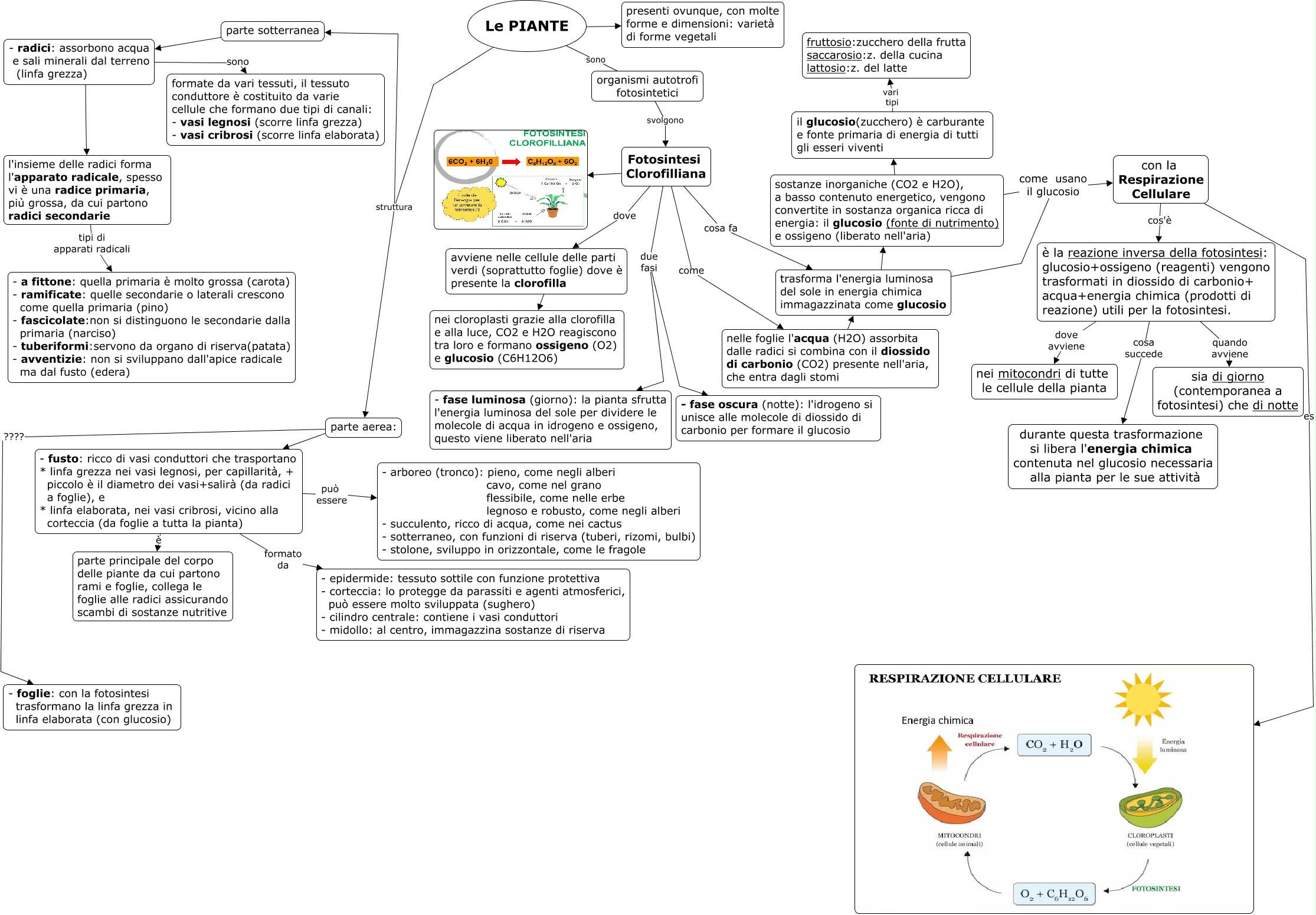 Questa Cmap, creata con IHMC CmapTools, contiene informazioni relative a: La Pianta_250925, - radici: assorbono acqua e sali minerali dal terreno (linfa grezza) sono formate da vari tessuti, il tessuto conduttore è costituito da varie cellule che formano due tipi di canali: - vasi legnosi (scorre linfa grezza) - vasi cribrosi (scorre linfa elaborata), parte sotterranea ???? - radici: assorbono acqua e sali minerali dal terreno (linfa grezza), Fotosintesi Clorofilliana come nelle foglie l'acqua (H2O) assorbita dalle radici si combina con il diossido di carbonio (CO2) presente nell'aria, che entra dagli stomi, avviene nelle cellule delle parti verdi (soprattutto foglie) dove è presente la clorofilla ???? nei cloroplasti grazie alla clorofilla e alla luce, CO2 e H2O reagiscono tra loro e formano ossigeno (O2) e glucosio (C6H12O6), - fusto: ricco di vasi conduttori che trasportano * linfa grezza nei vasi legnosi, per capillarità, + piccolo è il diametro dei vasi+salirà (da radici a foglie), e * linfa elaborata, nei vasi cribrosi, vicino alla corteccia (da foglie a tutta la pianta) è parte principale del corpo delle piante da cui partono rami e foglie, collega le foglie alle radici assicurando scambi di sostanze nutritive, Le PIANTE sono organismi autotrofi fotosintetici, l'insieme delle radici forma l'apparato radicale, spesso vi è una radice primaria, più grossa, da cui partono radici secondarie tipi di apparati radicali - a fittone: quella primaria è molto grossa (carota) - ramificate: quelle secondarie o laterali crescono come quella primaria (pino) - fascicolate:non si distinguono le secondarie dalla primaria (narciso) - tuberiformi:servono da organo di riserva(patata) - avventizie: non si sviluppano dall'apice radicale ma dal fusto (edera), trasforma l'energia luminosa del sole in energia chimica immagazzinata come glucosio come usano il glucosio con la Respirazione Cellulare, Le PIANTE struttura parte sotterranea, trasforma l'energia luminosa del sole in energia chimica immagazzinata come glucosio ???? sostanze inorganiche (CO2 e H2O), a basso contenuto energetico, vengono convertite in sostanza organica ricca di energia: il glucosio (fonte di nutrimento) e ossigeno (liberato nell'aria), Fotosintesi Clorofilliana cosa fa trasforma l'energia luminosa del sole in energia chimica immagazzinata come glucosio, - radici: assorbono acqua e sali minerali dal terreno (linfa grezza) ???? l'insieme delle radici forma l'apparato radicale, spesso vi è una radice primaria, più grossa, da cui partono radici secondarie, sostanze inorganiche (CO2 e H2O), a basso contenuto energetico, vengono convertite in sostanza organica ricca di energia: il glucosio (fonte di nutrimento) e ossigeno (liberato nell'aria) come usano il glucosio con la Respirazione Cellulare, Fotosintesi Clorofilliana dove avviene nelle cellule delle parti verdi (soprattutto foglie) dove è presente la clorofilla, parte aerea: ???? - foglie: con la fotosintesi trasformano la linfa grezza in linfa elaborata (con glucosio), Le PIANTE ???? presenti ovunque, con molte forme e dimensioni: varietà di forme vegetali, - fusto: ricco di vasi conduttori che trasportano * linfa grezza nei vasi legnosi, per capillarità, + piccolo è il diametro dei vasi+salirà (da radici a foglie), e * linfa elaborata, nei vasi cribrosi, vicino alla corteccia (da foglie a tutta la pianta) può essere - arboreo (tronco): pieno, come negli alberi cavo, come nel grano flessibile, come nelle erbe legnoso e robusto, come negli alberi - succulento, ricco di acqua, come nei cactus - sotterraneo, con funzioni di riserva (tuberi, rizomi, bulbi) - stolone, sviluppo in orizzontale, come le fragole, Fotosintesi Clorofilliana due fasi - fase luminosa (giorno): la pianta sfrutta l'energia luminosa del sole per dividere le molecole di acqua in idrogeno e ossigeno, questo viene liberato nell'aria, è la reazione inversa della fotosintesi: glucosio+ossigeno (reagenti) vengono trasformati in diossido di carbonio+ acqua+energia chimica (prodotti di reazione) utili per la fotosintesi. quando avviene sia di giorno (contemporanea a fotosintesi) che di notte, Fotosintesi Clorofilliana ????