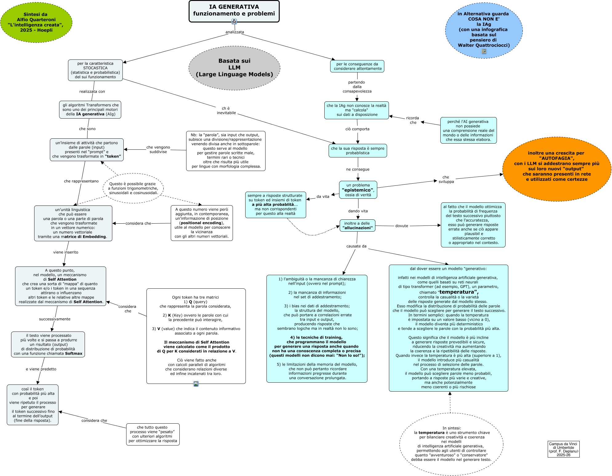 Questa Cmap, creata con IHMC CmapTools, contiene informazioni relative a: IA GENERATIVA, Questo è possibile grazie a funzioni trigonometriche, sinusoidali e cosinusoidali. un’insieme di attività che partono dalle parole (input) presenti nel “prompt” e che vengono trasformate in “token”, A questo numero viene però aggiunta, in contemporanea, un’informazione di posizione (positional encoding), utile al modello per conoscere la vicinanza con gli altri numeri vettoriali. considera che un’unità linguistica che può essere una parola o una parte di parola che vengono trasformate in un vettore numerico: un numero vettoriale tramite una matrice di Embedding., un’unità linguistica che può essere una parola o una parte di parola che vengono trasformate in un vettore numerico: un numero vettoriale tramite una matrice di Embedding. viene inserito A questo punto, nel modello, un meccanismo di Self Attention che crea una sorta di "mappa" di quanto un token e/o i token in una sequenza attirano o influenzano altri token e le relative altre mappe realizzate dal meccanismo di Self Attention., un problema "epistemico", ossia di verità da vita sempre a risposte strutturate su token ed insiemi di token a più alta probablità... ma non corrispondenti per questo alla realtà, un problema "epistemico", ossia di verità che sviluppa inoltre una crescita per "AUTOFAGIA", con i LLM si addestrano sempre più sui loro nuovi "output" che saranno presenti in rete e utilizzati come certezze, il testo viene processato più volte e si passa a produrre un risultato (output) di distribuzione di probabilità con una funzione chiamata Softmax e viene predetto così il token con probabilità più alta e poi viene ripetuto il processo per generare il token successivo fino al termine dell’output (fine della risposta)., per la caratteristica STOCASTICA (statistica e probabilistica) del sui funzionamento ch è inevitabile che la sua risposta è sempre probablistica, IA GENERATIVA funzionamento e problemi analizzata per la caratteristica STOCASTICA (statistica e probabilistica) del sui funzionamento, In sintesi: la temperatura è uno strumento chiave per bilanciare creatività e coerenza nei modelli di intelligenza artificiale generativa, permettendo agli utenti di controllare quanto "avventuroso" o "conservatore" debba essere il modello nel generare testo. dal dover essere un modello "generativo: infatti nei modelli di intelligenza artificiale generativa, come quelli basati su reti neurali di tipo transformer (ad esempio, GPT), un parametro, chiamato "temperatura", controlla la casualità o la varietà delle risposte generate dal modello stesso. Esso modifica la distribuzione di probabilità delle parole che il modello può scegliere per generare il testo successivo. In termini semplici: quando la temperatura è impostata su un valore basso (vicino a 0), il modello diventa più deterministico e tende a scegliere le parole con la probabilità più alta. Questo significa che il modello è più incline a generare risposte prevedibili e sicure, riducendo la creatività ma aumentando la coerenza e la ripetibilità delle risposte. Quando invece la temperatura è più alta (superiore a 1), il modello introduce più casualità nel processo di selezione delle parole. Con una temperatura elevata, il modello può scegliere parole meno probabili, portando a risposte più varie e creative, ma anche potenzialmente meno coerenti o più rischiose, un’insieme di attività che partono dalle parole (input) presenti nel “prompt” e che vengono trasformate in “token” che rappresentano un’unità linguistica che può essere una parola o una parte di parola che vengono trasformate in un vettore numerico: un numero vettoriale tramite una matrice di Embedding., per le conseguenze da considerare attentamente partendo dalla consapevolezza che la IAg non conosce la realtà ma "calcola" sui dati a disposizione, gli algoritmi Transformers che sono uno dei principali motori della IA generativa (AIg) che sono un’insieme di attività che partono dalle parole (input) presenti nel “prompt” e che vengono trasformate in “token”, che la sua risposta è sempre probablistica ne consegue un problema "epistemico", ossia di verità, che tutto questo processo viene “pesato” con ulteriori algoritmi per ottimizzare la risposta considera che così il token con probabilità più alta e poi viene ripetuto il processo per generare il token successivo fino al termine dell’output (fine della risposta)., IA GENERATIVA funzionamento e problemi analizzata per le conseguenze da considerare attentamente, che la IAg non conosce la realtà ma "calcola" sui dati a disposizione ciò comporta che la sua risposta è sempre probablistica, Questo è possibile grazie a funzioni trigonometriche, sinusoidali e cosinusoidali. A questo numero viene però aggiunta, in contemporanea, un’informazione di posizione (positional encoding), utile al modello per conoscere la vicinanza con gli altri numeri vettoriali., per la caratteristica STOCASTICA (statistica e probabilistica) del sui funzionamento realizzata con gli algoritmi Transformers che sono uno dei principali motori della IA generativa (AIg), inoltre a delle "allucinazioni" causate da dal dover essere un modello "generativo: infatti nei modelli di intelligenza artificiale generativa, come quelli basati su reti neurali di tipo transformer (ad esempio, GPT), un parametro, chiamato "temperatura", controlla la casualità o la varietà delle risposte generate dal modello stesso. Esso modifica la distribuzione di probabilità delle parole che il modello può scegliere per generare il testo successivo. In termini semplici: quando la temperatura è impostata su un valore basso (vicino a 0), il modello diventa più deterministico e tende a scegliere le parole con la probabilità più alta. Questo significa che il modello è più incline a generare risposte prevedibili e sicure, riducendo la creatività
