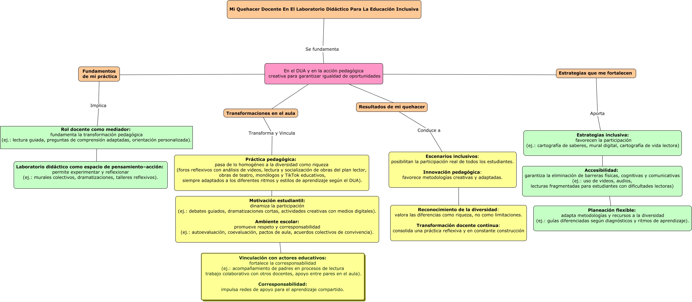 Este Cmap, tiene información relacionada con: Laboratorio Didáctico Para La Educación Inclusiva, Transformaciones en el aula Transforma y Vincula Práctica pedagógica: pasa de lo homogéneo a la diversidad como riqueza (foros reflexivos con análisis de videos, lectura y socialización de obras del plan lector, obras de teatro, monólogos y TikTok educativos, siempre adaptados a los diferentes ritmos y estilos de aprendizaje según el DUA)., Motivación estudiantil: dinamiza la participación (ej.: debates guiados, dramatizaciones cortas, actividades creativas con medios digitales). Ambiente escolar: promueve respeto y corresponsabilidad (ej.: autoevaluación, coevaluación, pactos de aula, acuerdos colectivos de convivencia). ???? Vinculación con actores educativos: fortalece la corresponsabilidad (ej.: acompañamiento de padres en procesos de lectura trabajo colaborativo con otros docentes, apoyo entre pares en el aula). Corresponsabilidad: impulsa redes de apoyo para el aprendizaje compartido., Resultados de mi quehacer Conduce a Escenarios inclusivos: posibilitan la participación real de todos los estudiantes. Innovación pedagógica: favorece metodologías creativas y adaptadas., Estrategias que me fortalecen Aporta Estrategias inclusiva: favorecen la participación (ej.: cartografía de saberes, mural digital, cartografía de vida lectora), Accesibilidad: garantiza la eliminación de barreras físicas, cognitivas y comunicativas (ej.: uso de videos, audios, lecturas fragmentadas para estudiantes con dificultades lectoras) ???? Planeación flexible: adapta metodologías y recursos a la diversidad (ej.: guías diferenciadas según diagnósticos y ritmos de aprendizaje)., Mi Quehacer Docente En El Laboratorio Didáctico Para La Educación Inclusiva Se fundamenta En el DUA y en la acción pedagógica creativa para garantizar igualdad de oportunidades, En el DUA y en la acción pedagógica creativa para garantizar igualdad de oportunidades ???? Resultados de mi quehacer, Fundamentos de mi práctica Implica Rol docente como mediador: fundamenta la transformación pedagógica (ej.: lectura guiada, preguntas de comprensión adaptadas, orientación personalizada)., En el DUA y en la acción pedagógica creativa para garantizar igualdad de oportunidades v Fundamentos de mi práctica, Rol docente como mediador: fundamenta la transformación pedagógica (ej.: lectura guiada, preguntas de comprensión adaptadas, orientación personalizada). ???? Laboratorio didáctico como espacio de pensamiento–acción: permite experimentar y reflexionar (ej.: murales colectivos, dramatizaciones, talleres reflexivos)., Estrategias inclusiva: favorecen la participación (ej.: cartografía de saberes, mural digital, cartografía de vida lectora) ???? Accesibilidad: garantiza la eliminación de barreras físicas, cognitivas y comunicativas (ej.: uso de videos, audios, lecturas fragmentadas para estudiantes con dificultades lectoras), En el DUA y en la acción pedagógica creativa para garantizar igualdad de oportunidades ???? Transformaciones en el aula, En el DUA y en la acción pedagógica creativa para garantizar igualdad de oportunidades v Estrategias que me fortalecen, Escenarios inclusivos: posibilitan la participación real de todos los estudiantes. Innovación pedagógica: favorece metodologías creativas y adaptadas. ???? Reconocimiento de la diversidad: valora las diferencias como riqueza, no como limitaciones. Transformación docente continua: consolida una práctica reflexiva y en constante construcción, Práctica pedagógica: pasa de lo homogéneo a la diversidad como riqueza (foros reflexivos con análisis de videos, lectura y socialización de obras del plan lector, obras de teatro, monólogos y TikTok educativos, siempre adaptados a los diferentes ritmos y estilos de aprendizaje según el DUA). ???? Motivación estudiantil: dinamiza la participación (ej.: debates guiados, dramatizaciones cortas, actividades creativas con medios digitales). Ambiente escolar: promueve respeto y corresponsabilidad (ej.: autoevaluación, coevaluación, pactos de aula, acuerdos colectivos de convivencia).