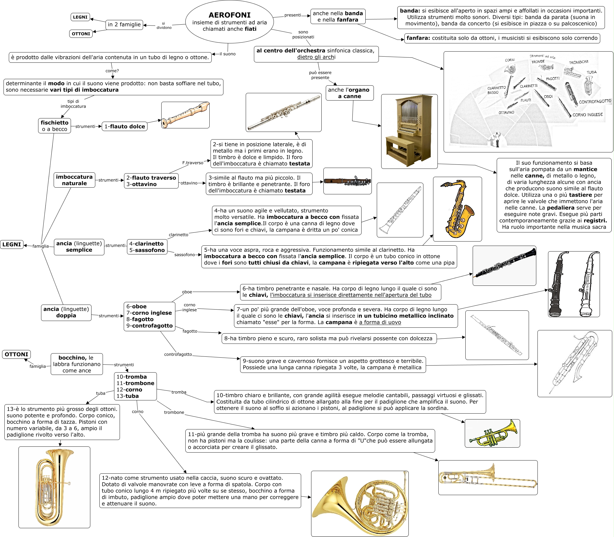 Questa Cmap, creata con IHMC CmapTools, contiene informazioni relative a: Aerofoni, ancia (linguette) doppia famiglia LEGNI, 11-più grande della tromba ha suono più grave e timbro più caldo. Corpo come la tromba, non ha pistoni ma la coulisse: una parte della canna a forma di "U"che può essere allungata o accorciata per creare il glissato. ????, imboccatura naturale famiglia LEGNI, 12-nato come strumento usato nella caccia, suono scuro e ovattato. Dotato di valvole manovrate con leve a forma di spatola. Corpo con tubo conico lungo 4 m ripiegato più volte su se stesso, bocchino a forma di imbuto, padiglione ampio dove poter mettere una mano per correggere e attenuare il suono. ????, fischietto o a becco strumenti 1-flauto dolce, ancia (linguette) semplice famiglia LEGNI, 10-tromba 11-trombone 12-corno 13-tuba tuba 13-è lo strumento più grosso degli ottoni. suono potente e profondo. Corpo conico, bocchino a forma di tazza. Pistoni con numero variabile, da 3 a 6, ampio il padiglione rivolto verso l'alto., 6-oboe 7-corno inglese 8-fagotto 9-controfagotto fagotto 8-ha timbro pieno e scuro, raro solista ma può rivelarsi possente con dolcezza, 6-oboe 7-corno inglese 8-fagotto 9-controfagotto corno inglese 7-un po' più grande dell'oboe, voce profonda e severa. Ha corpo di legno lungo il quale ci sono le chiavi, l'ancia si inserisce in un tubicino metallico inclinato chiamato "esse" per la forma. La campana è a forma di uovo, imboccatura naturale strumenti 2-flauto traverso 3-ottavino, 6-oboe 7-corno inglese 8-fagotto 9-controfagotto controfagotto 9-suono grave e cavernoso fornisce un aspetto grottesco e terribile. Possiede una lunga canna ripiegata 3 volte, la campana è metallica, ???? Il suo funzionamento si basa sull'aria pompata da un mantice nelle canne, di metallo o legno, di varia lunghezza alcune con ancia che producono suono simile al flauto dolce. Utilizza una o più tastiere per aprire le valvole che immettono l'aria nelle canne. La pedaliera serve per eseguire note gravi. Esegue più parti contemporaneamente grazie ai registri. Ha ruolo importante nella musica sacra, AEROFONI insieme di strumenti ad aria chiamati anche fiati presenti anche nella banda e nella fanfara, fischietto o a becco famiglia LEGNI, 2-flauto traverso 3-ottavino ottavino 3-simile al flauto ma più piccolo. Il timbro è brillante e penetrante. Il foro dell'imboccatura è chiamato testata, ancia (linguette) semplice strumenti 4-clarinetto 5-sassofono, in 2 famiglie ???? OTTONI, AEROFONI insieme di strumenti ad aria chiamati anche fiati si dividono in 2 famiglie, 5-ha una voce aspra, roca e aggressiva. Funzionamento simile al clarinetto. Ha imboccatura a becco con fissata l'ancia semplice. Il corpo è un tubo conico in ottone dove i fori sono tutti chiusi da chiavi, la campana è ripiegata verso l'alto come una pipa ????, 4-clarinetto 5-sassofono sassofono 5-ha una voce aspra, roca e aggressiva. Funzionamento simile al clarinetto. Ha imboccatura a becco con fissata l'ancia semplice. Il corpo è un tubo conico in ottone dove i fori sono tutti chiusi da chiavi, la campana è ripiegata verso l'alto come una pipa
