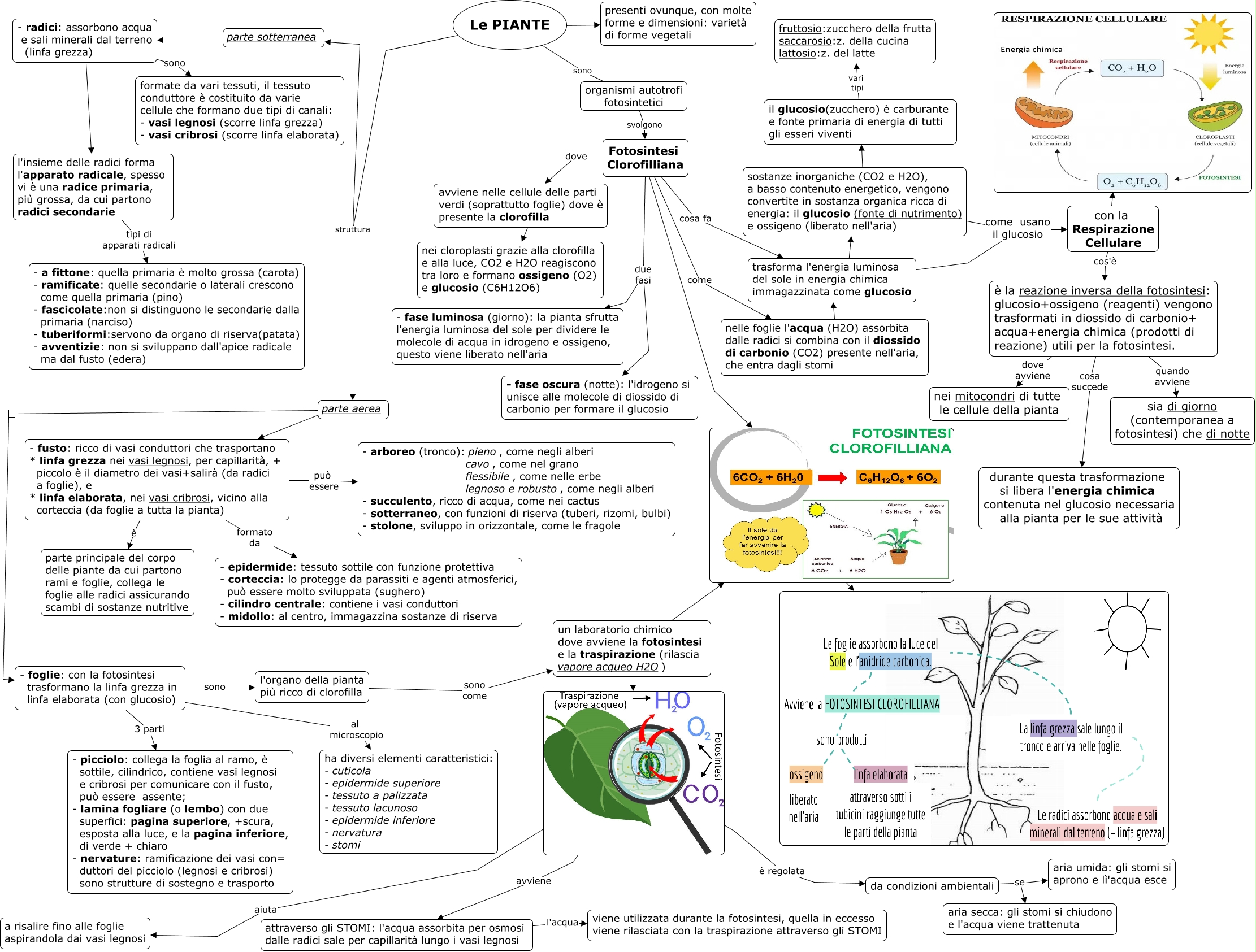 Questa Cmap, creata con IHMC CmapTools, contiene informazioni relative a: La Pianta_completo_071025, da condizioni ambientali se aria umida: gli stomi si aprono e lì'acqua esce, - foglie: con la fotosintesi trasformano la linfa grezza in linfa elaborata (con glucosio) sono l'organo della pianta più ricco di clorofilla, l'organo della pianta più ricco di clorofilla sono come un laboratorio chimico dove avviene la fotosintesi e la traspirazione (rilascia vapore acqueo H2O), - foglie: con la fotosintesi trasformano la linfa grezza in linfa elaborata (con glucosio) 3 parti - picciolo: collega la foglia al ramo, è sottile, cilindrico, contiene vasi legnosi e cribrosi per comunicare con il fusto, può essere assente; - lamina fogliare (o lembo) con due superfici: pagina superiore, +scura, esposta alla luce, e la pagina inferiore, di verde + chiaro - nervature: ramificazione dei vasi con= duttori del picciolo (legnosi e cribrosi) sono strutture di sostegno e trasporto, il glucosio(zucchero) è carburante e fonte primaria di energia di tutti gli esseri viventi vari tipi fruttosio:zucchero della frutta saccarosio:z. della cucina lattosio:z. del latte, avviene nelle cellule delle parti verdi (soprattutto foglie) dove è presente la clorofilla ???? nei cloroplasti grazie alla clorofilla e alla luce, CO2 e H2O reagiscono tra loro e formano ossigeno (O2) e glucosio (C6H12O6), un laboratorio chimico dove avviene la fotosintesi e la traspirazione (rilascia vapore acqueo H2O) ????, è regolata da condizioni ambientali, - fusto: ricco di vasi conduttori che trasportano * linfa grezza nei vasi legnosi, per capillarità, + piccolo è il diametro dei vasi+salirà (da radici a foglie), e * linfa elaborata, nei vasi cribrosi, vicino alla corteccia (da foglie a tutta la pianta) è parte principale del corpo delle piante da cui partono rami e foglie, collega le foglie alle radici assicurando scambi di sostanze nutritive, Fotosintesi Clorofilliana dove avviene nelle cellule delle parti verdi (soprattutto foglie) dove è presente la clorofilla, nelle foglie l'acqua (H2O) assorbita dalle radici si combina con il diossido di carbonio (CO2) presente nell'aria, che entra dagli stomi ???? trasforma l'energia luminosa del sole in energia chimica immagazzinata come glucosio, attraverso gli STOMI: l'acqua assorbita per osmosi dalle radici sale per capillarità lungo i vasi legnosi l'acqua viene utilizzata durante la fotosintesi, quella in eccesso viene rilasciata con la traspirazione attraverso gli STOMI, sostanze inorganiche (CO2 e H2O), a basso contenuto energetico, vengono convertite in sostanza organica ricca di energia: il glucosio (fonte di nutrimento) e ossigeno (liberato nell'aria) ???? il glucosio(zucchero) è carburante e fonte primaria di energia di tutti gli esseri viventi, - foglie: con la fotosintesi trasformano la linfa grezza in linfa elaborata (con glucosio) al microscopio ha diversi elementi caratteristici: - cuticola - epidermide superiore - tessuto a palizzata - tessuto lacunoso - epidermide inferiore - nervatura - stomi, aiuta a risalire fino alle foglie aspirandola dai vasi legnosi, ????, parte aerea ? - foglie: con la fotosintesi trasformano la linfa grezza in linfa elaborata (con glucosio), è la reazione inversa della fotosintesi: glucosio+ossigeno (reagenti) vengono trasformati in diossido di carbonio+ acqua+energia chimica (prodotti di reazione) utili per la fotosintesi. dove avviene nei mitocondri di tutte le cellule della pianta, trasforma l'energia luminosa del sole in energia chimica immagazzinata come glucosio ???? sostanze inorganiche (CO2 e H2O), a basso contenuto energetico, vengono convertite in sostanza organica ricca di energia: il glucosio (fonte di nutrimento) e ossigeno (liberato nell'aria), Fotosintesi Clorofilliana due fasi - fase oscura (notte): l'idrogeno si unisce alle molecole di diossido di carbonio per formare il glucosio
