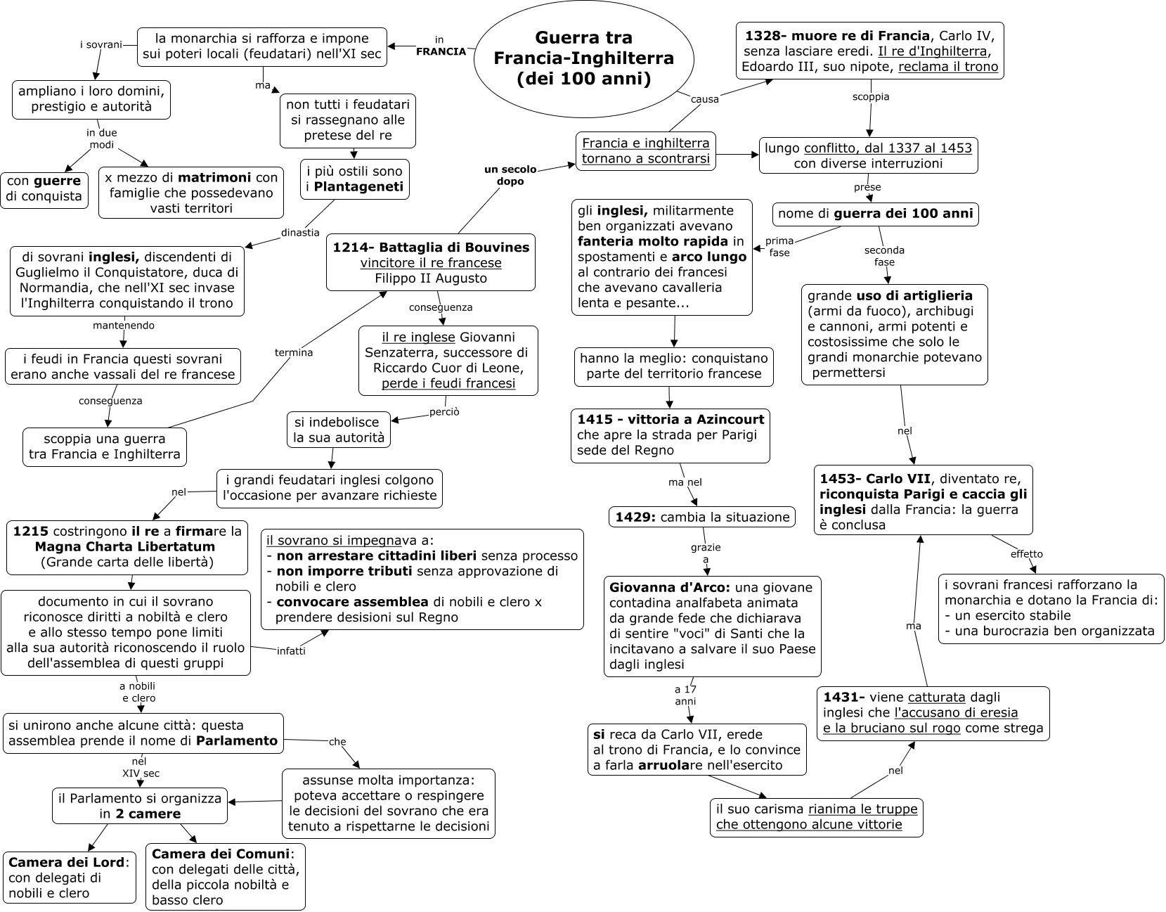 Questa Cmap, creata con IHMC CmapTools, contiene informazioni relative a: Guerra 100 anni, gli inglesi, militarmente ben organizzati avevano fanteria molto rapida in spostamenti e arco lungo al contrario dei francesi che avevano cavalleria lenta e pesante... ???? hanno la meglio: conquistano parte del territorio francese, Guerra tra Francia-Inghilterra (dei 100 anni) causa 1328- muore re di Francia, Carlo IV, senza lasciare eredi. Il re d'Inghilterra, Edoardo III, suo nipote, reclama il trono, grande uso di artiglieria (armi da fuoco), archibugi e cannoni, armi potenti e costosissime che solo le grandi monarchie potevano permettersi nel 1453- Carlo VII, diventato re, riconquista Parigi e caccia gli inglesi dalla Francia: la guerra è conclusa, nome di guerra dei 100 anni seconda fase grande uso di artiglieria (armi da fuoco), archibugi e cannoni, armi potenti e costosissime che solo le grandi monarchie potevano permettersi, Giovanna d'Arco: una giovane contadina analfabeta animata da grande fede che dichiarava di sentire "voci" di Santi che la incitavano a salvare il suo Paese dagli inglesi a 17 anni si reca da Carlo VII, erede al trono di Francia, e lo convince a farla arruolare nell'esercito, assunse molta importanza: poteva accettare o respingere le decisioni del sovrano che era tenuto a rispettarne le decisioni ???? il Parlamento si organizza in 2 camere, nome di guerra dei 100 anni prima fase gli inglesi, militarmente ben organizzati avevano fanteria molto rapida in spostamenti e arco lungo al contrario dei francesi che avevano cavalleria lenta e pesante..., Francia e inghilterra tornano a scontrarsi ???? lungo conflitto, dal 1337 al 1453 con diverse interruzioni, 1431- viene catturata dagli inglesi che l'accusano di eresia e la bruciano sul rogo come strega ma 1453- Carlo VII, diventato re, riconquista Parigi e caccia gli inglesi dalla Francia: la guerra è conclusa, la monarchia si rafforza e impone sui poteri locali (feudatari) nell'XI sec ma non tutti i feudatari si rassegnano alle pretese del re, i feudi in Francia questi sovrani erano anche vassali del re francese conseguenza scoppia una guerra tra Francia e Inghilterra, si reca da Carlo VII, erede al trono di Francia, e lo convince a farla arruolare nell'esercito ???? il suo carisma rianima le truppe che ottengono alcune vittorie, il re inglese Giovanni Senzaterra, successore di Riccardo Cuor di Leone, perde i feudi francesi perciò si indebolisce la sua autorità, Guerra tra Francia-Inghilterra (dei 100 anni) in FRANCIA la monarchia si rafforza e impone sui poteri locali (feudatari) nell'XI sec, 1453- Carlo VII, diventato re, riconquista Parigi e caccia gli inglesi dalla Francia: la guerra è conclusa effetto i sovrani francesi rafforzano la monarchia e dotano la Francia di: - un esercito stabile - una burocrazia ben organizzata, 1415 - vittoria a Azincourt che apre la strada per Parigi sede del Regno ma nel 1429: cambia la situazione, si unirono anche alcune città: questa assemblea prende il nome di Parlamento nel XIV sec il Parlamento si organizza in 2 camere, non tutti i feudatari si rassegnano alle pretese del re ???? i più ostili sono i Plantageneti, i grandi feudatari inglesi colgono l'occasione per avanzare richieste nel 1215 costringono il re a firmare la Magna Charta Libertatum (Grande carta delle libertà), 1429: cambia la situazione grazie a Giovanna d'Arco: una giovane contadina analfabeta animata da grande fede che dichiarava di sentire "voci" di Santi che la incitavano a salvare il suo Paese dagli inglesi