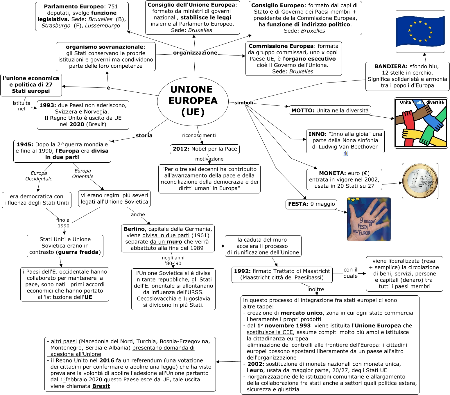Questa Cmap, creata con IHMC CmapTools, contiene informazioni relative a: Unione Europea, MOTTO: Unita nella diversità ????, UNIONE EUROPEA (UE) organizzazione Consiglio Europeo: formato dai capi di Stato e di Governo dei Paesi membri + presidente della Commissione Europea, ha funzione di indirizzo politico. Sede: Bruxelles, BANDIERA: sfondo blu, 12 stelle in cerchio. Significa solidarietà e armonia tra i popoli d'Europa simboli INNO: "Inno alla gioia" una parte della Nona sinfonia di Ludwig Van Beethoven, UNIONE EUROPEA (UE) simboli FESTA: 9 maggio, BANDIERA: sfondo blu, 12 stelle in cerchio. Significa solidarietà e armonia tra i popoli d'Europa simboli MOTTO: Unita nella diversità, BANDIERA: sfondo blu, 12 stelle in cerchio. Significa solidarietà e armonia tra i popoli d'Europa ????, Berlino, capitale della Germania, viene divisa in due parti (1961) separate da un muro che verrà abbattuto alla fine del 1989 ???? la caduta del muro accelera il processo di riunificazione dell'Unione, UNIONE EUROPEA (UE) simboli MOTTO: Unita nella diversità, in questo processo di integrazione fra stati europei ci sono altre tappe: - creazione di mercato unico, zona in cui ogni stato commercia liberamente i propri prodotti - dal 1° novembre 1993 viene istituita l'Unione Europea che sostituisce la CEE, assume compiti molto più ampi e istituisce la cittadinanza europea - eliminazione dei controlli alle frontiere dell'Europa: i cittadini europei possono spostarsi liberamente da un paese all'altro dell'organizzazione - 2002: sostituzione di monete nazionali con moneta unica, l'euro, usata da maggior parte, 20/27, degli Stati UE - riorganizzazione delle istituzioni comunitarie e allargamento della collaborazione fra stati anche a settori quali politica estera, sicurezza e giustizia ???? - altri paesi (Macedonia del Nord, Turchia, Bosnia-Erzegovina, Montenegro, Serbia e Albania) presentano domanda di adesione all'Unione - il Regno Unito nel 2016 fa un referendum (una votazione dei cittadini per confermare o abolire una legge) che ha visto prevalere la volontà di abolire l'adesione all'Unione pertanto dal 1°febbraio 2020 questo Paese esce da UE, tale uscita viene chiamata Brexit, era democratica con i fluenza degli Stati Uniti fino al 1990 Stati Uniti e Unione Sovietica erano in contrasto (guerra fredda), organismo sovranazionale: gli Stati conservano le proprie istituzioni e governi ma condividono parte delle loro competenze organizzazione Consiglio Europeo: formato dai capi di Stato e di Governo dei Paesi membri + presidente della Commissione Europea, ha funzione di indirizzo politico. Sede: Bruxelles, vi erano regimi più severi legati all'Unione Sovietica fino al 1990 Stati Uniti e Unione Sovietica erano in contrasto (guerra fredda), UNIONE EUROPEA (UE) simboli INNO: "Inno alla gioia" una parte della Nona sinfonia di Ludwig Van Beethoven, 1992: firmato Trattato di Maastricht (Maastricht città dei Paesibassi) inoltre in questo processo di integrazione fra stati europei ci sono altre tappe: - creazione di mercato unico, zona in cui ogni stato commercia liberamente i propri prodotti - dal 1° novembre 1993 viene istituita l'Unione Europea che sostituisce la CEE, assume compiti molto più ampi e istituisce la cittadinanza europea - eliminazione dei controlli alle frontiere dell'Europa: i cittadini europei possono spostarsi liberamente da un paese all'altro dell'organizzazione - 2002: sostituzione di monete nazionali con moneta unica, l'euro, usata da maggior parte, 20/27, degli Stati UE - riorganizzazione delle istituzioni comunitarie e allargamento della collaborazione fra stati anche a settori quali politica estera, sicurezza e giustizia, UNIONE EUROPEA (UE) è organismo sovranazionale: gli Stati conservano le proprie istituzioni e governi ma condividono parte delle loro competenze, UNIONE EUROPEA (UE) storia 1945: Dopo la 2^guerra mondiale e fino al 1990, l'Europa era divisa in due parti, UNIONE EUROPEA (UE) simboli MONETA: euro (€) entrata in vigore nel 2002, usata in 20 Stati su 27, 1945: Dopo la 2^guerra mondiale e fino al 1990, l'Europa era divisa in due parti Europa Orientale vi erano regimi più severi legati all'Unione Sovietica, 2012: Nobel per la Pace motivazione "Per oltre sei decenni ha contribuito all'avanzamento della pace e della riconciliazione della democrazia e dei diritti umani in Europa", BANDIERA: sfondo blu, 12 stelle in cerchio. Significa solidarietà e armonia tra i popoli d'Europa simboli FESTA: 9 maggio