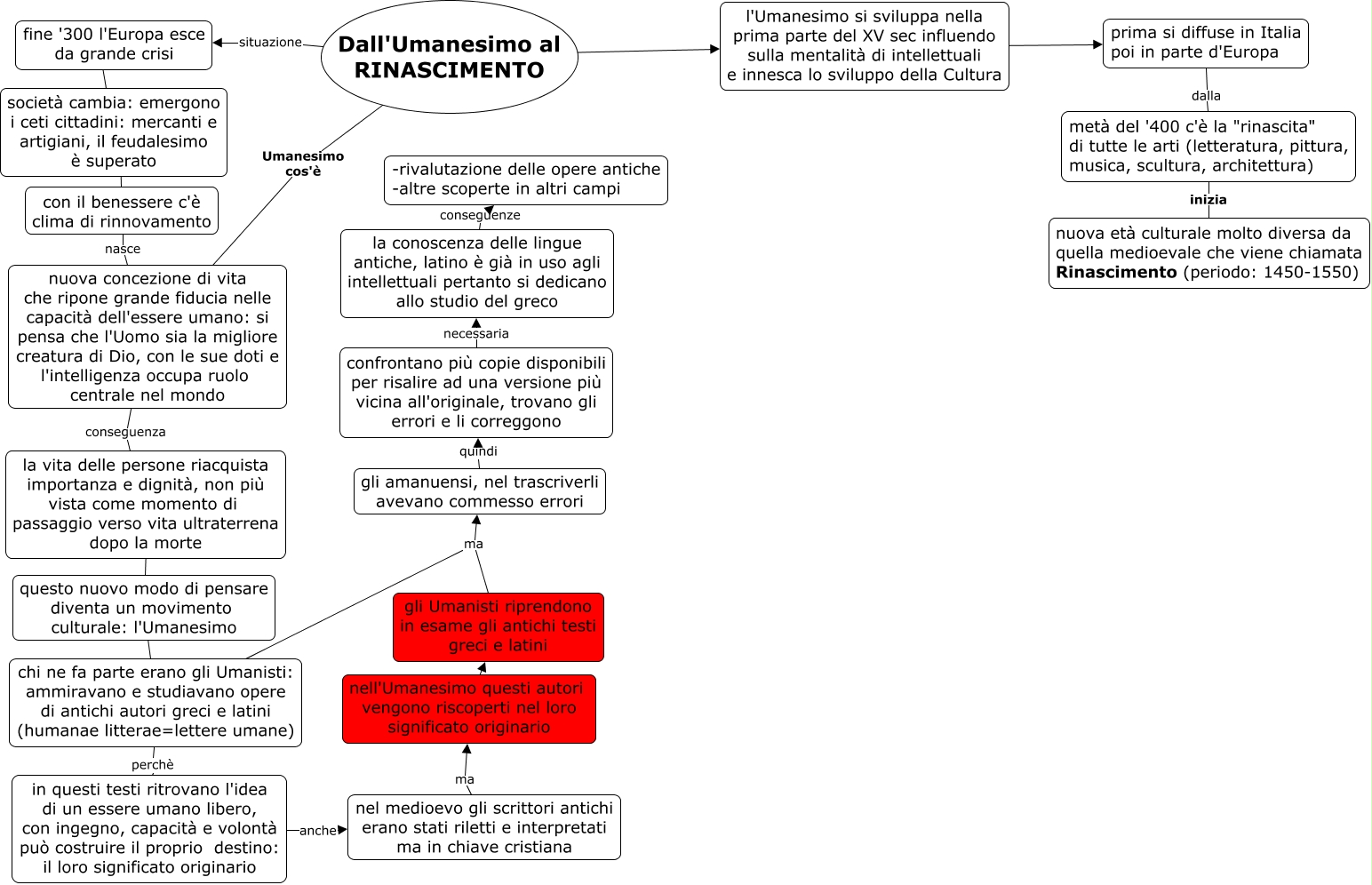 Questa Cmap, creata con IHMC CmapTools, contiene informazioni relative a: Il RINASCIMENTO, questo nuovo modo di pensare diventa un movimento culturale: l'Umanesimo ???? chi ne fa parte erano gli Umanisti: ammiravano e studiavano opere di antichi autori greci e latini (humanae litterae=lettere umane), gli Umanisti riprendono in esame gli antichi testi greci e latini ma gli amanuensi, nel trascriverli avevano commesso errori, l'Umanesimo si sviluppa nella prima parte del XV sec influendo sulla mentalità di intellettuali e innesca lo sviluppo della Cultura ???? prima si diffuse in Italia poi in parte d'Europa, nell'Umanesimo questi autori vengono riscoperti nel loro significato originario ???? gli Umanisti riprendono in esame gli antichi testi greci e latini, la conoscenza delle lingue antiche, latino è già in uso agli intellettuali pertanto si dedicano allo studio del greco conseguenze -rivalutazione delle opere antiche -altre scoperte in altri campi, chi ne fa parte erano gli Umanisti: ammiravano e studiavano opere di antichi autori greci e latini (humanae litterae=lettere umane) ma gli amanuensi, nel trascriverli avevano commesso errori, nuova concezione di vita che ripone grande fiducia nelle capacità dell'essere umano: si pensa che l'Uomo sia la migliore creatura di Dio, con le sue doti e l'intelligenza occupa ruolo centrale nel mondo conseguenza la vita delle persone riacquista importanza e dignità, non più vista come momento di passaggio verso vita ultraterrena dopo la morte, Dall'Umanesimo al RINASCIMENTO Umanesimo cos'è nuova concezione di vita che ripone grande fiducia nelle capacità dell'essere umano: si pensa che l'Uomo sia la migliore creatura di Dio, con le sue doti e l'intelligenza occupa ruolo centrale nel mondo, Dall'Umanesimo al RINASCIMENTO situazione fine '300 l'Europa esce da grande crisi, con il benessere c'è clima di rinnovamento nasce nuova concezione di vita che ripone grande fiducia nelle capacità dell'essere umano: si pensa che l'Uomo sia la migliore creatura di Dio, con le sue doti e l'intelligenza occupa ruolo centrale nel mondo, chi ne fa parte erano gli Umanisti: ammiravano e studiavano opere di antichi autori greci e latini (humanae litterae=lettere umane) perchè in questi testi ritrovano l'idea di un essere umano libero, con ingegno, capacità e volontà può costruire il proprio destino: il loro significato originario, nel medioevo gli scrittori antichi erano stati riletti e interpretati ma in chiave cristiana ma nell'Umanesimo questi autori vengono riscoperti nel loro significato originario, gli amanuensi, nel trascriverli avevano commesso errori quindi confrontano più copie disponibili per risalire ad una versione più vicina all'originale, trovano gli errori e li correggono, confrontano più copie disponibili per risalire ad una versione più vicina all'originale, trovano gli errori e li correggono necessaria la conoscenza delle lingue antiche, latino è già in uso agli intellettuali pertanto si dedicano allo studio del greco, fine '300 l'Europa esce da grande crisi ???? società cambia: emergono i ceti cittadini: mercanti e artigiani, il feudalesimo è superato, prima si diffuse in Italia poi in parte d'Europa dalla metà del '400 c'è la "rinascita" di tutte le arti (letteratura, pittura, musica, scultura, architettura), la vita delle persone riacquista importanza e dignità, non più vista come momento di passaggio verso vita ultraterrena dopo la morte ???? questo nuovo modo di pensare diventa un movimento culturale: l'Umanesimo, società cambia: emergono i ceti cittadini: mercanti e artigiani, il feudalesimo è superato ???? con il benessere c'è clima di rinnovamento, in questi testi ritrovano l'idea di un essere umano libero, con ingegno, capacità e volontà può costruire il proprio destino: il loro significato originario anche nel medioevo gli scrittori antichi erano stati riletti e interpretati ma in chiave cristiana, Dall'Umanesimo al RINASCIMENTO ???? l'Umanesimo si sviluppa nella prima parte del XV sec influendo sulla mentalità di intellettuali e innesca lo sviluppo della Cultura