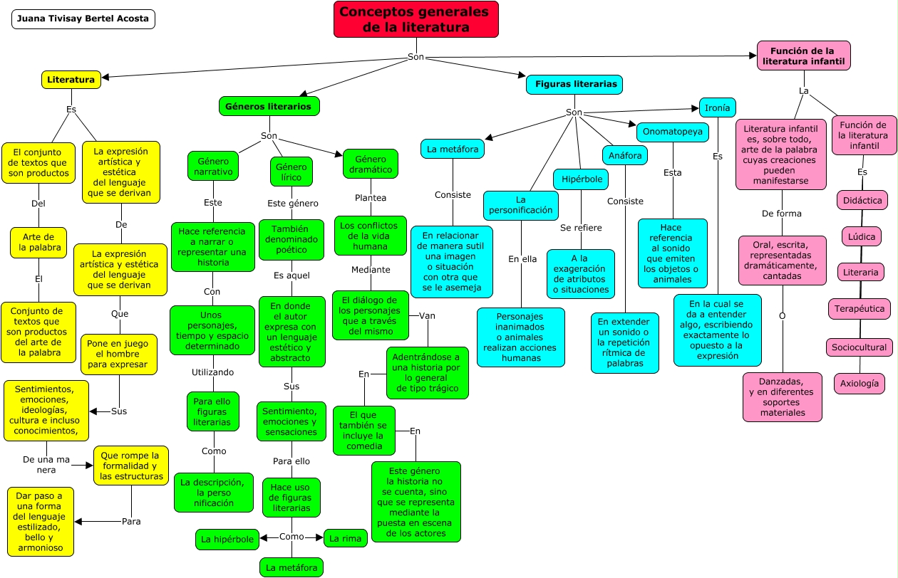 Este Cmap, tiene información relacionada con: Conceptos generales de la literatura, Arte de la palabra El Conjunto de textos que son productos del arte de la palabra, La metáfora Consiste En relacionar de manera sutil una imagen o situación con otra que se le asemeja, Figuras literarias Son Onomatopeya, Que rompe la formalidad y las estructuras Para Dar paso a una forma del lenguaje estilizado, bello y armonioso, Figuras literarias Son La metáfora, Unos personajes, tiempo y espacio determinado Utilizando Para ello figuras literarias, El conjunto de textos que son productos Del Arte de la palabra, Conceptos generales de la literatura Son Literatura, Función de la literatura infantil Es Terapéutica, Género lírico Este género También denominado poético, Género narrativo Este Hace referencia a narrar o representar una historia, Hace referencia a narrar o representar una historia Con Unos personajes, tiempo y espacio determinado, Los conflictos de la vida humana Mediante El diálogo de los personajes que a través del mismo, Función de la literatura infantil Es Axiología, Anáfora Consiste En extender un sonido o la repetición rítmica de palabras, La expresión artística y estética del lenguaje que se derivan De La expresión artística y estética del lenguaje que se derivan, Adentrándose a una historia por lo general de tipo trágico En El que también se incluye la comedia, Hace uso de figuras literarias Como La metáfora, Función de la literatura infantil Es Lúdica, También denominado poético Es aquel En donde el autor expresa con un lenguaje estético y abstracto