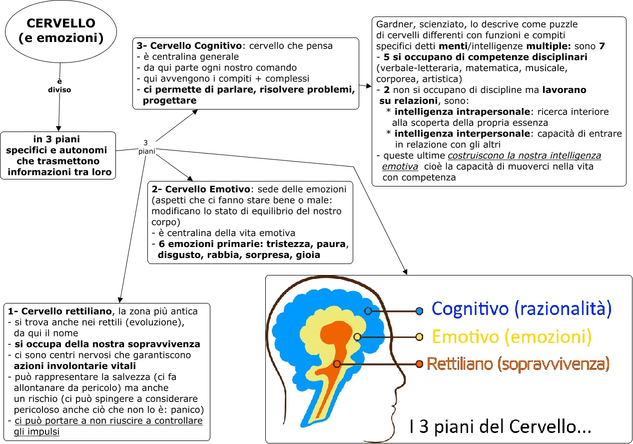 Questa Cmap, creata con IHMC CmapTools, contiene informazioni relative a: CERVELLO e emozioni, 3- Cervello Cognitivo: cervello che pensa - è centralina generale - da qui parte ogni nostro comando - qui avvengono i compiti + complessi - ci permette di parlare, risolvere problemi, progettare ???? Gardner, scienziato, lo descrive come puzzle di cervelli differenti con funzioni e compiti specifici detti menti/intelligenze multiple: sono 7 - 5 si occupano di competenze disciplinari (verbale-letteraria, matematica, musicale, corporea, artistica) - 2 non si occupano di discipline ma lavorano su relazioni, sono: * intelligenza intrapersonale: ricerca interiore alla scoperta della propria essenza * intelligenza interpersonale: capacità di entrare in relazione con gli altri - queste ultime costruiscono la nostra intelligenza emotiva cioè la capacità di muoverci nella vita con competenza, CERVELLO (e emozioni) è diviso in 3 piani specifici e autonomi che trasmettono informazioni tra loro, in 3 piani specifici e autonomi che trasmettono informazioni tra loro 3 piani, in 3 piani specifici e autonomi che trasmettono informazioni tra loro 3 piani 1- Cervello rettiliano, la zona più antica - si trova anche nei rettili (evoluzione), da qui il nome - si occupa della nostra sopravvivenza - ci sono centri nervosi che garantiscono azioni involontarie vitali - può rappresentare la salvezza (ci fa allontanare da pericolo) ma anche un rischio (ci può spingere a considerare pericoloso anche ciò che non lo è: panico) - ci può portare a non riuscire a controllare gli impulsi, in 3 piani specifici e autonomi che trasmettono informazioni tra loro 3 piani 2- Cervello Emotivo: sede delle emozioni (aspetti che ci fanno stare bene o male: modificano lo stato di equilibrio del nostro corpo) - è centralina della vita emotiva - 6 emozioni primarie: tristezza, paura, disgusto, rabbia, sorpresa, gioia, in 3 piani specifici e autonomi che trasmettono informazioni tra loro 3 piani 3- Cervello Cognitivo: cervello che pensa - è centralina generale - da qui parte ogni nostro comando - qui avvengono i compiti + complessi - ci permette di parlare, risolvere problemi, progettare