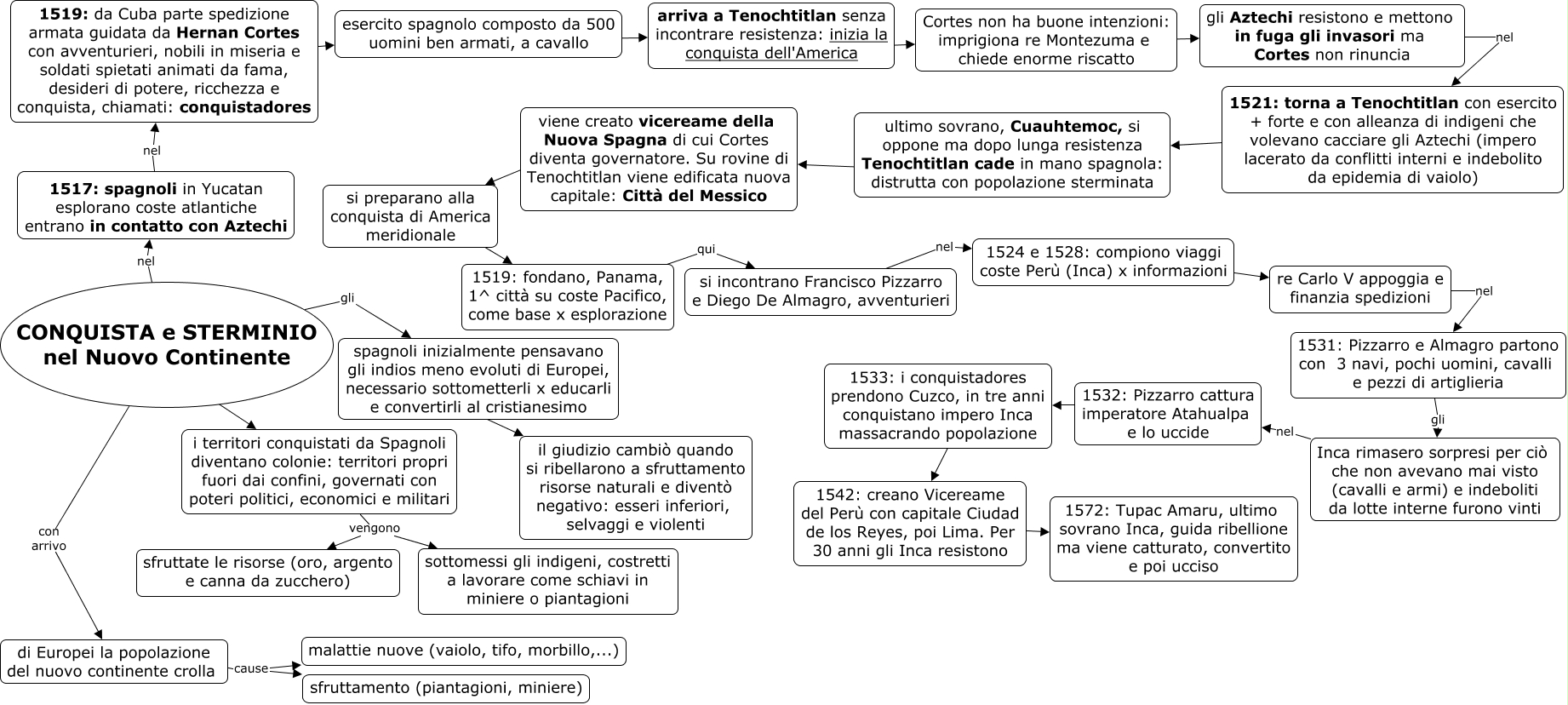 Questa Cmap, creata con IHMC CmapTools, contiene informazioni relative a: Conquista e sterminio_Nuovo Continente_2, si incontrano Francisco Pizzarro e Diego De Almagro, avventurieri nel 1524 e 1528: compiono viaggi coste Perù (Inca) x informazioni, di Europei la popolazione del nuovo continente crolla cause sfruttamento (piantagioni, miniere), Inca rimasero sorpresi per ciò che non avevano mai visto (cavalli e armi) e indeboliti da lotte interne furono vinti nel 1532: Pizzarro cattura imperatore Atahualpa e lo uccide, 1519: da Cuba parte spedizione armata guidata da Hernan Cortes con avventurieri, nobili in miseria e soldati spietati animati da fama, desideri di potere, ricchezza e conquista, chiamati: conquistadores ???? esercito spagnolo composto da 500 uomini ben armati, a cavallo, di Europei la popolazione del nuovo continente crolla cause malattie nuove (vaiolo, tifo, morbillo,...), Cortes non ha buone intenzioni: imprigiona re Montezuma e chiede enorme riscatto ???? gli Aztechi resistono e mettono in fuga gli invasori ma Cortes non rinuncia, 1521: torna a Tenochtitlan con esercito + forte e con alleanza di indigeni che volevano cacciare gli Aztechi (impero lacerato da conflitti interni e indebolito da epidemia di vaiolo) ???? ultimo sovrano, Cuauhtemoc, si oppone ma dopo lunga resistenza Tenochtitlan cade in mano spagnola: distrutta con popolazione sterminata, i territori conquistati da Spagnoli diventano colonie: territori propri fuori dai confini, governati con poteri politici, economici e militari vengono sfruttate le risorse (oro, argento e canna da zucchero), viene creato vicereame della Nuova Spagna di cui Cortes diventa governatore. Su rovine di Tenochtitlan viene edificata nuova capitale: Città del Messico ???? si preparano alla conquista di America meridionale, spagnoli inizialmente pensavano gli indios meno evoluti di Europei, necessario sottometterli x educarli e convertirli al cristianesimo ???? il giudizio cambiò quando si ribellarono a sfruttamento risorse naturali e diventò negativo: esseri inferiori, selvaggi e violenti, gli Aztechi resistono e mettono in fuga gli invasori ma Cortes non rinuncia nel 1521: torna a Tenochtitlan con esercito + forte e con alleanza di indigeni che volevano cacciare gli Aztechi (impero lacerato da conflitti interni e indebolito da epidemia di vaiolo), 1519: fondano, Panama, 1^ città su coste Pacifico, come base x esplorazione qui si incontrano Francisco Pizzarro e Diego De Almagro, avventurieri, CONQUISTA e STERMINIO nel Nuovo Continente con arrivo di Europei la popolazione del nuovo continente crolla, CONQUISTA e STERMINIO nel Nuovo Continente ??? i territori conquistati da Spagnoli diventano colonie: territori propri fuori dai confini, governati con poteri politici, economici e militari, 1532: Pizzarro cattura imperatore Atahualpa e lo uccide ???? 1533: i conquistadores prendono Cuzco, in tre anni conquistano impero Inca massacrando popolazione, 1531: Pizzarro e Almagro partono con 3 navi, pochi uomini, cavalli e pezzi di artiglieria gli Inca rimasero sorpresi per ciò che non avevano mai visto (cavalli e armi) e indeboliti da lotte interne furono vinti, arriva a Tenochtitlan senza incontrare resistenza: inizia la conquista dell'America ???? Cortes non ha buone intenzioni: imprigiona re Montezuma e chiede enorme riscatto, 1517: spagnoli in Yucatan esplorano coste atlantiche entrano in contatto con Aztechi nel 1519: da Cuba parte spedizione armata guidata da Hernan Cortes con avventurieri, nobili in miseria e soldati spietati animati da fama, desideri di potere, ricchezza e conquista, chiamati: conquistadores, 1533: i conquistadores prendono Cuzco, in tre anni conquistano impero Inca massacrando popolazione ???? 1542: creano Vicereame del Perù con capitale Ciudad de los Reyes, poi Lima. Per 30 anni gli Inca resistono, esercito spagnolo composto da 500 uomini ben armati, a cavallo ???? arriva a Tenochtitlan senza incontrare resistenza: inizia la conquista dell'America
