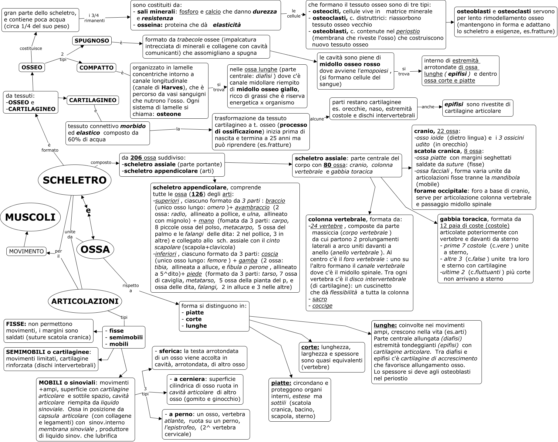 Questa Cmap, creata con IHMC CmapTools, contiene informazioni relative a: Scheletro_ossa_articolazioni, SCHELETRO per il MOVIMENTO, sono costituiti da: - sali minerali: fosforo e calcio che danno durezza e resistenza - osseina: proteina che dà elasticità le cellule che formano il tessuto osseo sono di tre tipi: - osteociti, cellule vive in matrice minerale - osteoclasti, c. distruttrici: riassorbono tessuto osseo vecchio - osteoblasti, c. contenute nel periostio (membrana che riveste l'osso) che costruiscono nuovo tessuto osseo, scheletro assiale: parte centrale del corpo con 80 ossa: cranio, colonna vertebrale e gabbia toracica ???? colonna vertebrale, formata da: -24 vertebre, composte da parte massiccia (corpo vertebrale) da cui partono 2 prolungamenti laterali a arco uniti davanti a anello (anello vertebrale). Al centro c'è il foro vertebrale: uno su l'altro formano il canale vertebrale dove c'è il midollo spinale. Tra ogni vertebra c'è il disco intervertebrale (di cartilagine): un cuscinetto che dà flessibilità a tutta la colonna - sacro - coccige, gran parte dello scheletro, e contiene poca acqua (circa 1/4 del suo peso) i 3/4 rimanenti sono costituiti da: - sali minerali: fosforo e calcio che danno durezza e resistenza - osseina: proteina che dà elasticità, da 206 ossa suddiviso: -scheletro assiale (parte portante) -scheletro appendicolare (arti) ???? scheletro appendicolare, comprende tutte le ossa (126) degli arti: -superiori, ciascuno formato da 3 parti: braccio (unico osso lungo: omero)+ avambraccio (2 ossa: radio, allineato a pollice, e ulna, allineato con mignolo) + mano (fomata da 3 parti: carpo, 8 piccole ossa del polso, metacarpo, 5 ossa del palmo e le falangi delle dita: 2 nel pollice, 3 in altre) e collegato allo sch. assiale con il cinto scapolare(scapola+clavicola) -inferiori, ciascuno formato da 3 parti: coscia (unico osso lungo: femore) + gamba (2 ossa: tibia, allineata a alluce, e fibula o perone, allineato a 5^dito)+ piede (formato da 3 parti: tarso,7 ossa di caviglia, metatarso, 5 ossa della pianta del p, e ossa delle dita, falangi, 2 in alluce e 3 nelle altre), MOBILI o sinoviali: movimenti +ampi, superficie con cartilagine articolare e sottile spazio, cavità articolare riempita da liquido sinoviale. Ossa in posizione da capsula articolare (con collagene e legamenti) con sinov.interno membrana sinoviale, produttore di liquido sinov. che lubrifica 3 tipi - a cerniera: superficie cilindrica di osso ruota in cavità articolare di altro osso (gomito e ginocchio), SPUGNOSO è formato da trabecoleossee (impalcatura intrecciata di minerali e collagene con cavità comunicanti) che assomigliano a spugna, SCHELETRO composto da 206 ossa suddiviso: -scheletro assiale (parte portante) -scheletro appendicolare (arti), le cavità sono piene di midollo osseo rosso dove avviene l'emopoiesi, (si formano cellule del sangue) si trova interno di estremità arrotondate di ossa lunghe (epifisi) e dentro ossa corte e piatte, scheletro assiale: parte centrale del corpo con 80 ossa: cranio, colonna vertebrale e gabbia toracica ???? cranio, 22 ossa: -osso ioide (dietro lingua) e i 3 ossicini udito (in orecchio) scatola cranica, 8 ossa: -ossa piatte con margini seghettati saldate da suture (fisse) -ossa facciali, forma varia unite da articolazioni fisse tranne la mandibola (mobile) forame occipitale: foro a base di cranio, serve per articolazione colonna vertebrale e passaggio midollo spinale, SCHELETRO e OSSA, parti restano cartilaginee es. orecchie, naso, estremità costole e dischi intervertebrali anche epifisi sono rivestite di cartilagine articolare, ARTICOLAZIONI tipi - fisse - semimobili - mobili, SCHELETRO è formato da tessuti: -OSSEO e -CARTILAGINEO, OSSA rispetto a forma si distinguono in: - piatte - corte - lunghe, OSSEO 2 tipi SPUGNOSO, tessuto connettivo morbido ed elastico composto da 60% di acqua la trasformazione da tessuto cartilagineo a t. osseo (processo di ossificazione) inizia prima di nascita e termina a 25 anni ma può riprendere (es.fratture), - fisse - semimobili - mobili ???? MOBILI o sinoviali: movimenti +ampi, superficie con cartilagine articolare e sottile spazio, cavità articolare riempita da liquido sinoviale. Ossa in posizione da capsula articolare (con collagene e legamenti) con sinov.interno membrana sinoviale, produttore di liquido sinov. che lubrifica, scheletro assiale: parte centrale del corpo con 80 ossa: cranio, colonna vertebrale e gabbia toracica ???? gabbia toracica, formata da 12 paia di coste (costole) articolate poteriormente con vertebre e davanti da sterno - prime 7 costole (c.vere) unite a sterno, - altre 3 (c.false) unite tra loro e sterno con cartilagine -ultime 2 (c.fluttuanti) più corte non arrivano a sterno, MOBILI o sinoviali: movimenti +ampi, superficie con cartilagine articolare e sottile spazio, cavità articolare riempita da liquido sinoviale. Ossa in posizione da capsula articolare (con collagene e legamenti) con sinov.interno membrana sinoviale, produttore di liquido sinov. che lubrifica 3 tipi - sferica: la testa arrotondata di un osso viene accolta in cavità, arrotondata, di altro osso