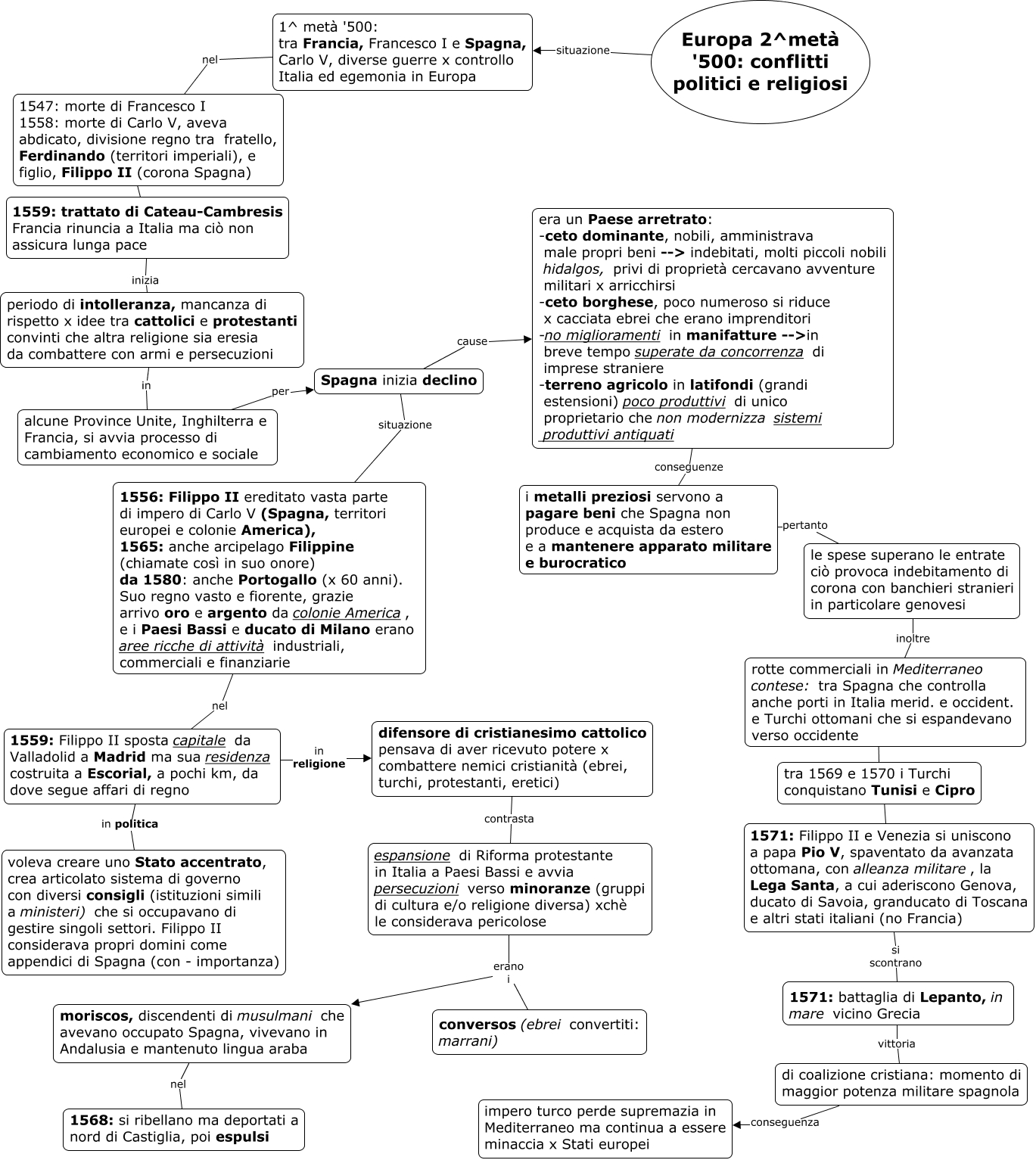 Questa Cmap, creata con IHMC CmapTools, contiene informazioni relative a: Europa1550_conflitti_pol-rel, le spese superano le entrate ciò provoca indebitamento di corona con banchieri stranieri in particolare genovesi inoltre rotte commerciali in Mediterraneo contese: tra Spagna che controlla anche porti in Italia merid. e occident. e Turchi ottomani che si espandevano verso occidente, 1556: Filippo II ereditato vasta parte di impero di Carlo V (Spagna, territori europei e colonie America), 1565: anche arcipelago Filippine (chiamate così in suo onore) da 1580: anche Portogallo (x 60 anni). Suo regno vasto e fiorente, grazie arrivo oro e argento da colonie America, e i Paesi Bassi e ducato di Milano erano aree ricche di attività industriali, commerciali e finanziarie nel 1559: Filippo II sposta capitale da Valladolid a Madrid ma sua residenza costruita a Escorial, a pochi km, da dove segue affari di regno, 1559: trattato di Cateau-Cambresis Francia rinuncia a Italia ma ciò non assicura lunga pace inizia periodo di intolleranza, mancanza di rispetto x idee tra cattolici e protestanti convinti che altra religione sia eresia da combattere con armi e persecuzioni, di coalizione cristiana: momento di maggior potenza militare spagnola conseguenza impero turco perde supremazia in Mediterraneo ma continua a essere minaccia x Stati europei, Europa 2^metà '500: conflitti politici e religiosi situazione 1^ metà '500: tra Francia, Francesco I e Spagna, Carlo V, diverse guerre x controllo Italia ed egemonia in Europa, Spagna inizia declino situazione 1556: Filippo II ereditato vasta parte di impero di Carlo V (Spagna, territori europei e colonie America), 1565: anche arcipelago Filippine (chiamate così in suo onore) da 1580: anche Portogallo (x 60 anni). Suo regno vasto e fiorente, grazie arrivo oro e argento da colonie America, e i Paesi Bassi e ducato di Milano erano aree ricche di attività industriali, commerciali e finanziarie, Spagna inizia declino cause era un Paese arretrato: -ceto dominante, nobili, amministrava male propri beni --> indebitati, molti piccoli nobili hidalgos, privi di proprietà cercavano avventure militari x arricchirsi -ceto borghese, poco numeroso si riduce x cacciata ebrei che erano imprenditori -no miglioramenti in manifatture -->in breve tempo superate da concorrenza di imprese straniere -terreno agricolo in latifondi (grandi estensioni) poco produttivi di unico proprietario che non modernizza sistemi produttivi antiquati, alcune Province Unite, Inghilterra e Francia, si avvia processo di cambiamento economico e sociale per Spagna inizia declino, rotte commerciali in Mediterraneo contese: tra Spagna che controlla anche porti in Italia merid. e occident. e Turchi ottomani che si espandevano verso occidente ???? tra 1569 e 1570 i Turchi conquistano Tunisi e Cipro, i metalli preziosi servono a pagare beni che Spagna non produce e acquista da estero e a mantenere apparato militare e burocratico pertanto le spese superano le entrate ciò provoca indebitamento di corona con banchieri stranieri in particolare genovesi, 1559: Filippo II sposta capitale da Valladolid a Madrid ma sua residenza costruita a Escorial, a pochi km, da dove segue affari di regno in religione difensore di cristianesimo cattolico pensava di aver ricevuto potere x combattere nemici cristianità (ebrei, turchi, protestanti, eretici), 1^ metà '500: tra Francia, Francesco I e Spagna, Carlo V, diverse guerre x controllo Italia ed egemonia in Europa nel 1547: morte di Francesco I 1558: morte di Carlo V, aveva abdicato, divisione regno tra fratello, Ferdinando (territori imperiali), e figlio, Filippo II (corona Spagna), espansione di Riforma protestante in Italia a Paesi Bassi e avvia persecuzioni verso minoranze (gruppi di cultura e/o religione diversa) xchè le considerava pericolose erano i moriscos, discendenti di musulmani che avevano occupato Spagna, vivevano in Andalusia e mantenuto lingua araba, 1571: battaglia di Lepanto, in mare vicino Grecia vittoria di coalizione cristiana: momento di maggior potenza militare spagnola, 1559: Filippo II sposta capitale da Valladolid a Madrid ma sua residenza costruita a Escorial, a pochi km, da dove segue affari di regno in politica voleva creare uno Stato accentrato, crea articolato sistema di governo con diversi consigli (istituzioni simili a ministeri) che si occupavano di gestire singoli settori. Filippo II considerava propri domini come appendici di Spagna (con - importanza), espansione di Riforma protestante in Italia a Paesi Bassi e avvia persecuzioni verso minoranze (gruppi di cultura e/o religione diversa) xchè le considerava pericolose erano i conversos (ebrei convertiti: marrani), periodo di intolleranza, mancanza di rispetto x idee tra cattolici e protestanti convinti che altra religione sia eresia da combattere con armi e persecuzioni in alcune Province Unite, Inghilterra e Francia, si avvia processo di cambiamento economico e sociale, difensore di cristianesimo cattolico pensava di aver ricevuto potere x combattere nemici cristianità (ebrei, turchi, protestanti, eretici) contrasta espansione di Riforma protestante in Italia a Paesi Bassi e avvia persecuzioni verso minoranze (gruppi di cultura e/o religione diversa) xchè le considerava pericolose, 1571: Filippo II e Venezia si uniscono a papa Pio V, spaventato da avanzata ottomana, con alleanza militare, la Lega Santa, a cui aderiscono Genova, ducato di Savoia, granducato di Toscana e altri stati italiani (no Francia) si scontrano 1571: battaglia di Lepanto, in mare vicino Grecia, moriscos, discendenti di musulmani che avevano occupato Spagna, vivevano in Andalusia e mantenuto lingua araba nel 1568: si ribellano ma deportati a nord di Castiglia, poi espulsi