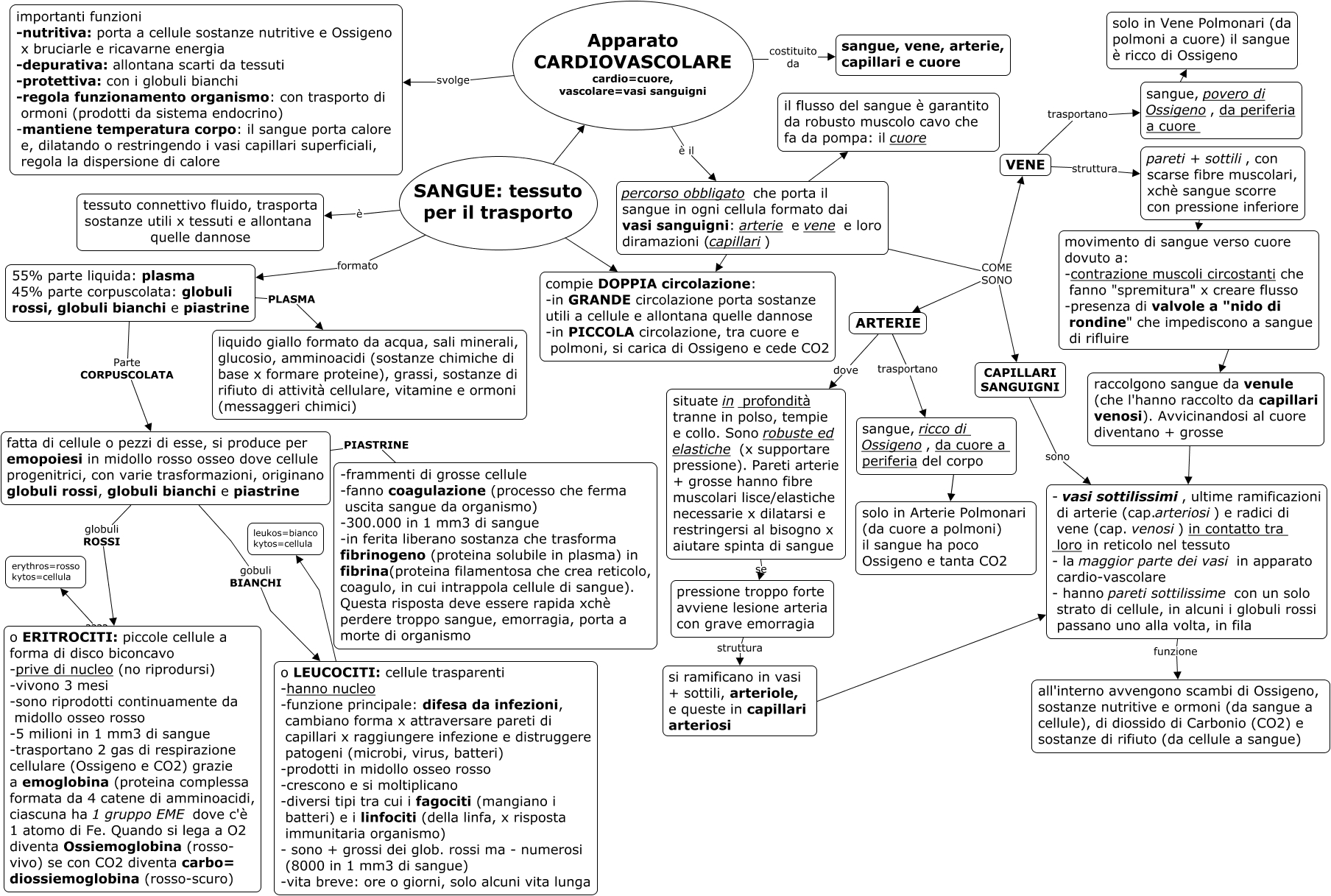 Questa Cmap, creata con IHMC CmapTools, contiene informazioni relative a: Sangue_AppCardioVascol_ok, percorso obbligato che porta il sangue in ogni cellula formato dai vasi sanguigni: arterie e vene e loro diramazioni (capillari) COME SONO VENE, o ERITROCITI: piccole cellule a forma di disco biconcavo -prive di nucleo (no riprodursi) -vivono 3 mesi -sono riprodotti continuamente da midollo osseo rosso -5 milioni in 1 mm3 di sangue -trasportano 2 gas di respirazione cellulare (Ossigeno e CO2) grazie a emoglobina (proteina complessa formata da 4 catene di amminoacidi, ciascuna ha 1 gruppo EME dove c'è 1 atomo di Fe. Quando si lega a O2 diventa Ossiemoglobina (rosso- vivo) se con CO2 diventa carbo= diossiemoglobina (rosso-scuro) ???? erythros=rosso kytos=cellula, CAPILLARI SANGUIGNI sono - vasi sottilissimi, ultime ramificazioni di arterie (cap.arteriosi) e radici di vene (cap. venosi) in contatto tra loro in reticolo nel tessuto - la maggior parte dei vasi in apparato cardio-vascolare - hanno pareti sottilissime con un solo strato di cellule, in alcuni i globuli rossi passano uno alla volta, in fila, percorso obbligato che porta il sangue in ogni cellula formato dai vasi sanguigni: arterie e vene e loro diramazioni (capillari) COME SONO ARTERIE, fatta di cellule o pezzi di esse, si produce per emopoiesi in midollo rosso osseo dove cellule progenitrici, con varie trasformazioni, originano globuli rossi, globuli bianchi e piastrine globuli ROSSI o ERITROCITI: piccole cellule a forma di disco biconcavo -prive di nucleo (no riprodursi) -vivono 3 mesi -sono riprodotti continuamente da midollo osseo rosso -5 milioni in 1 mm3 di sangue -trasportano 2 gas di respirazione cellulare (Ossigeno e CO2) grazie a emoglobina (proteina complessa formata da 4 catene di amminoacidi, ciascuna ha 1 gruppo EME dove c'è 1 atomo di Fe. Quando si lega a O2 diventa Ossiemoglobina (rosso- vivo) se con CO2 diventa carbo= diossiemoglobina (rosso-scuro), sangue, povero di Ossigeno, da periferia a cuore ???? solo in Vene Polmonari (da polmoni a cuore) il sangue è ricco di Ossigeno, percorso obbligato che porta il sangue in ogni cellula formato dai vasi sanguigni: arterie e vene e loro diramazioni (capillari) ???? compie DOPPIA circolazione: -in GRANDE circolazione porta sostanze utili a cellule e allontana quelle dannose -in PICCOLA circolazione, tra cuore e polmoni, si carica di Ossigeno e cede CO2, VENE struttura pareti + sottili, con scarse fibre muscolari, xchè sangue scorre con pressione inferiore, 55% parte liquida: plasma 45% parte corpuscolata: globuli rossi, globuli bianchi e piastrine Parte CORPUSCOLATA fatta di cellule o pezzi di esse, si produce per emopoiesi in midollo rosso osseo dove cellule progenitrici, con varie trasformazioni, originano globuli rossi, globuli bianchi e piastrine, fatta di cellule o pezzi di esse, si produce per emopoiesi in midollo rosso osseo dove cellule progenitrici, con varie trasformazioni, originano globuli rossi, globuli bianchi e piastrine gobuli BIANCHI o LEUCOCITI: cellule trasparenti -hanno nucleo -funzione principale: difesa da infezioni, cambiano forma x attraversare pareti di capillari x raggiungere infezione e distruggere patogeni (microbi, virus, batteri) -prodotti in midollo osseo rosso -crescono e si moltiplicano -diversi tipi tra cui i fagociti (mangiano i batteri) e i linfociti (della linfa, x risposta immunitaria organismo) - sono + grossi dei glob. rossi ma - numerosi (8000 in 1 mm3 di sangue) -vita breve: ore o giorni, solo alcuni vita lunga, SANGUE: tessuto per il trasporto ???? Apparato CARDIOVASCOLARE cardio=cuore, vascolare=vasi sanguigni, ARTERIE trasportano sangue, ricco di Ossigeno, da cuore a periferia del corpo, pareti + sottili, con scarse fibre muscolari, xchè sangue scorre con pressione inferiore ???? movimento di sangue verso cuore dovuto a: -contrazione muscoli circostanti che fanno "spremitura" x creare flusso -presenza di valvole a "nido di rondine" che impediscono a sangue di rifluire, SANGUE: tessuto per il trasporto è tessuto connettivo fluido, trasporta sostanze utili x tessuti e allontana quelle dannose, situate in profondità tranne in polso, tempie e collo. Sono robuste ed elastiche (x supportare pressione). Pareti arterie + grosse hanno fibre muscolari lisce/elastiche necessarie x dilatarsi e restringersi al bisogno x aiutare spinta di sangue se pressione troppo forte avviene lesione arteria con grave emorragia, percorso obbligato che porta il sangue in ogni cellula formato dai vasi sanguigni: arterie e vene e loro diramazioni (capillari) COME SONO CAPILLARI SANGUIGNI, movimento di sangue verso cuore dovuto a: -contrazione muscoli circostanti che fanno "spremitura" x creare flusso -presenza di valvole a "nido di rondine" che impediscono a sangue di rifluire ???? raccolgono sangue da venule (che l'hanno raccolto da capillari venosi). Avvicinandosi al cuore diventano + grosse, si ramificano in vasi + sottili, arteriole, e queste in capillari arteriosi ???? - vasi sottilissimi, ultime ramificazioni di arterie (cap.arteriosi) e radici di vene (cap. venosi) in contatto tra loro in reticolo nel tessuto - la maggior parte dei vasi in apparato cardio-vascolare - hanno pareti sottilissime con un solo strato di cellule, in alcuni i globuli rossi passano uno alla volta, in fila, 55% parte liquida: plasma 45% parte corpuscolata: globuli rossi, globuli bianchi e piastrine PLASMA liquido giallo formato da acqua, sali minerali, glucosio, amminoacidi (sostanze chimiche di base x formare proteine), grassi, sostanze di rifiuto di attività cellulare, vitamine e ormoni (messaggeri chimici), sangue, ricco di Ossigeno, da cuore a periferia del corpo ??? solo in Arterie Polmonari (da cuore a polmoni) il sangue ha poco Ossigeno e tanta CO2