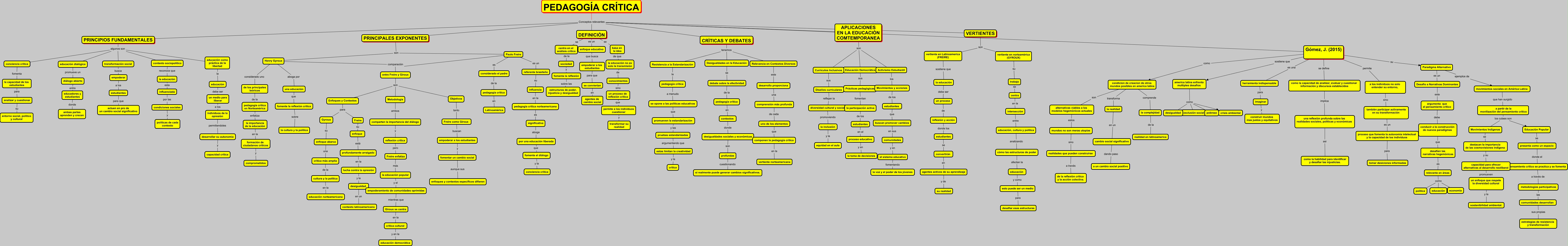 Este Cmap, tiene información relacionada con: pedagogía crítica, desafíen las narrativas hegemónicas es relevante en áreas, componen la pedagogía crítica en la vertiente norteamericana, Paulo Freire es un referente brasileño, pedagogía crítica en Latinoamérica, pedagogía crítica norteamericana es significativa, Movimientos y acciones de los estudiantes, herramienta indispensable para imaginar, fomentar un cambio social aunque sus enfoques y contextos específicos difieren, america latina enfrenta multiples desafios como pobreza, reflexión y acción donde los estudiantes, DEFINICIÓN Conceptos relevantes PEDAGOGÍA CRÍTICA, Henry Gyroux aboga por una educación, enfoque educativo que busca empoderar a los estudiantes, capacidad para ofrecer alternativas al desarrollo neoliberal promueven un enfoque que respete la diversidad cultural, CRÍTICAS Y DEBATES tenemos Resistencia a la Estandarización, condicion de creacion de otros mundos posibles en america latina transforma la realidad, PRINCIPALES EXPONENTES Conceptos relevantes VERTIENTES, comprensión más profunda de cada uno de los elementos, profundamente arraigado en la lucha contra la opresión, por una educación liberada que fomente el diálogo