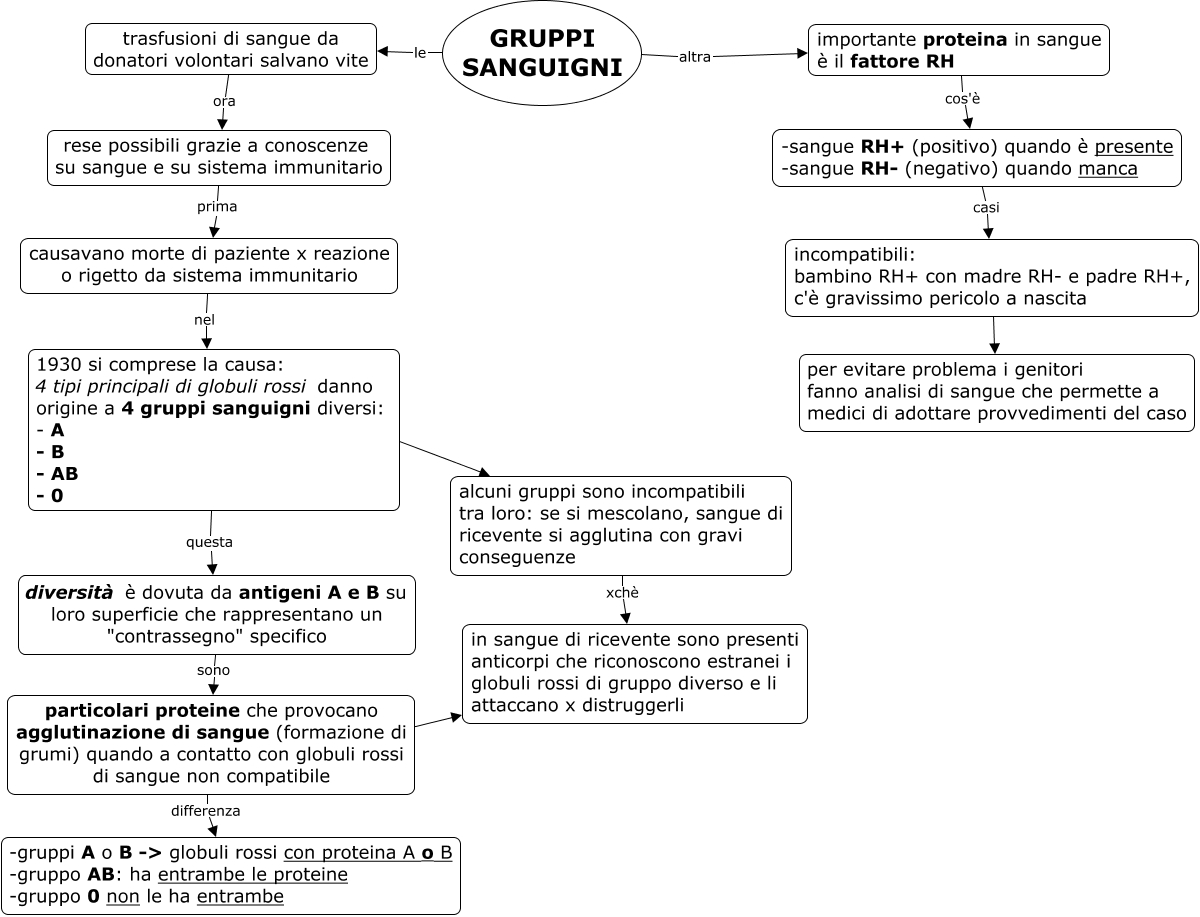 Questa Cmap, creata con IHMC CmapTools, contiene informazioni relative a: Gruppi sanguigni_RH, incompatibili: bambino RH+ con madre RH- e padre RH+, c'è gravissimo pericolo a nascita ???? per evitare problema i genitori fanno analisi di sangue che permette a medici di adottare provvedimenti del caso, particolari proteine che provocano agglutinazione di sangue (formazione di grumi) quando a contatto con globuli rossi di sangue non compatibile ???? in sangue di ricevente sono presenti anticorpi che riconoscono estranei i globuli rossi di gruppo diverso e li attaccano x distruggerli, GRUPPI SANGUIGNI altra importante proteina in sangue è il fattore RH, importante proteina in sangue è il fattore RH cos'è -sangue RH+ (positivo) quando è presente -sangue RH- (negativo) quando manca, causavano morte di paziente x reazione o rigetto da sistema immunitario nel 1930 si comprese la causa: 4 tipi principali di globuli rossi danno origine a 4 gruppi sanguigni diversi: - A - B - AB - 0, GRUPPI SANGUIGNI le trasfusioni di sangue da donatori volontari salvano vite, alcuni gruppi sono incompatibili tra loro: se si mescolano, sangue di ricevente si agglutina con gravi conseguenze xchè in sangue di ricevente sono presenti anticorpi che riconoscono estranei i globuli rossi di gruppo diverso e li attaccano x distruggerli, 1930 si comprese la causa: 4 tipi principali di globuli rossi danno origine a 4 gruppi sanguigni diversi: - A - B - AB - 0 questa diversità è dovuta da antigeni A e B su loro superficie che rappresentano un "contrassegno" specifico, rese possibili grazie a conoscenze su sangue e su sistema immunitario prima causavano morte di paziente x reazione o rigetto da sistema immunitario, 1930 si comprese la causa: 4 tipi principali di globuli rossi danno origine a 4 gruppi sanguigni diversi: - A - B - AB - 0 ???? alcuni gruppi sono incompatibili tra loro: se si mescolano, sangue di ricevente si agglutina con gravi conseguenze, diversità è dovuta da antigeni A e B su loro superficie che rappresentano un "contrassegno" specifico sono particolari proteine che provocano agglutinazione di sangue (formazione di grumi) quando a contatto con globuli rossi di sangue non compatibile, particolari proteine che provocano agglutinazione di sangue (formazione di grumi) quando a contatto con globuli rossi di sangue non compatibile differenza -gruppi A o B -> globuli rossi con proteina A o B -gruppo AB: ha entrambe le proteine -gruppo 0 non le ha entrambe, -sangue RH+ (positivo) quando è presente -sangue RH- (negativo) quando manca casi incompatibili: bambino RH+ con madre RH- e padre RH+, c'è gravissimo pericolo a nascita, trasfusioni di sangue da donatori volontari salvano vite ora rese possibili grazie a conoscenze su sangue e su sistema immunitario