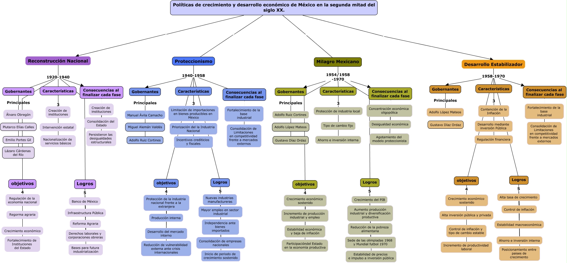 Este Cmap, tiene información relacionada con: Políticas de crecimiento y desarrollo, Características 3 Limitación de importaciones en bienes producibles en México, Características 3 Contención de la Inflación, objetivos Desarrollo del mercado interno, objetivos Reducción de vulnerabilidad externa ante crisis internacionales, Gobernantes Principales Adolfo López Mateos, objetivos Incremento de productividad laboral, Logros 5 Estabilidad de precios e impulso a inversión pública, Consecuencias al finalizar cada fase Agotamiento del modelo proteccionista, objetivos Crecimiento económico, Logros 5 Alta tasa de crecimiento, Logros 5 Consolidación de empresas nacionales, Gobernantes Principales Emilio Portes Gil, Consecuencias al finalizar cada fase Creación de instituciones, Logros 5 Reforma Agraria, objetivos Regulación de la economía nacional, Características 3 Intervención estatal, Logros 5 Posicionamiento entre paises de crecimiento, Gobernantes Principales Gustavo Díaz Ordaz, objetivos Estabilidad económica y baja de inflación, Proteccionismo 1940-1958 Consecuencias al finalizar cada fase