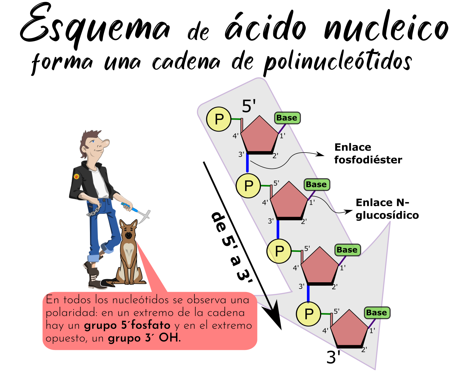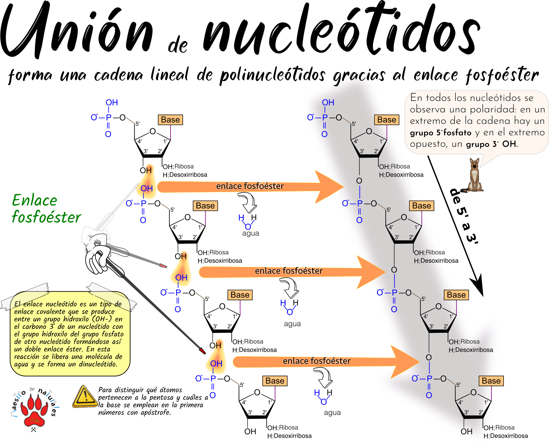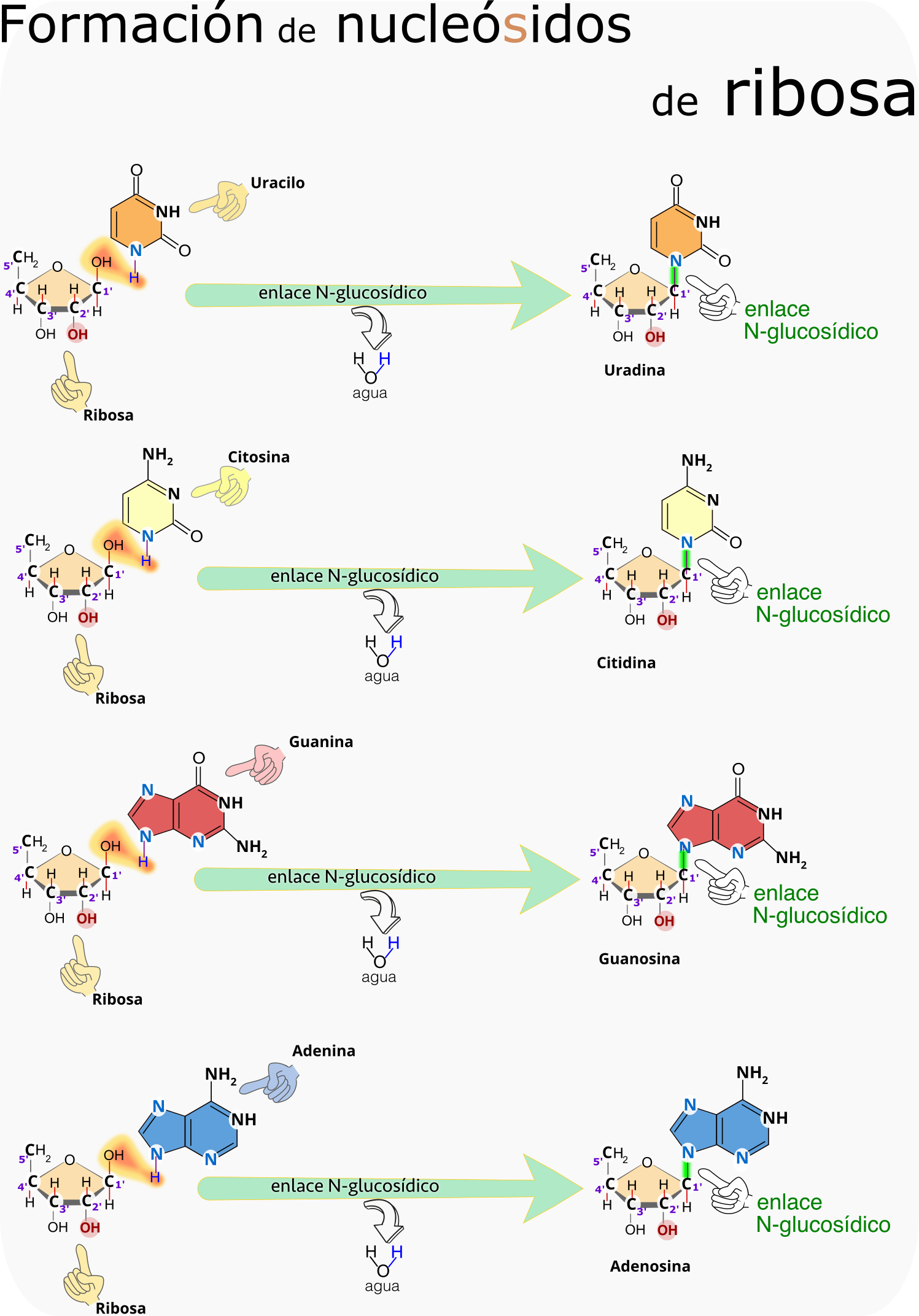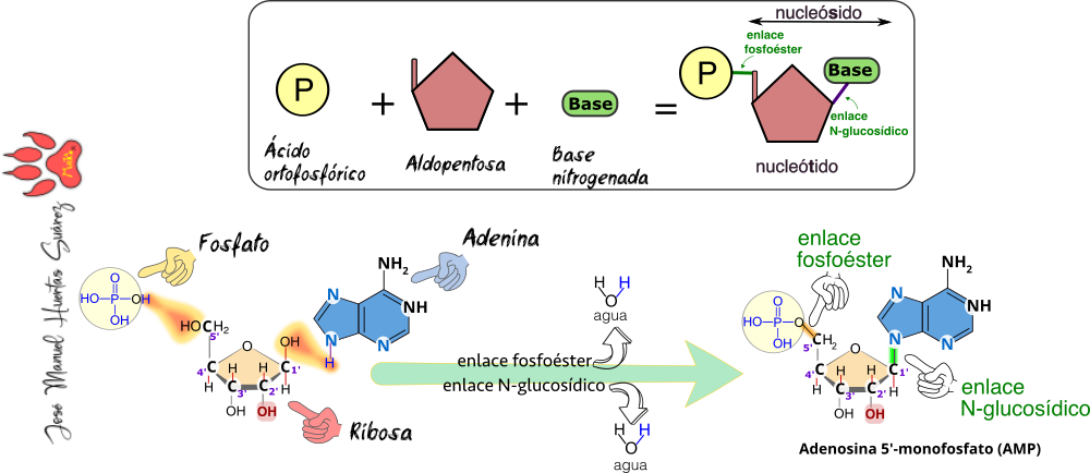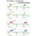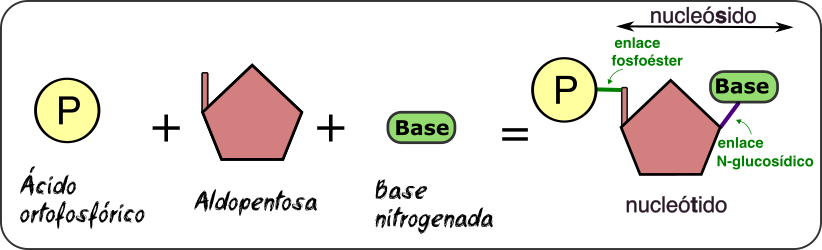Recursos Tema 04 Ácidos nucleicos Enlace fosfoéster y N-glucosídico.png Esquema del ácido nucleico.png Esquema de un nucleótido.png Formación de nucleósidos de desoxirribosa.png Formación de nucleósidos de ribosa.png Nucleótidos de los ácidos nucleicos.png Unión de nucleótidos.png
