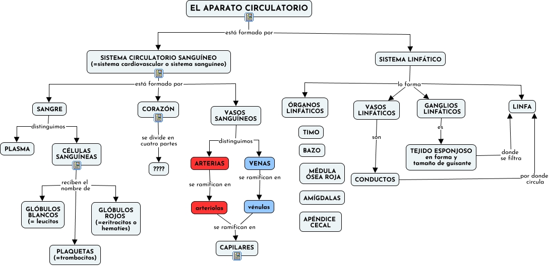 Este Cmap, tiene información relacionada con: 4.1 El aparato circulatorio, EL APARATO CIRCULATORIO está formado por SISTEMA CIRCULATORIO SANGUÍNEO (=sistema cardiovascular o sistema sanguíneo), CORAZÓN se divide en cuatro partes ????, ARTERIAS se ramifican en arteriolas, SISTEMA CIRCULATORIO SANGUÍNEO (=sistema cardiovascular o sistema sanguíneo) está formado por VASOS SANGUÍNEOS, SISTEMA LINFÁTICO lo forma GANGLIOS LINFÁTICOS, VENAS se ramifican en vénulas, EL APARATO CIRCULATORIO está formado por SISTEMA LINFÁTICO, VASOS SANGUÍNEOS distinguimos VENAS, CONDUCTOS por donde circula LINFA, TEJIDO ESPONJOSO en forma y tamaño de guisante donde se filtra LINFA, VASOS SANGUÍNEOS distinguimos ARTERIAS, SISTEMA LINFÁTICO lo forma LINFA, VASOS LINFÁTICOS son CONDUCTOS, SISTEMA LINFÁTICO lo forma VASOS LINFÁTICOS, SISTEMA LINFÁTICO lo forma ÓRGANOS LINFÁTICOS, SISTEMA CIRCULATORIO SANGUÍNEO (=sistema cardiovascular o sistema sanguíneo) está formado por CORAZÓN, CÉLULAS SANGUÍNEAS reciben el nombre de GLÓBULOS ROJOS (=eritrocitos o hematíes), SANGRE distinguimos CÉLULAS SANGUÍNEAS, SANGRE distinguimos PLASMA, SISTEMA CIRCULATORIO SANGUÍNEO (=sistema cardiovascular o sistema sanguíneo) está formado por SANGRE