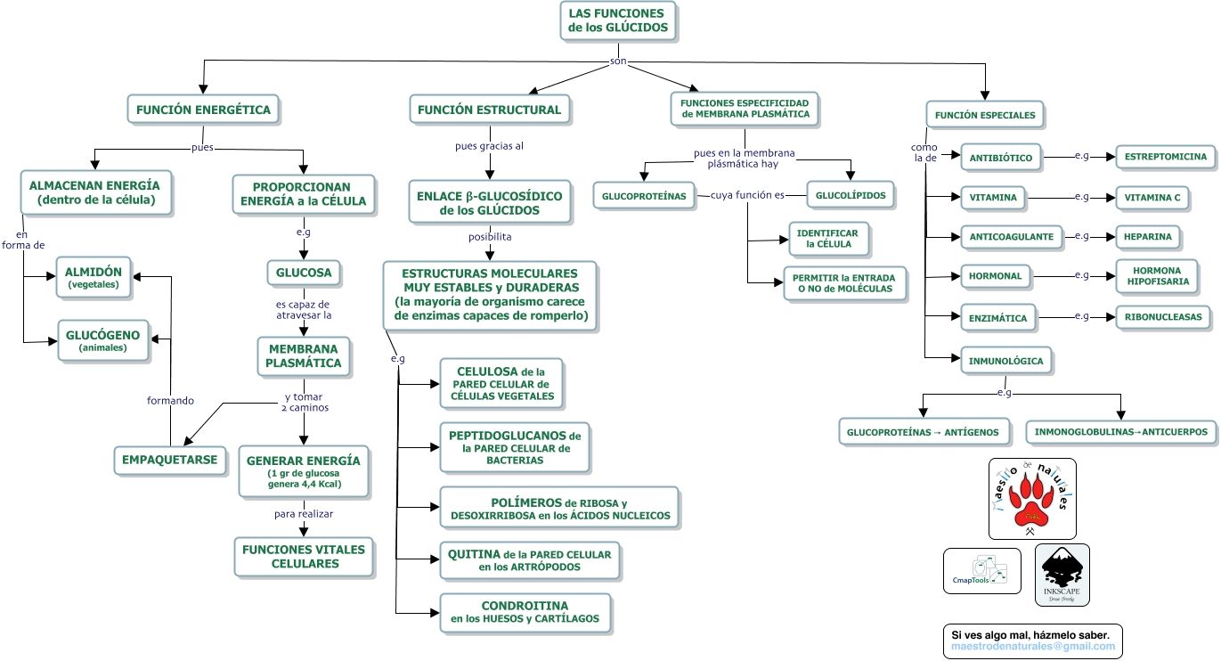 Este Cmap, tiene información relacionada con: 2.6.1 Funciones de los glúcidos, EMPAQUETARSE formando ALMIDÓN (vegetales), HORMONAL e.g HORMONA HIPOFISARIA, FUNCIÓN ESPECIALES como la de INMUNOLÓGICA, FUNCIÓN ENERGÉTICA pues ALMACENAN ENERGÍA (dentro de la célula), LAS FUNCIONES de los GLÚCIDOS son FUNCIÓN ENERGÉTICA, LAS FUNCIONES de los GLÚCIDOS son FUNCIÓN ESPECIALES, ENZIMÁTICA e.g RIBONUCLEASAS, ALMACENAN ENERGÍA (dentro de la célula) en forma de GLUCÓGENO (animales), FUNCIONES ESPECIFICIDAD de MEMBRANA PLASMÁTICA pues en la membrana plásmática hay GLUCOLÍPIDOS, INMUNOLÓGICA e.g INMONOGLOBULINAS→ANTICUERPOS, INMUNOLÓGICA e.g GLUCOPROTEÍNAS → ANTÍGENOS, LAS FUNCIONES de los GLÚCIDOS son FUNCIONES ESPECIFICIDAD de MEMBRANA PLASMÁTICA, EMPAQUETARSE formando GLUCÓGENO (animales), PROPORCIONAN ENERGÍA a la CÉLULA e.g GLUCOSA, FUNCIÓN ESPECIALES como la de ANTIBIÓTICO, ANTICOAGULANTE e.g HEPARINA, VITAMINA e.g VITAMINA C, GLUCOLÍPIDOS cuya función es IDENTIFICAR la CÉLULA, MEMBRANA PLASMÁTICA y tomar 2 caminos GENERAR ENERGÍA (1 gr de glucosa genera 4,4 Kcal), ENLACE β-GLUCOSÍDICO de los GLÚCIDOS posibilita ESTRUCTURAS MOLECULARES MUY ESTABLES y DURADERAS (la mayoría de organismo carece de enzimas capaces de romperlo)