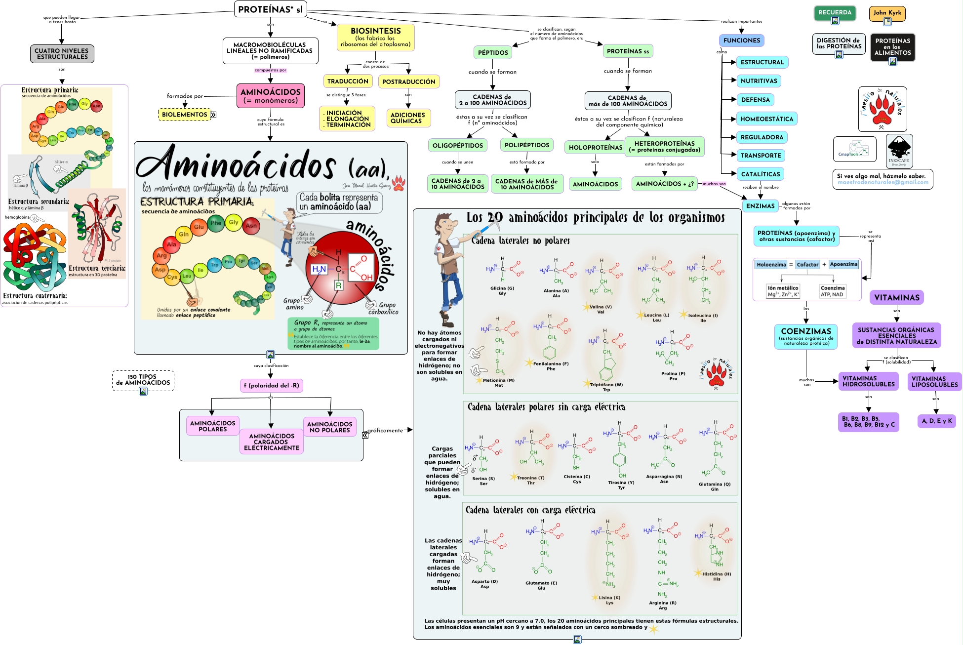 Este Cmap, tiene información relacionada con: Tema 03.01 Qué son los aminoácidos y proteínas, y su clasificación, FUNCIONES como NUTRITIVAS, FUNCIONES como ESTRUCTURAL, OXÍGENO (O) en proporciones ALTAS, CADENAS de 2 a 100 AMINOÁCIDOS éstas a su vez se clasifican f (nº aminoácidos) OLIGOPÉPTIDOS, VITAMINAS LIPOSOLUBLES son A, D, E y K, BIOSINTESIS (los fabrica los ribosomas del citoplasma) consta de dos procesos: TRADUCCIÓN, HETEROPROTEÍNAS (= proteínas conjugadas) están formados por AMINOÁCIDOS + ¿?, POLIPÉPTIDOS está formado por CADENAS de MÁS de 10 AMINOÁCIDOS, AMINOÁCIDOS / PROTEÍNAS compuestas por FÓSFORO (P), HIERRO (Fe), COBRE (Cu), MAGNESIO (Mg), IODO (I), VITAMINAS son SUSTANCIAS ORGÁNICAS ESENCIALES de DISTINTA NATURALEZA, HOLOPROTEÍNAS solo AMINOÁCIDOS, AMINOÁCIDOS / PROTEÍNAS compuestas por CARBONO (C), las COENZIMAS (sustancias orgánicas de naturaleza protéica), FUNCIONES como REGULADORA, AMINOÁCIDOS (= monómeros) formados por BIOLEMENTOS, SUSTANCIAS ORGÁNICAS ESENCIALES de DISTINTA NATURALEZA se clasifican f (solubilidad) VITAMINAS HIDROSOLUBLES, f (polaridad del -R) en AMINOÁCIDOS NO POLARES, PROTEÍNAS* sl su BIOSINTESIS (los fabrica los ribosomas del citoplasma), FUNCIONES como DEFENSA, OLIGOPÉPTIDOS cuando se unen CADENAS de 2 a 10 AMINOÁCIDOS