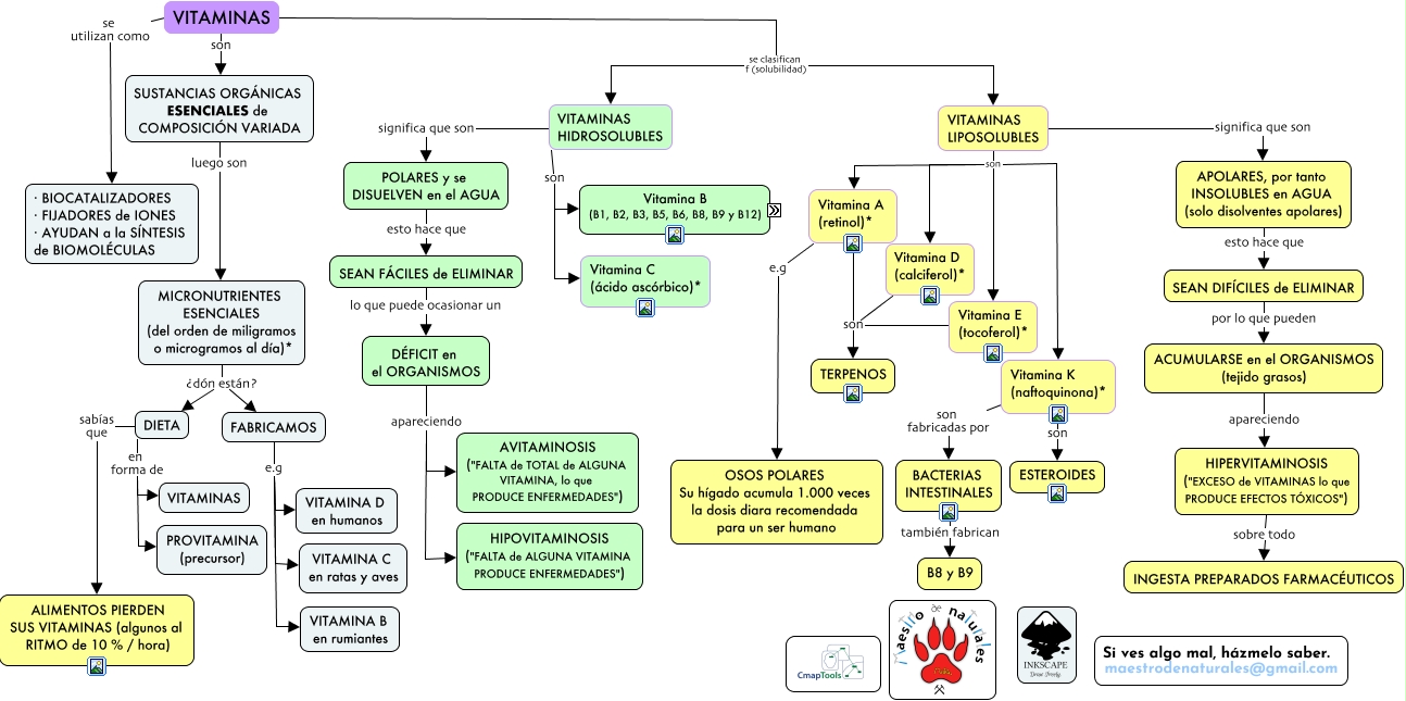 Este Cmap, tiene información relacionada con: Tema 03.09 Vitaminas, VITAMINAS LIPOSOLUBLES son Vitamina D (calciferol)*, FABRICAMOS e.g VITAMINA D en humanos, APOLARES, por tanto INSOLUBLES en AGUA (solo disolventes apolares) esto hace que SEAN DIFÍCILES de ELIMINAR, ACUMULARSE en el ORGANISMOS (tejido grasos) apareciendo HIPERVITAMINOSIS ("EXCESO de VITAMINAS lo que PRODUCE EFECTOS TÓXICOS"), Vitamina A (retinol)* son TERPENOS, VITAMINAS LIPOSOLUBLES son Vitamina A (retinol)*, SEAN DIFÍCILES de ELIMINAR por lo que pueden ACUMULARSE en el ORGANISMOS (tejido grasos), SUSTANCIAS ORGÁNICAS ESENCIALES de COMPOSICIÓN VARIADA luego son MICRONUTRIENTES ESENCIALES (del orden de miligramos o microgramos al día)*, VITAMINAS LIPOSOLUBLES son Vitamina K (naftoquinona)*, VITAMINAS HIDROSOLUBLES son Vitamina B (B1, B2, B3, B5, B6, B8, B9 y B12), Vitamina A (retinol)* e.g OSOS POLARES Su hígado acumula 1.000 veces la dosis diara recomendada para un ser humano, Vitamina D (calciferol)* son TERPENOS, DÉFICIT en el ORGANISMOS apareciendo HIPOVITAMINOSIS ("FALTA de ALGUNA VITAMINA PRODUCE ENFERMEDADES"), Vitamina K (naftoquinona)* son fabricadas por BACTERIAS INTESTINALES, BACTERIAS INTESTINALES también fabrican B8 y B9, Vitamina K (naftoquinona)* son ESTEROIDES, FABRICAMOS e.g VITAMINA B en rumiantes, Vitamina B (B1, B2, B3, B5, B6, B8, B9 y B12) son Vitamina B1 (tiamina)*, Vitamina B (B1, B2, B3, B5, B6, B8, B9 y B12) son Vitamina B9 (ácido fólico)*, POLARES y se DISUELVEN en el AGUA esto hace que SEAN FÁCILES de ELIMINAR