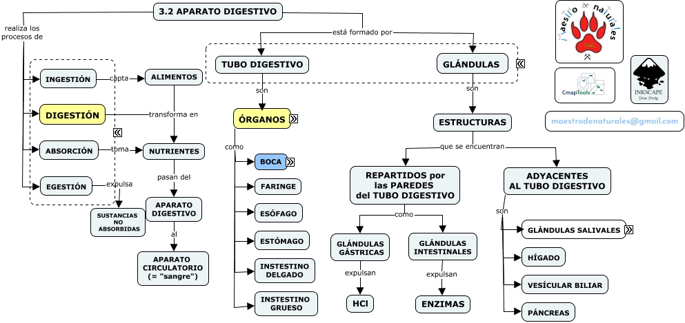 Este Cmap, tiene información relacionada con: 3.2 El aparato digestivo, NUTRIENTES pasan del APARATO DIGESTIVO, ÓRGANOS como INSTESTINO GRUESO, 3.2 APARATO DIGESTIVO realiza los procesos de DIGESTIÓN, GLÁNDULAS SALIVALES son SUBMAXILIARES, 3.2 APARATO DIGESTIVO está formado por GLÁNDULAS, ÓRGANOS como BOCA, BOCA formada por MEJILLAS, 3.2 APARATO DIGESTIVO está formado por TUBO DIGESTIVO, ÓRGANOS formado por CAPAS CONCÉNTRICAS, ABSORCIÓN toma NUTRIENTES, ESTRUCTURAS que se encuentran REPARTIDOS por las PAREDES del TUBO DIGESTIVO, 3.2 APARATO DIGESTIVO realiza los procesos de EGESTIÓN, CAPAS CONCÉNTRICAS cuyos tejidos (del interior al exterior) CAPA MUCOSA TEJIDO CONECTIVO TEJIDO MUSCULAR TEJIDO CONECTIVO TEJIDO EPITELIAL, REPARTIDOS por las PAREDES del TUBO DIGESTIVO como GLÁNDULAS INTESTINALES, BOCA formada por LABIOS, ADYACENTES AL TUBO DIGESTIVO son HÍGADO, INGESTIÓN capta ALIMENTOS, REPARTIDOS por las PAREDES del TUBO DIGESTIVO como GLÁNDULAS GÁSTRICAS, DIGESTIÓN transforma en NUTRIENTES, BOCA formada por LENGUA