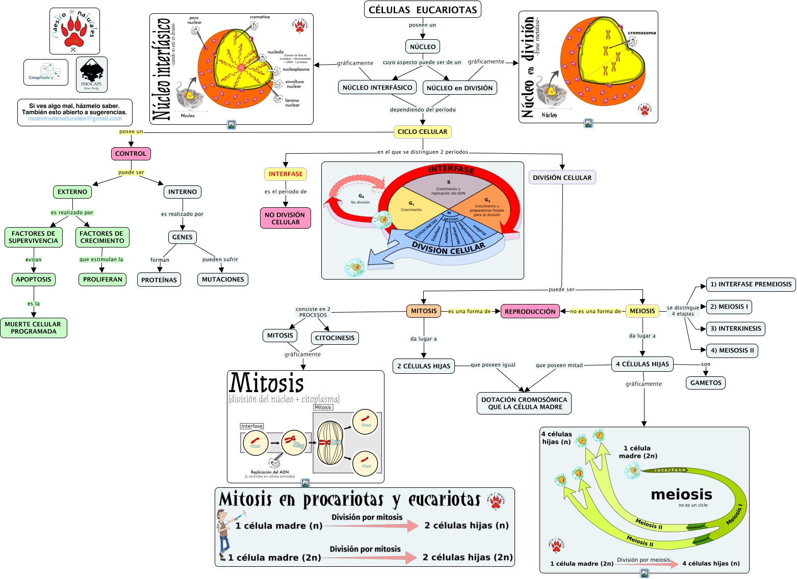 Este Cmap, tiene información relacionada con: Tema 07.01 Núcleo, 4 CÉLULAS HIJAS que poseen mitad DOTACIÓN CROMOSÓMICA QUE LA CÉLULA MADRE, 4 CÉLULAS HIJAS gráficamente, MEIOSIS no es una forma de REPRODUCCIÓN, MITOSIS da lugar a 2 CÉLULAS HIJAS, CICLO CELULAR en el que se distinguen 2 períodos DIVISIÓN CELULAR, CONTROL puede ser INTERNO, APOPTOSIS es la MUERTE CELULAR PROGRAMADA, NÚCLEO INTERFÁSICO gráficamente, NÚCLEO INTERFÁSICO dependiendo del período CICLO CELULAR, CICLO CELULAR en el que se distinguen 2 períodos INTERFASE, GENES forman PROTEÍNAS, NÚCLEO en DIVISIÓN dependiendo del período CICLO CELULAR, MEIOSIS da lugar a 4 CÉLULAS HIJAS, MITOSIS consiste en 2 PROCESOS CITOCINESIS, INTERNO es realizado por GENES, MEIOSIS se distingue 4 etapas 4) MEISOSIS II, MEIOSIS se distingue 4 etapas 2) MEIOSIS I, EXTERNO es realizado por FACTORES DE CRECIMIENTO, MITOSIS gráficamente, MITOSIS consiste en 2 PROCESOS MITOSIS