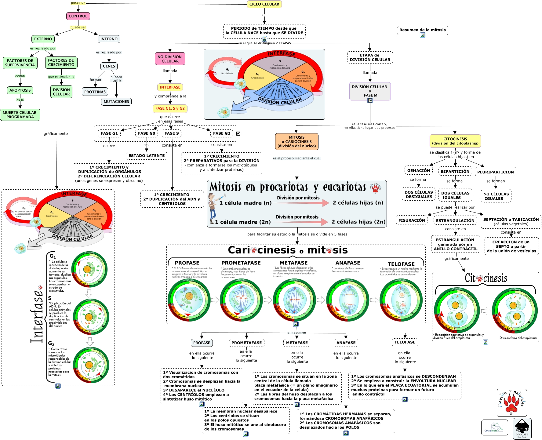 Este Cmap, tiene información relacionada con: Tema 07.04 Mitosis, INTERFASE y comprende a la FASE G1, S y G2, PLURIPARTICIÓN se forman ɮ CÉLULAS IGUALES, ETAPA de DIVISIÓN CELULAR llamada DIVISIÓN CELULAR o FASE M, FASE G1, S y G2 que ocurre en esas fases FASE S, PROFASE en ella ocurre lo siguiente 1º Visualización de cromosomas con dos cromátidas 2º Cromosomas se desplazan hacia la membrana nuclear 3º DESAPARECE el NUCLÉOLO 4º Los CENTRÍOLOS empiezan a sintetizar huso mitótico, FASE G1, S y G2 que ocurre en esas fases FASE G2, EXTERNO es realizado por FACTORES DE SUPERVIVENCIA, ANAFASE en ella ocurre lo siguiente 1º Las CROMÁTIDAS HERMANAS se separan, formándose CROMOSOMAS ANAFÁSICOS 2º Los CROMOSOMAS ANAFÁSICOS son desplazados hacia los POLOS, ???? gráficamente, en resumen PROFASE, ESTRANGULACIÓN consiste en ESTRANGULACIÓN generada por un ANILLO CONTRÁCTIL, EXTERNO es realizado por FACTORES DE CRECIMIENTO, PERIODO de TIEMPO desde que la CÉLULA NACE hasta que SE DIVIDE en el que se distinguen 2 ETAPAS NO DIVISIÓN CELULAR, INTERNO es realizado por GENES, DIVISIÓN CELULAR o FASE M es la fase más corta y, en ella, tiene lugar dos procesos CITOCINÉSIS (división del citoplasma), DOS CÉLULAS IGUALES se puede realizar por ESTRANGULACIÓN, TELOFASE en ella ocurre lo siguiente 1º Los cromosomas anafásicos se DESCONDENSAN 2º Se empieza a construir la ENVOLTURA NUCLEAR 3º En lo que era el PLACA ECUATORIAL se acumulan muchas proteínas para formar un futuro anillo contráctil, FASE G1, S y G2 que ocurre en esas fases FASE G0, FACTORES DE SUPERVIVENCIA evitan APOPTOSIS, en resumen ANAFASE
