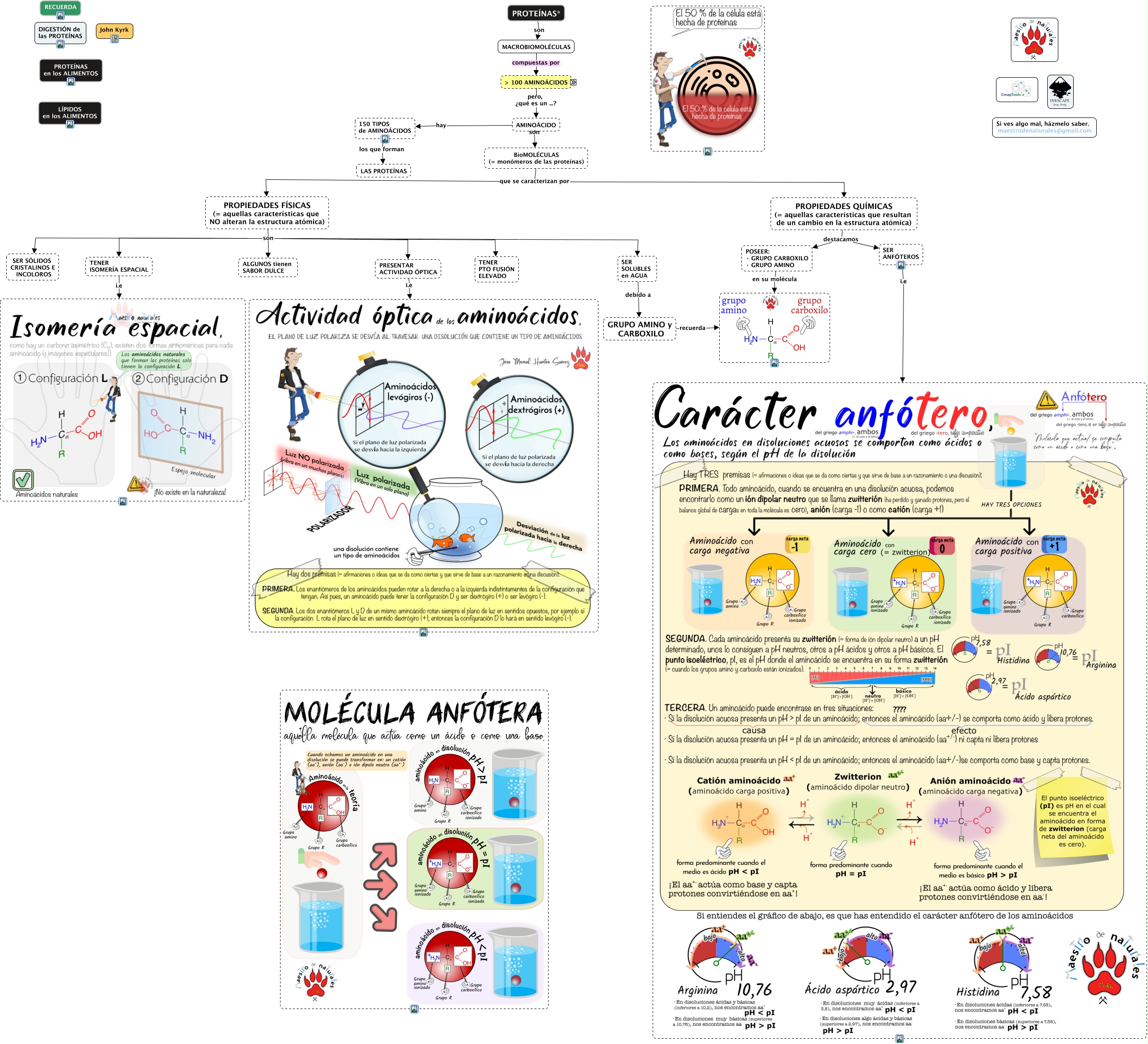 Este Cmap, tiene información relacionada con: Tema 03.02.01 Propiedades físico-químicas de los aminoácidos, PROPIEDADES FÍSICAS (= aquellas características que NO alteran la estructura atómica) son SER SÓLIDOS CRISTALINOS E INCOLOROS, HIDRÓGENO (H) en proporciones ALTAS, PROPIEDADES FÍSICAS (= aquellas características que NO alteran la estructura atómica) son PRESENTAR ACTIVIDAD ÓPTICA, MACROBIOMOLÉCULAS compuestas por > 100 AMINOÁCIDOS, PROPIEDADES FÍSICAS (= aquellas características que NO alteran la estructura atómica) son ALGUNOS tienen SABOR DULCE, PROTEÍNAS compuestas por NITRÓGENO (N), PROPIEDADES QUÍMICAS (= aquellas características que resultan de un cambio en la estructura atómica) destacamos SER ANFÓTEROS, PROPIEDADES FÍSICAS (= aquellas características que NO alteran la estructura atómica) son TENER PTO FUSIÓN ELEVADO, POSEER: · GRUPO CARBOXILO · GRUPO AMINO en su molécula, AMINOÁCIDO hay 150 TIPOS de AMINOÁCIDOS, GRUPO AMINO y CARBOXILO recuerda, NITRÓGENO (N) en proporciones BAJAS (16 %), BioMOLÉCULAS (= monómeros de las proteínas) que se caracterizan por PROPIEDADES FÍSICAS (= aquellas características que NO alteran la estructura atómica), CARBONO (C) en proporciones ALTAS, PROTEÍNAS compuestas por AZUFRE (S), PROTEÍNAS compuestas por HIDRÓGENO (H), > 100 AMINOÁCIDOS pero, ¿qué es un ...? AMINOÁCIDO, PROPIEDADES FÍSICAS (= aquellas características que NO alteran la estructura atómica) son SER SOLUBLES en AGUA, PRESENTAR ACTIVIDAD ÓPTICA i.e, PROPIEDADES QUÍMICAS (= aquellas características que resultan de un cambio en la estructura atómica) destacamos POSEER: · GRUPO CARBOXILO · GRUPO AMINO