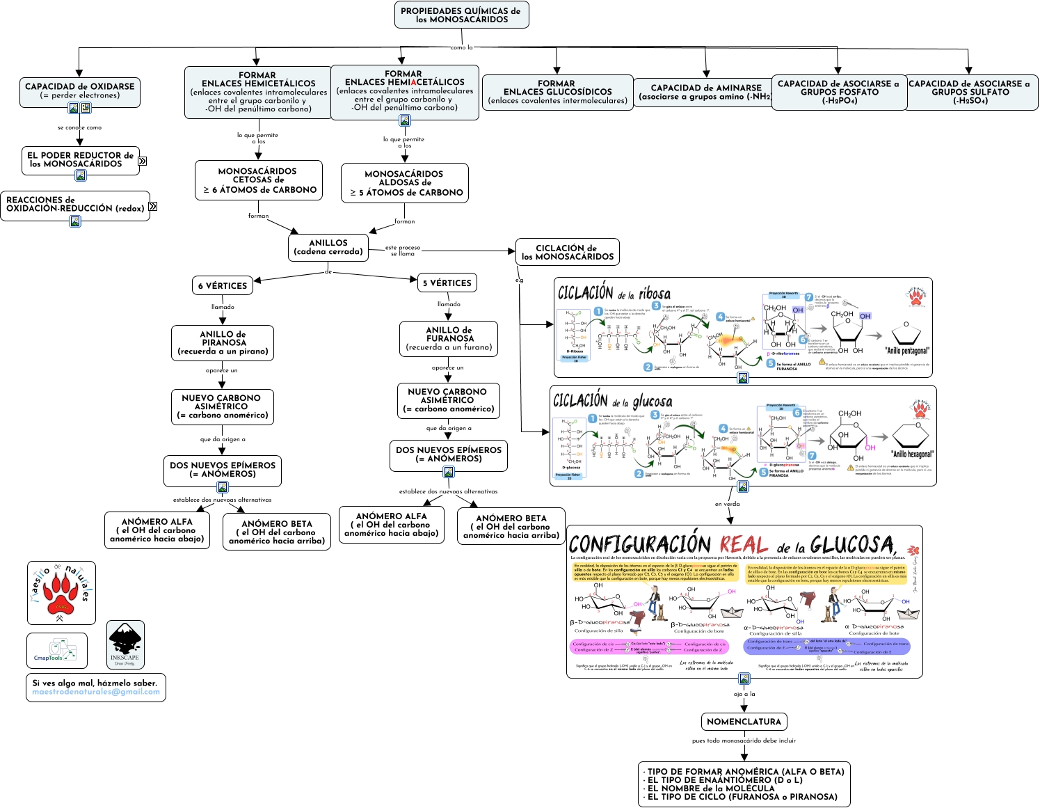 Este Cmap, tiene información relacionada con: 2.2.2 Propiedades químicas de los monosacáridos, CICLACIÓN de los MONOSACÁRIDOS e.g, OXIDACIÓN (= pérdida de electrones) significa PÉRDIDA de HIDRÓGENO -en la molécula-, PROCESO QUÍMICO que consiste en INTERCAMBIO de ELECTRONES, INTERCAMBIO de ELECTRONES hay dos maneras no excluyentes OXIDACIÓN (= pérdida de electrones), ojo a la NOMENCLATURA, PROPIEDADES QUÍMICAS de los MONOSACÁRIDOS como la CAPACIDAD de ASOCIARSE a GRUPOS FOSFATO (-H2PO4), PROPIEDADES QUÍMICAS de los MONOSACÁRIDOS como la FORMAR ENLACES HEMIACETÁLICOS (enlaces covalentes intramoleculares entre el grupo carbonilo y -OH del penúltimo carbono), PROPIEDADES QUÍMICAS de los MONOSACÁRIDOS como la CAPACIDAD de ASOCIARSE a GRUPOS SULFATO (-H2SO4), CICLACIÓN de los MONOSACÁRIDOS e.g, MONOSACÁRIDOS CETOSAS de ≥ 6 ÁTOMOS de CARBONO forman ANILLOS (cadena cerrada), CON FACILIDAD con los ALCOHOLES (-OH) formando HEMIACETALES (compuestos orgánicos con un grupo alcohol (-OH) y un grupo alcoloxi ( -OR), ANILLO de PIRANOSA (recuerda a un pirano) aparece un NUEVO CARBONO ASIMÉTRICO (= carbono anomérico), CAPACIDAD de OXIDARSE (= perder electrones) se conoce como EL PODER REDUCTOR de los MONOSACÁRIDOS, NUEVO CARBONO ASIMÉTRICO (= carbono anomérico) que da origen a DOS NUEVOS EPÍMEROS (= ANÓMEROS), 6 VÉRTICES llamado ANILLO de PIRANOSA (recuerda a un pirano), PROPIEDADES QUÍMICAS de los MONOSACÁRIDOS como la CAPACIDAD de OXIDARSE (= perder electrones), DOS NUEVOS EPÍMEROS (= ANÓMEROS) establece dos nuevoas alternativas ANÓMERO ALFA ( el OH del carbono anomérico hacia abajo), REDUCCIÓN (= ganancia de electrones) significa GANANCIA de HIDRÓGENO -en la molécula-, NOMENCLATURA pues todo monosacárido debe incluir · TIPO DE FORMAR ANOMÉRICA (ALFA O BETA) · EL TIPO DE ENAÁNTIÓMERO (D o L) · EL NOMBRE de la MOLÉCULA · EL TIPO DE CICLO (FURANOSA o PIRANOSA), PROPIEDADES QUÍMICAS de los MONOSACÁRIDOS como la CAPACIDAD de AMINARSE (asociarse a grupos amino (-NH2))
