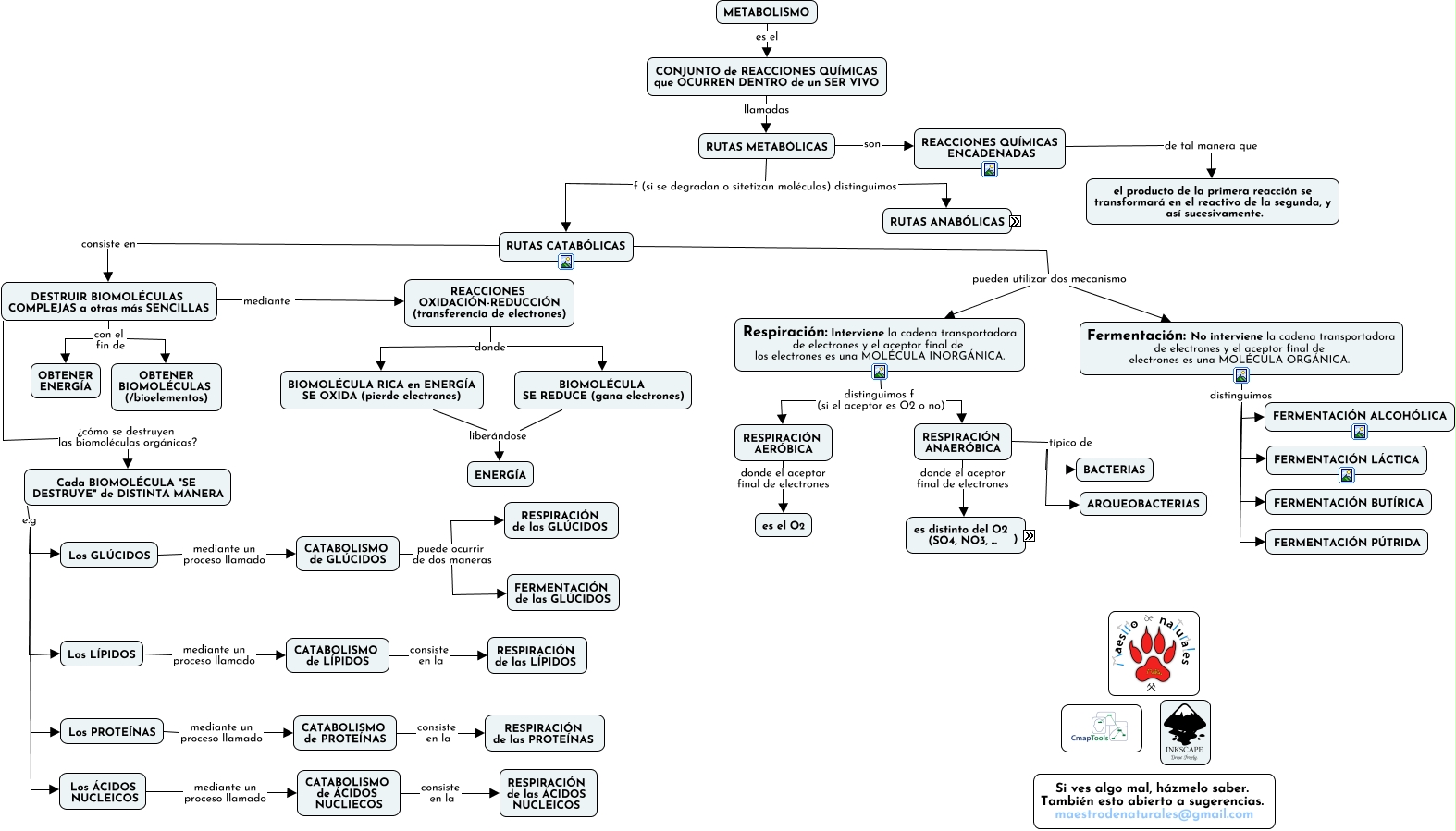 Este Cmap, tiene información relacionada con: Tema 08.02 Catabolismo, Los ÁCIDOS NUCLEICOS mediante un proceso llamado CATABOLISMO de ÁCIDOS NUCLIECOS, Los LÍPIDOS mediante un proceso llamado CATABOLISMO de LÍPIDOS, CONJUNTO de REACCIONES QUÍMICAS que OCURREN DENTRO de un SER VIVO llamadas RUTAS METABÓLICAS, RESPIRACIÓN AERÓBICA donde el aceptor final de electrones es el O2, CATABOLISMO de PROTEÍNAS consiste en la RESPIRACIÓN de las PROTEÍNAS, RUTAS METABÓLICAS f (si se degradan o sitetizan moléculas) distinguimos RUTAS ANABÓLICAS, Cada BIOMOLÉCULA "SE DESTRUYE" de DISTINTA MANERA e.g Los GLÚCIDOS, RUTAS METABÓLICAS f (si se degradan o sitetizan moléculas) distinguimos RUTAS CATABÓLICAS, Fermentación: No interviene la cadena transportadora de electrones y el aceptor final de electrones es una MOLÉCULA ORGÁNICA. distinguimos FERMENTACIÓN PÚTRIDA, RESPIRACIÓN ANAERÓBICA típico de ARQUEOBACTERIAS, Los PROTEÍNAS mediante un proceso llamado CATABOLISMO de PROTEÍNAS, DESTRUIR BIOMOLÉCULAS COMPLEJAS a otras más SENCILLAS mediante REACCIONES OXIDACIÓN-REDUCCIÓN (transferencia de electrones), CATABOLISMO de ÁCIDOS NUCLIECOS consiste en la RESPIRACIÓN de las ÁCIDOS NUCLEICOS, METABOLISMO es el CONJUNTO de REACCIONES QUÍMICAS que OCURREN DENTRO de un SER VIVO, RUTAS CATABÓLICAS consiste en DESTRUIR BIOMOLÉCULAS COMPLEJAS a otras más SENCILLAS, ANABOLISMO consiste en CONSTRUIR BIOMOLÉCULAS COMPLEJAS a partir de BIOMOLÉCULAS SENCILLAS, DESTRUIR BIOMOLÉCULAS COMPLEJAS a otras más SENCILLAS ¿cómo se destruyen las biomoléculas orgánicas? Cada BIOMOLÉCULA "SE DESTRUYE" de DISTINTA MANERA, CONSTRUIR BIOMOLÉCULAS COMPLEJAS a partir de BIOMOLÉCULAS SENCILLAS con el fin de OBTENER BIOMOLÉCULAS, Cada BIOMOLÉCULA "SE DESTRUYE" de DISTINTA MANERA e.g Los LÍPIDOS, Fermentación: No interviene la cadena transportadora de electrones y el aceptor final de electrones es una MOLÉCULA ORGÁNICA. distinguimos FERMENTACIÓN LÁCTICA