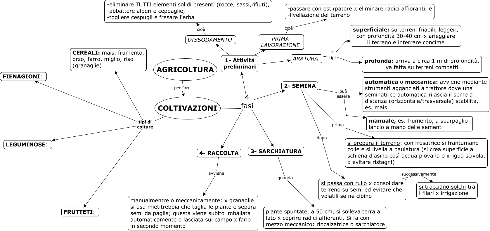 Questa Cmap, creata con IHMC CmapTools, contiene informazioni relative a: Agric_Coltivazioni, 4- RACCOLTA avviene manualmentre o meccanicamente: x granaglie si usa mietitrebbia che taglia le piante e separa semi da paglia; questa viene subito imballata automaticamente o lasciata sul campo x farlo in secondo momento, ARATURA 2 tipi superficiale: su terreni friabili, leggeri, con profondità 30-40 cm x arieggiare il terreno e interrare concime, COLTIVAZIONI 4 fasi 2- SEMINA, COLTIVAZIONI tipi di colture LEGUMINOSE:, 2- SEMINA dopo si passa con rullo x consolidare terreno su semi ed evitare che volatili se ne cibino, 2- SEMINA prima si prepara il terreno: con fresatrice si frantumano zolle e si livella a baulatura (si crea superficie a schiena d'asino così acqua piovana o irrigua scivola, x evitare ristagni), si passa con rullo x consolidare terreno su semi ed evitare che volatili se ne cibino successivamente si tracciano solchi tra i filari x irrigazione, COLTIVAZIONI tipi di colture FIENAGIONI:, PRIMA LAVORAZIONE cioè -passare con estirpatore x eliminare radici affioranti, e -livellazione del terreno, 2- SEMINA può essere manuale, es. frumento, a sparpaglio: lancio a mano delle sementi, 1- Attività preliminari ???? PRIMA LAVORAZIONE, 2- SEMINA può essere automatica o meccanica: avviene mediante strumenti agganciati a trattore dove una seminatrice automatica rilascia il seme a distanza (orizzontale/trasversale) stabilita, es. mais, COLTIVAZIONI tipi di colture FRUTTETI:, 1- Attività preliminari ???? DISSODAMENTO, 3- SARCHIATURA quando piante spuntate, a 50 cm, si solleva terra a lato x coprire radici affioranti. Si fa con mezzo meccanico: rincalzatrice o sarchiatore, ARATURA 2 tipi profonda: arriva a circa 1 m di profondità, va fatta su terreni compatti, COLTIVAZIONI tipi di colture CEREALI: mais, frumento, orzo, farro, miglio, riso (granaglie), DISSODAMENTO cioè -eliminare TUTTI elementi solidi presenti (rocce, sassi,rifiuti), -abbattere alberi e ceppaglie, -togliere cespugli e fresare l'erba, 1- Attività preliminari ???? ARATURA, COLTIVAZIONI 4 fasi 1- Attività preliminari