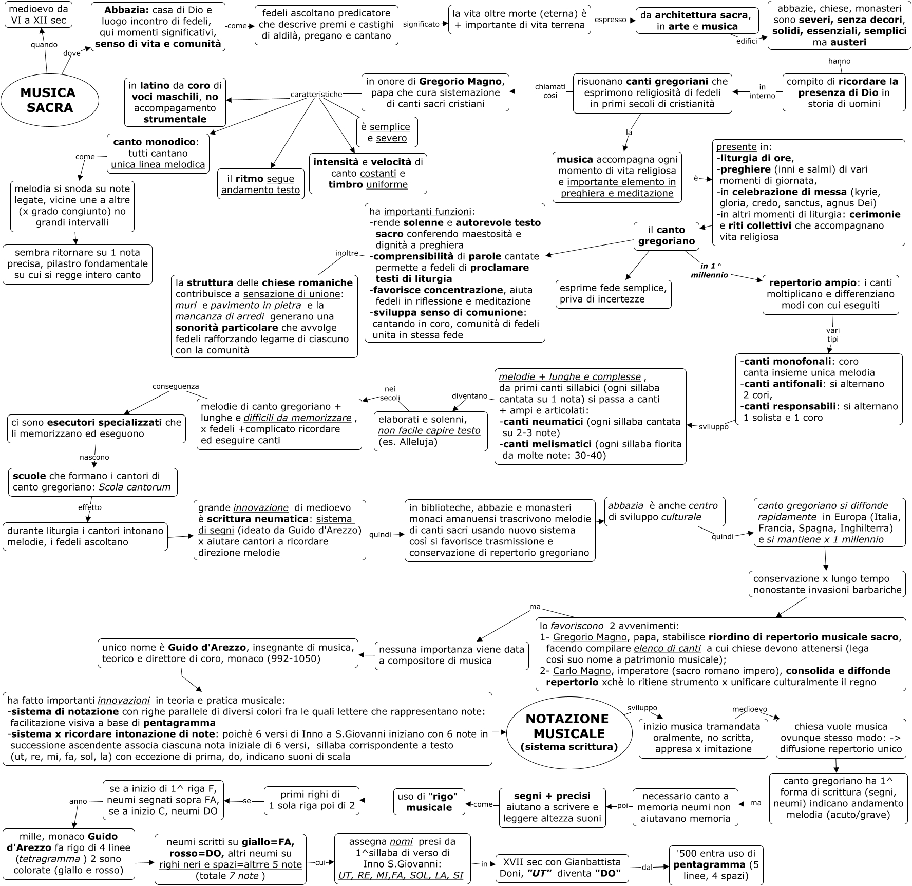 Questa Cmap, creata con IHMC CmapTools, contiene informazioni relative a: Musica Sacra_Notazione, ha fatto importanti innovazioni in teoria e pratica musicale: -sistema di notazione con righe parallele di diversi colori fra le quali lettere che rappresentano note: facilitazione visiva a base di pentagramma -sistema x ricordare intonazione di note: poichè 6 versi di Inno a S.Giovanni iniziano con 6 note in successione ascendente associa ciascuna nota iniziale di 6 versi, sillaba corrispondente a testo (ut, re, mi, fa, sol, la) con eccezione di prima, do, indicano suoni di scala ???? NOTAZIONE MUSICALE (sistema scrittura), compito di ricordare la presenza di Dio in storia di uomini in interno risuonano canti gregoriani che esprimono religiosità di fedeli in primi secoli di cristianità, inizio musica tramandata oralmente, no scritta, appresa x imitazione medioevo chiesa vuole musica ovunque stesso modo: -> diffusione repertorio unico, necessario canto a memoria neumi non aiutavano memoria poi segni + precisi aiutano a scrivere e leggere altezza suoni, durante liturgia i cantori intonano melodie, i fedeli ascoltano ???? grande innovazione di medioevo è scrittura neumatica: sistema di segni (ideato da Guido d'Arezzo) x aiutare cantori a ricordare direzione melodie, grande innovazione di medioevo è scrittura neumatica: sistema di segni (ideato da Guido d'Arezzo) x aiutare cantori a ricordare direzione melodie quindi in biblioteche, abbazie e monasteri monaci amanuensi trascrivono melodie di canti sacri usando nuovo sistema così si favorisce trasmissione e conservazione di repertorio gregoriano, assegna nomi presi da 1^sillaba di verso di Inno S.Giovanni: UT, RE, MI,FA, SOL, LA, SI in XVII sec con Gianbattista Doni, "UT" diventa "DO", unico nome è Guido d'Arezzo, insegnante di musica, teorico e direttore di coro, monaco (992-1050) ???? ha fatto importanti innovazioni in teoria e pratica musicale: -sistema di notazione con righe parallele di diversi colori fra le quali lettere che rappresentano note: facilitazione visiva a base di pentagramma -sistema x ricordare intonazione di note: poichè 6 versi di Inno a S.Giovanni iniziano con 6 note in successione ascendente associa ciascuna nota iniziale di 6 versi, sillaba corrispondente a testo (ut, re, mi, fa, sol, la) con eccezione di prima, do, indicano suoni di scala, segni + precisi aiutano a scrivere e leggere altezza suoni come uso di "rigo" musicale, musica accompagna ogni momento di vita religiosa e importante elemento in preghiera e meditazione è presente in: -liturgia di ore, -preghiere (inni e salmi) di vari momenti di giornata, -in celebrazione di messa (kyrie, gloria, credo, sanctus, agnus Dei) -in altri momenti di liturgia: cerimonie e riti collettivi che accompagnano vita religiosa, risuonano canti gregoriani che esprimono religiosità di fedeli in primi secoli di cristianità chiamati così in onore di Gregorio Magno, papa che cura sistemazione di canti sacri cristiani, uso di "rigo" musicale ???? primi righi di 1 sola riga poi di 2, canto gregoriano ha 1^ forma di scrittura (segni, neumi) indicano andamento melodia (acuto/grave) ma necessario canto a memoria neumi non aiutavano memoria, ha importanti funzioni: -rende solenne e autorevole testo sacro conferendo maestosità e dignità a preghiera -comprensibilità di parole cantate permette a fedeli di proclamare testi di liturgia -favorisce concentrazione, aiuta fedeli in riflessione e meditazione -sviluppa senso di comunione: cantando in coro, comunità di fedeli unita in stessa fede inoltre la struttura delle chiese romaniche contribuisce a sensazione di unione: muri e pavimento in pietra e la mancanza di arredi generano una sonorità particolare che avvolge fedeli rafforzando legame di ciascuno con la comunità, neumi scritti su giallo=FA, rosso=DO, altri neumi su righi neri e spazi=altrre 5 note (totale 7 note) cui assegna nomi presi da 1^sillaba di verso di Inno S.Giovanni: UT, RE, MI,FA, SOL, LA, SI, mille, monaco Guido d'Arezzo fa rigo di 4 linee (tetragramma) 2 sono colorate (giallo e rosso) ???? neumi scritti su giallo=FA, rosso=DO, altri neumi su righi neri e spazi=altrre 5 note (totale 7 note), il canto gregoriano ???? esprime fede semplice, priva di incertezze, XVII sec con Gianbattista Doni, "UT" diventa "DO" dal '500 entra uso di pentagramma (5 linee, 4 spazi), risuonano canti gregoriani che esprimono religiosità di fedeli in primi secoli di cristianità la musica accompagna ogni momento di vita religiosa e importante elemento in preghiera e meditazione, il canto gregoriano in 1° millennio repertorio ampio: i canti moltiplicano e differenziano modi con cui eseguiti