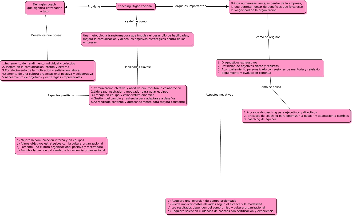 Este Cmap, tiene información relacionada con: Mapa conceptual, Brinda numerosas ventajas dentro de la empresa, lo que permiten gozar de beneficios que fortalecen la longevidad de la organizacion. como se origino: 1. Diagnosticos exhaustivos 2. Definicion de objetivos claros y realistas 3. Acompañamiento personalizado con sesiones de mentoria y refelexion 4. Seguimiento y evaluacion continua, 1.Comunicacion efectiva y asertiva que facilitan la colaboracion 2.Liderazgo inspirador y motivador para guiar equipos 3.Trabajo en equipo y colaborativo dinamico 4.Gestion del cambio y resilencia para adaptarse a desafios 5.Aprendizaje continuo y autoconocimento para mejora constante Aspectos positivos a) Mejora la comunicacion interna y en equipos b) Alinea objetivos estrategicos con la cultura organizacional c) Fomenta una cultura organizacional positiva y motivadora d) Impulsa la gestion del cambio y la resilencia organizacional, Coaching Organizacional se define como: Una metodologia transformadora que impulsa el desarrollo de habilidades, mejora la comunicacion y alinea los objetivos estraregicos dentro de las empresas., Coaching Organizacional ¿Porque es importante? Brinda numerosas ventajas dentro de la empresa, lo que permiten gozar de beneficios que fortalecen la longevidad de la organizacion., Coaching Organizacional Proviene Del ingles coach que significa entrenador o tutor, Una metodologia transformadora que impulsa el desarrollo de habilidades, mejora la comunicacion y alinea los objetivos estraregicos dentro de las empresas. Habilidades claves: 1.Comunicacion efectiva y asertiva que facilitan la colaboracion 2.Liderazgo inspirador y motivador para guiar equipos 3.Trabajo en equipo y colaborativo dinamico 4.Gestion del cambio y resilencia para adaptarse a desafios 5.Aprendizaje continuo y autoconocimento para mejora constante, Del ingles coach que significa entrenador o tutor Beneficios que posee: 1.Incremento del rendimiento individual y colectivo 2. Mejora en la comunicacion interna y externa 3.Fortalecimiento de la motivacion y satisfacion laboral 4.Fomento de una cultura organizacional positiva y colaborativa 5.Alineamiento de objetivos y estrategias empresariales, 1. Diagnosticos exhaustivos 2. Definicion de objetivos claros y realistas 3. Acompañamiento personalizado con sesiones de mentoria y refelexion 4. Seguimiento y evaluacion continua Como se aplica 1.Procesos de coaching para ejecutivos y directivos 2. procesos de coaching para optimizar la gestion y adaptacion a cambios 3. coaching de equipos, 1.Comunicacion efectiva y asertiva que facilitan la colaboracion 2.Liderazgo inspirador y motivador para guiar equipos 3.Trabajo en equipo y colaborativo dinamico 4.Gestion del cambio y resilencia para adaptarse a desafios 5.Aprendizaje continuo y autoconocimento para mejora constante Aspectos negativos a) Requiere una inversion de tiempo prolongado b) Puede implicar costos elevados segun el alcance y la modalidad c) Los resultados dependen del compromiso y cultura organizacional d) Requiere seleccion cuidadosa de coaches con certificacion y experiencia