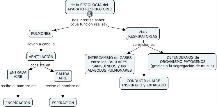 Este Cmap, tiene información relacionada con: 4.03.01 Fisiología del aparato respiratorio, ENTRADA AIRE recibe el nombre de INSPIRACIÓN, VENTILACIÓN consiste en SALIDA AIRE, de la FISIOLOGÍA del APARATO RESPIRATORIO nos interesa saber ¿qué función realiza? VÍAS RESPIRATORIAS, VÍAS RESPIRATORIAS su misión es DEFENDERNOS de ORGANISMO PATÓGENOS (gracias a la segregación de mucus), VÍAS RESPIRATORIAS su misión es INTERCAMBIO de GASES entre los CAPILARES SANGUÍNEOS y los ALVEÓLOS PULMONARES, SALIDA AIRE recibe el nombre de ESPIRACIÓN, VENTILACIÓN consiste en ENTRADA AIRE, VÍAS RESPIRATORIAS su misión es CONDUCIR el AIRE INSPIRADO y EXHALADO, PULMONES llevan a cabo la VENTILACIÓN, de la FISIOLOGÍA del APARATO RESPIRATORIO nos interesa saber ¿qué función realiza? PULMONES