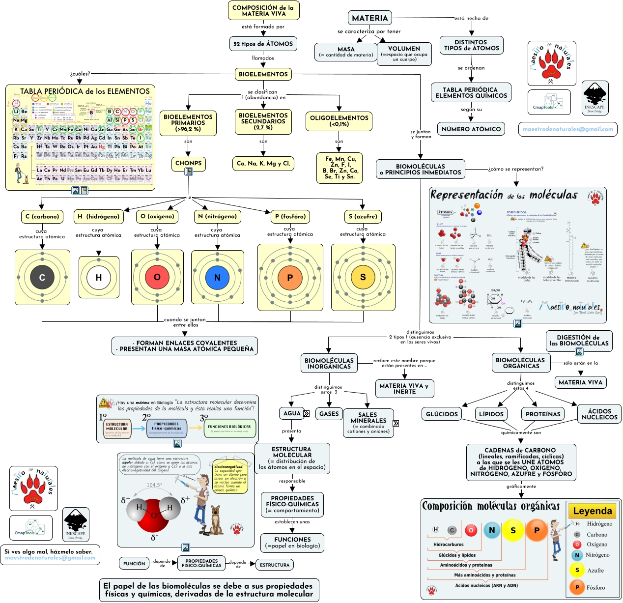 Este Cmap, tiene información relacionada con: Tema 03.02.00 Nivel atómico y molecular, TABLA PERIÓDICA ELEMENTOS QUÍMICOS según su NÚMERO ATÓMICO, CHONPS i.e H (hidrógeno), cuando se juntan entre ellos - FORMAN ENLACES COVALENTES - PRESENTAN UNA MASA ATÓMICA PEQUEÑA, BIOMOLÉCULAS o PRINCIPIOS INMEDIATOS ¿cómo se representan?, OLIGOELEMENTOS (ɘ,1%) son Fe, Mn, Cu, Zn, F, I, B, Br, Zn, Co, Se, Ti y Sn., BIOMOLÉCULAS INORGÁNICAS distinguimos estos 3 GASES, ESTADO SÓLIDO (= precipitadas) e.g ESQUELETO VERTEBRADOS Ca3(PO4)2, CHONPS i.e P (fosfóro), CHONPS i.e N (nitrógeno), COMPOSICIÓN de la MATERIA VIVA está formada por 52 tipos de ÁTOMOS, CADENAS de CARBONO (lineales, ramificadas, cíclicas) a las que se les UNE ÁTOMOS de HIDRÓGENO, OXÍGENO, NITRÓGENO, AZUFRE y FÓSFORO gráficamente, BIOMOLÉCULAS ORGÁNICAS distinguimos estos 4 GLÚCIDOS, BIOMOLÉCULAS o PRINCIPIOS INMEDIATOS distinguimos 2 tipos f (ausencia exclusiva en los seres vivos) BIOMOLÉCULAS ORGÁNICAS, CHONPS i.e S (azufre), BIOELEMENTOS PRIMARIOS (ᢘ,2 %) son CHONPS, BIOMOLÉCULAS ORGÁNICAS distinguimos estos 4 LÍPIDOS, BIOMOLÉCULAS ORGÁNICAS distinguimos estos 4 ÁCIDOS NUCLEICOS, BIOELEMENTOS se clasifican f (abundancia) en BIOELEMENTOS PRIMARIOS (ᢘ,2 %), PROPIEDADES FISICO-QUÍMICAS depende de ESTRUCTURA, BIOELEMENTOS ¿cuáles?