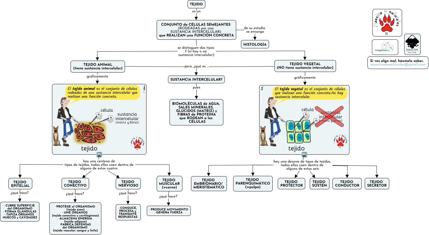 Este Cmap, tiene información relacionada con: Tema 03.04.00 Nivel tisular, hay una centena de tipos de tejidos, todos ellos caen dentro de alguno de estos cuatro: TEJIDO MUSCULAR (=carne), hay una decena de tipos de tejidos, todos ellos caen dentro de alguno de estos seis: TEJIDO PARENQUIMÁTICO (=pulpa), hay una centena de tipos de tejidos, todos ellos caen dentro de alguno de estos cuatro: TEJIDO CONECTIVO, hay una decena de tipos de tejidos, todos ellos caen dentro de alguno de estos seis: TEJIDO EMBRIONARIO/ MERISTEMÁTICO, TEJIDO ANIMAL (tiene sustancia intercelular) pero, ¿qué es ... SUSTANCIA INTERCELULAR?, TEJIDO VEGETAL (NO tiene sustancia intercelular) gráficamente, TEJIDO es un CONJUNTO de CÉLULAS SEMEJANTES (RODEADAS por una SUSTANCIA INTERCELULAR) que REALIZAN una FUNCIÓN CONCRETA, hay una decena de tipos de tejidos, todos ellos caen dentro de alguno de estos seis: TEJIDO SECRETOR, CONJUNTO de CÉLULAS SEMEJANTES (RODEADAS por una SUSTANCIA INTERCELULAR) que REALIZAN una FUNCIÓN CONCRETA se distinguen dos tipos f (si hay o no sustancia intercelular): TEJIDO VEGETAL (NO tiene sustancia intercelular), TEJIDO ANIMAL (tiene sustancia intercelular) gráficamente, SUSTANCIA INTERCELULAR? pues BIOMOLÉCULAS de AGUA, SALES MINERALES, GLÚCIDOS (MATRIZ) y FIBRAS de PROTEÍNA que RODEAN a las CÉLULAS, CONJUNTO de CÉLULAS SEMEJANTES (RODEADAS por una SUSTANCIA INTERCELULAR) que REALIZAN una FUNCIÓN CONCRETA de su estudio se encarga HISTOLOGÍA, hay una decena de tipos de tejidos, todos ellos caen dentro de alguno de estos seis: TEJIDO PROTECTOR, TEJIDO CONECTIVO ¿qué hace? · PROTEGE al ORGANISMO (tejido óseo) · UNE ÓRGANOS (tejido conectivo y cartilaginoso) · ALMACENA ENERGÍA (tejido adiposo) ·FABRICA DEFENSAS del ORGANISMO (tejido vascular: sangre y linfa), TEJIDO MUSCULAR (=carne) ¿qué hace? · PRODUCE MOVIMIENTO · GENERA FUERZA, hay una decena de tipos de tejidos, todos ellos caen dentro de alguno de estos seis: TEJIDO CONDUCTOR, TEJIDO VEGETAL (NO tiene sustancia intercelular) pero, ¿qué es ... SUSTANCIA INTERCELULAR?, CONJUNTO de CÉLULAS SEMEJANTES (RODEADAS por una SUSTANCIA INTERCELULAR) que REALIZAN una FUNCIÓN CONCRETA se distinguen dos tipos f (si hay o no sustancia intercelular): TEJIDO ANIMAL (tiene sustancia intercelular), hay una centena de tipos de tejidos, todos ellos caen dentro de alguno de estos cuatro: TEJIDO EPITELIAL, hay una centena de tipos de tejidos, todos ellos caen dentro de alguno de estos cuatro: TEJIDO NERVIOSO