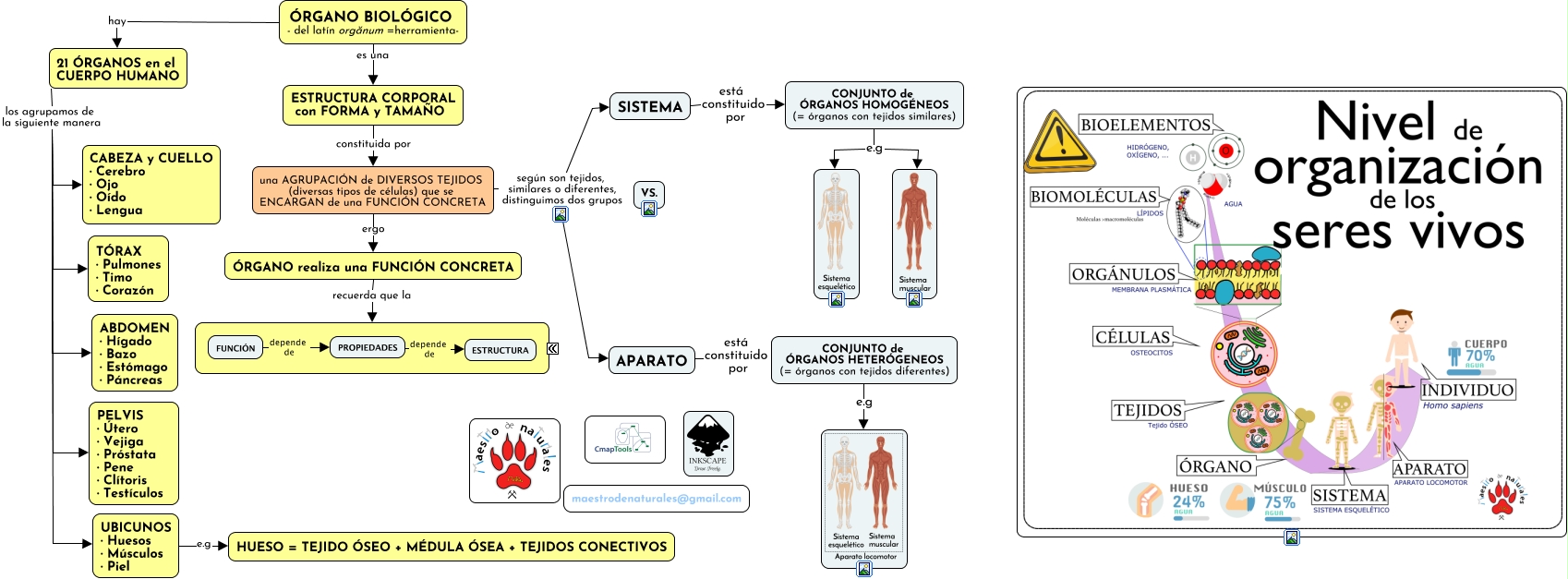 Este Cmap, tiene información relacionada con: Tema 03.05 Órganos, aparatos y sistemas, 21 ÓRGANOS en el CUERPO HUMANO los agrupamos de la siguiente manera UBICUNOS · Huesos · Músculos · Piel, PROPIEDADES depende de ESTRUCTURA, APARATO está constituido por CONJUNTO de ÓRGANOS HETERÓGENEOS (= órganos con tejidos diferentes), SISTEMA está constituido por CONJUNTO de ÓRGANOS HOMOGÉNEOS (= órganos con tejidos similares), FUNCIÓN depende de PROPIEDADES, 21 ÓRGANOS en el CUERPO HUMANO los agrupamos de la siguiente manera TÓRAX · Pulmones · Timo · Corazón, una AGRUPACIÓN de DIVERSOS TEJIDOS (diversas tipos de células) que se ENCARGAN de una FUNCIÓN CONCRETA ergo ÓRGANO realiza una FUNCIÓN CONCRETA, una AGRUPACIÓN de DIVERSOS TEJIDOS (diversas tipos de células) que se ENCARGAN de una FUNCIÓN CONCRETA según son tejidos, similares o diferentes, distinguimos dos grupos SISTEMA, 21 ÓRGANOS en el CUERPO HUMANO los agrupamos de la siguiente manera PELVIS · Útero · Vejiga · Próstata · Pene · Clítoris · Testículos, UBICUNOS · Huesos · Músculos · Piel e.g HUESO = TEJIDO ÓSEO + MÉDULA ÓSEA + TEJIDOS CONECTIVOS, 21 ÓRGANOS en el CUERPO HUMANO los agrupamos de la siguiente manera CABEZA y CUELLO · Cerebro · Ojo · Oído · Lengua, ÓRGANO realiza una FUNCIÓN CONCRETA recuerda que la ANATOMÍA del ÓRGANO determina su FUNCIÓN, ESTRUCTURA CORPORAL con FORMA y TAMAÑO constituida por una AGRUPACIÓN de DIVERSOS TEJIDOS (diversas tipos de células) que se ENCARGAN de una FUNCIÓN CONCRETA, CONJUNTO de ÓRGANOS HOMOGÉNEOS (= órganos con tejidos similares) e.g, una AGRUPACIÓN de DIVERSOS TEJIDOS (diversas tipos de células) que se ENCARGAN de una FUNCIÓN CONCRETA según son tejidos, similares o diferentes, distinguimos dos grupos APARATO, ÓRGANO BIOLÓGICO - del latín orgănum =herramienta- hay 21 ÓRGANOS en el CUERPO HUMANO, CONJUNTO de ÓRGANOS HETERÓGENEOS (= órganos con tejidos diferentes) e.g, CONJUNTO de ÓRGANOS HOMOGÉNEOS (= órganos con tejidos similares) e.g, 21 ÓRGANOS en el CUERPO HUMANO los agrupamos de la siguiente manera ABDOMEN · Hígado · Bazo · Estómago · Páncreas, ÓRGANO BIOLÓGICO - del latín orgănum =herramienta- es una ESTRUCTURA CORPORAL con FORMA y TAMAÑO